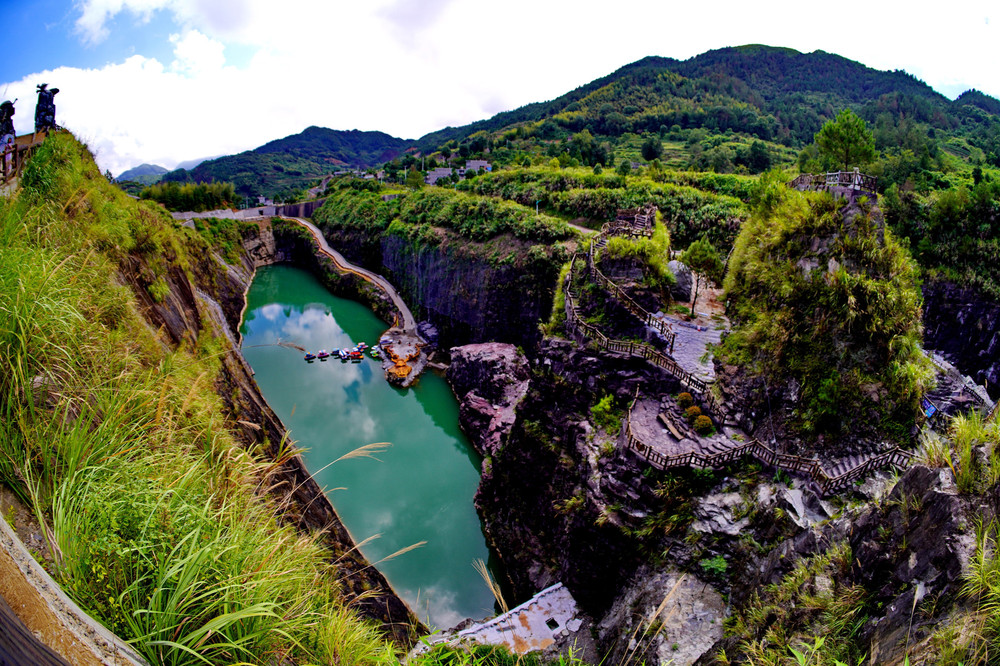 南龙湾峡谷全长1314米,由三湖三岛组成:龙龟湖、璇靥湖,飞天湖;神龟岩,佛光岩,聚仙岩,是浙江唯一因采矿遗留的人工水道。