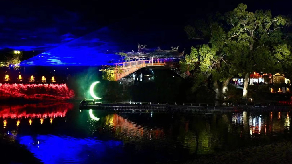 如今在廊桥文化园,增设了廊桥灯光秀,夜景也很美。