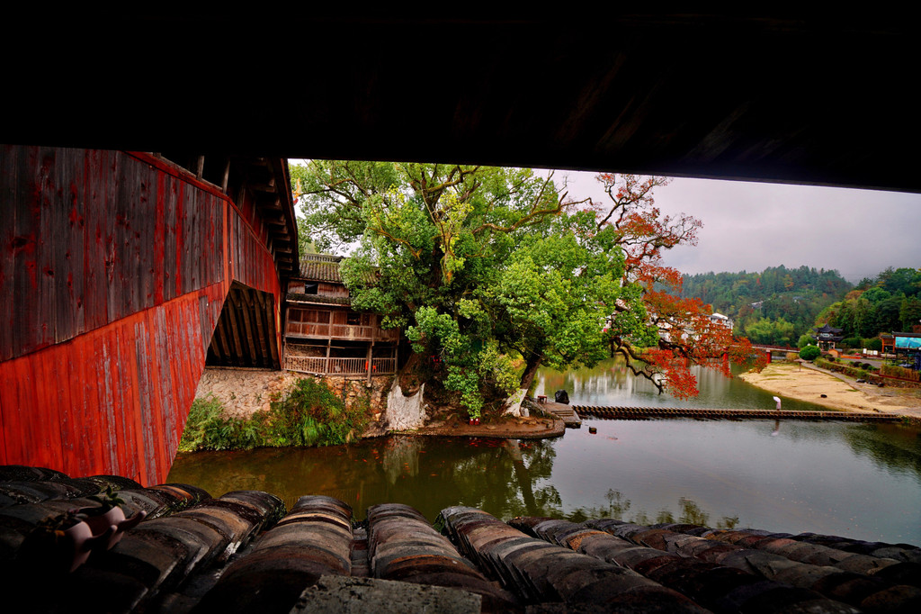 我最喜欢秋天的北涧桥,东桥头的两棵千年古树迎来最美时,叶子在秋风里一天天变化,1200年的樟树与1000年的乌桕树,一红一绿,羡煞了你我。