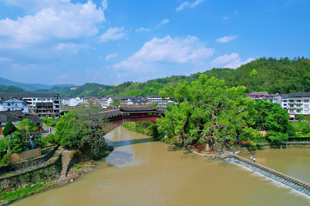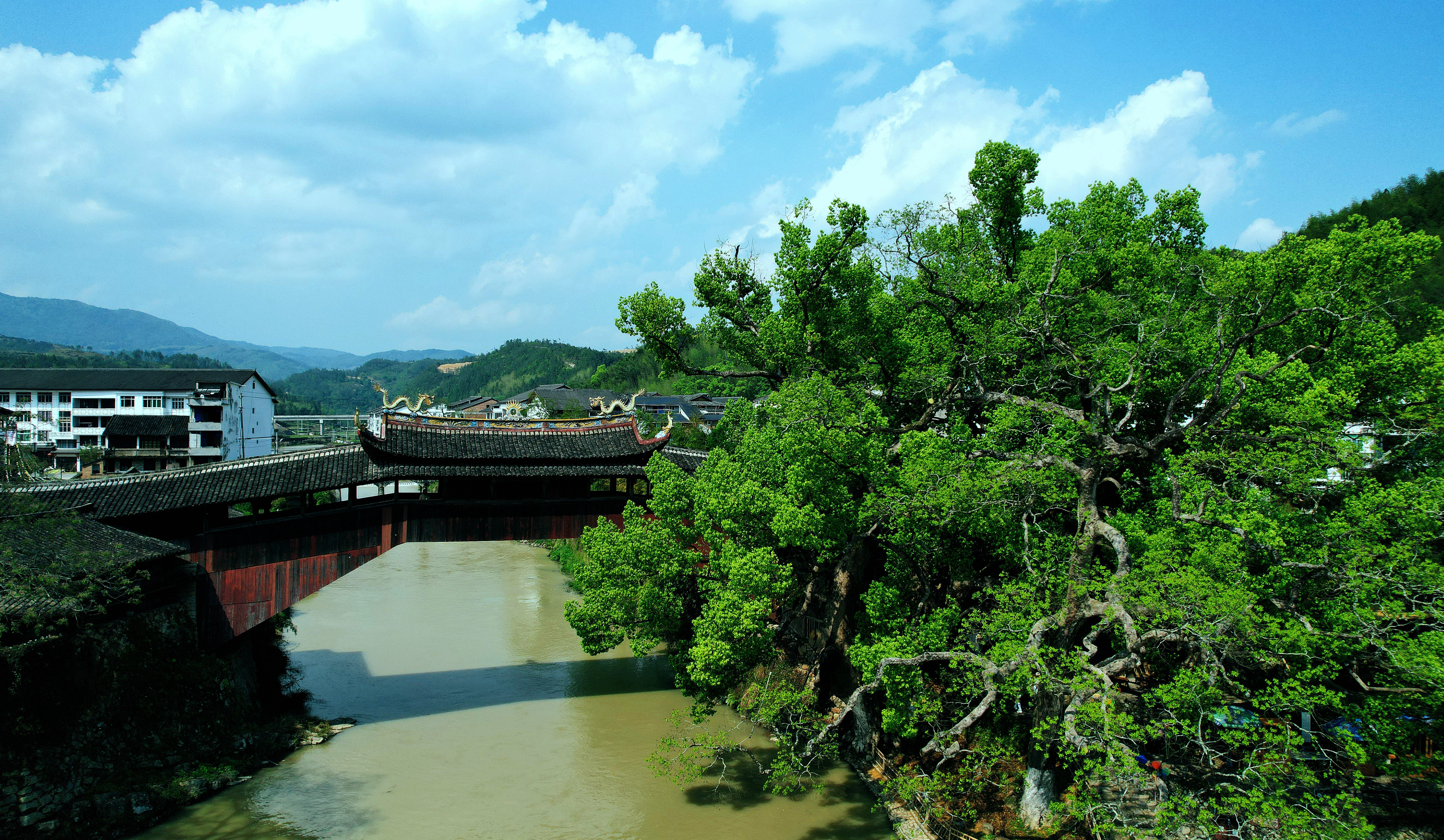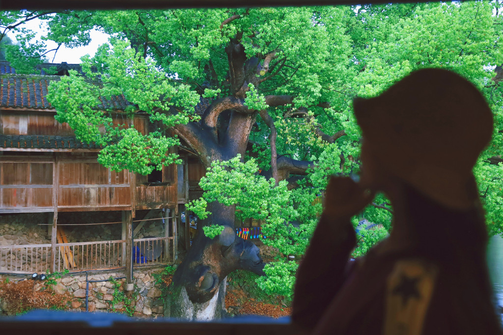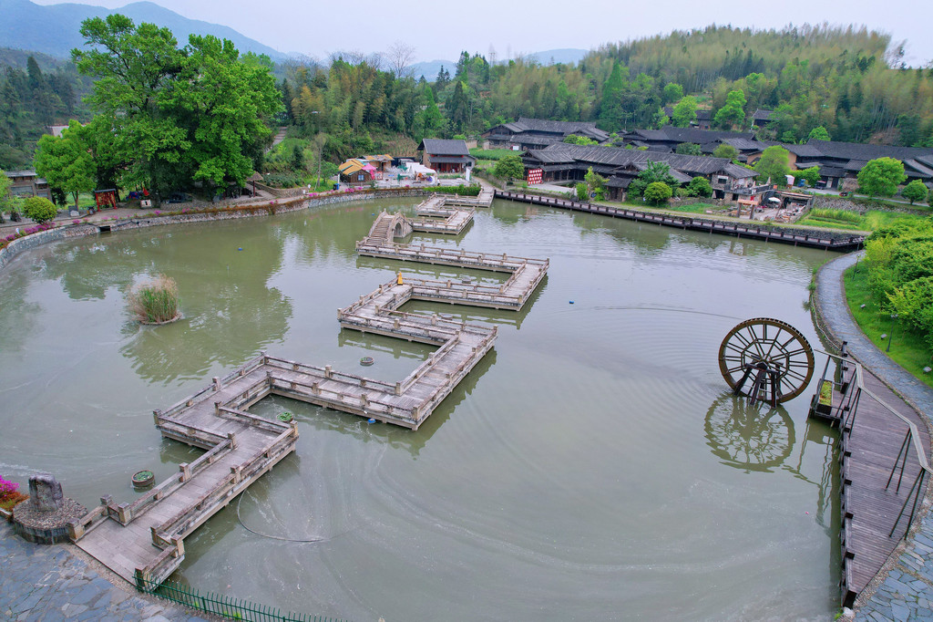 我们总以过客的方式行走,在流淌中寻觅一份随遇而安,站在塔头底古村落村前长长的木廊上,是观赏全村的最佳位置,眼前古树宛如云盖,九曲桥下水面如镜,有身着古衣的女孩们正在九曲回环中步步生花,与历史来一段对语。水车茶田错落分布,更远处是保存完好的古老民居。