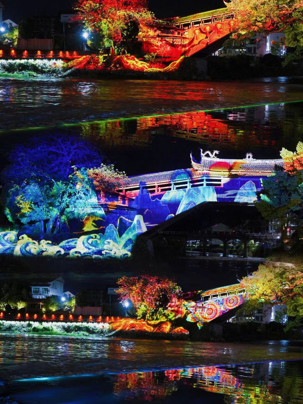 夜幕降临,廊桥的灯光秀更是不容错过。灯光在廊桥和水面上交织出五彩斑斓的图案,美轮美奂,为这座古老的建筑披上了现代的华服,带来一场视觉的盛宴,让人流连忘返。