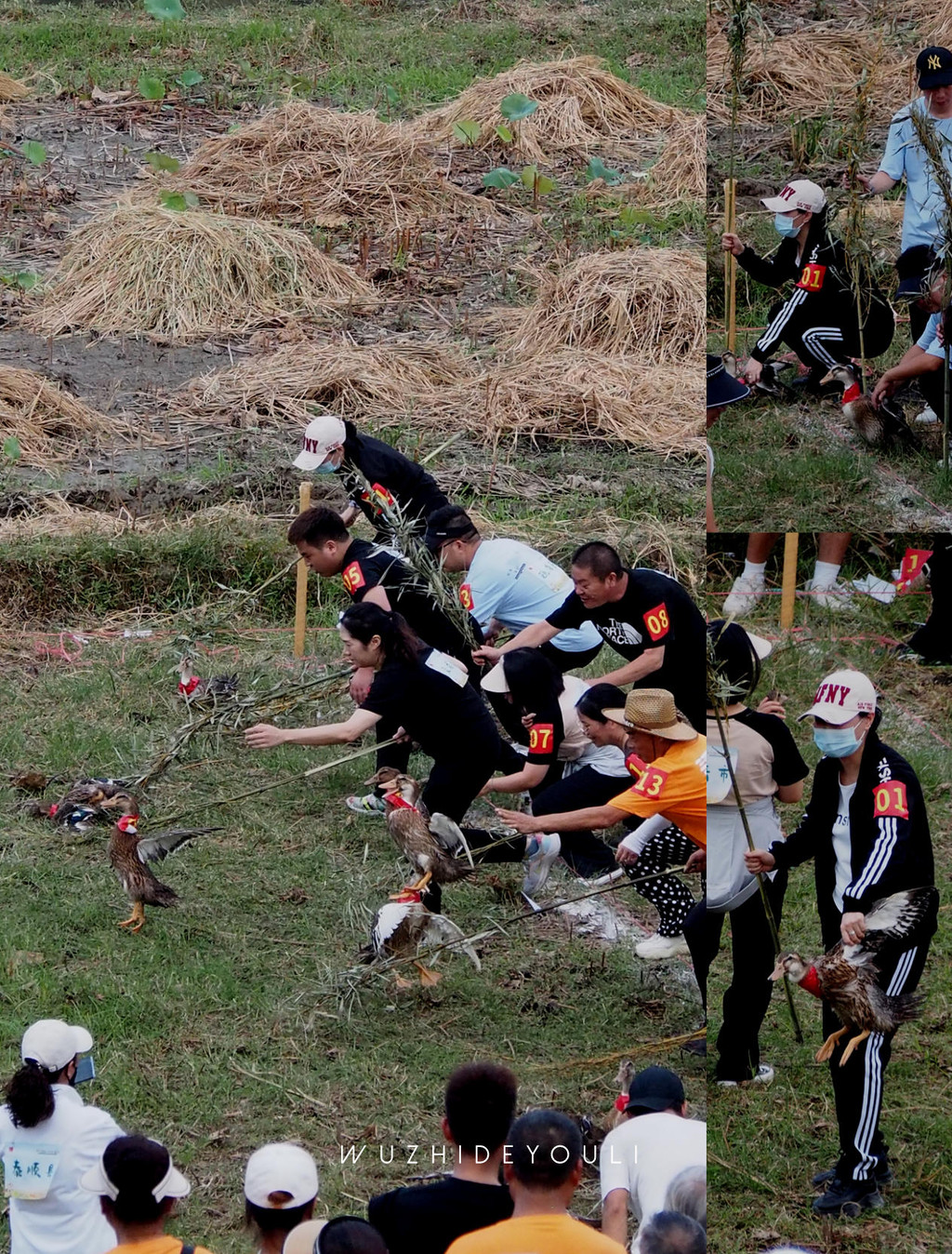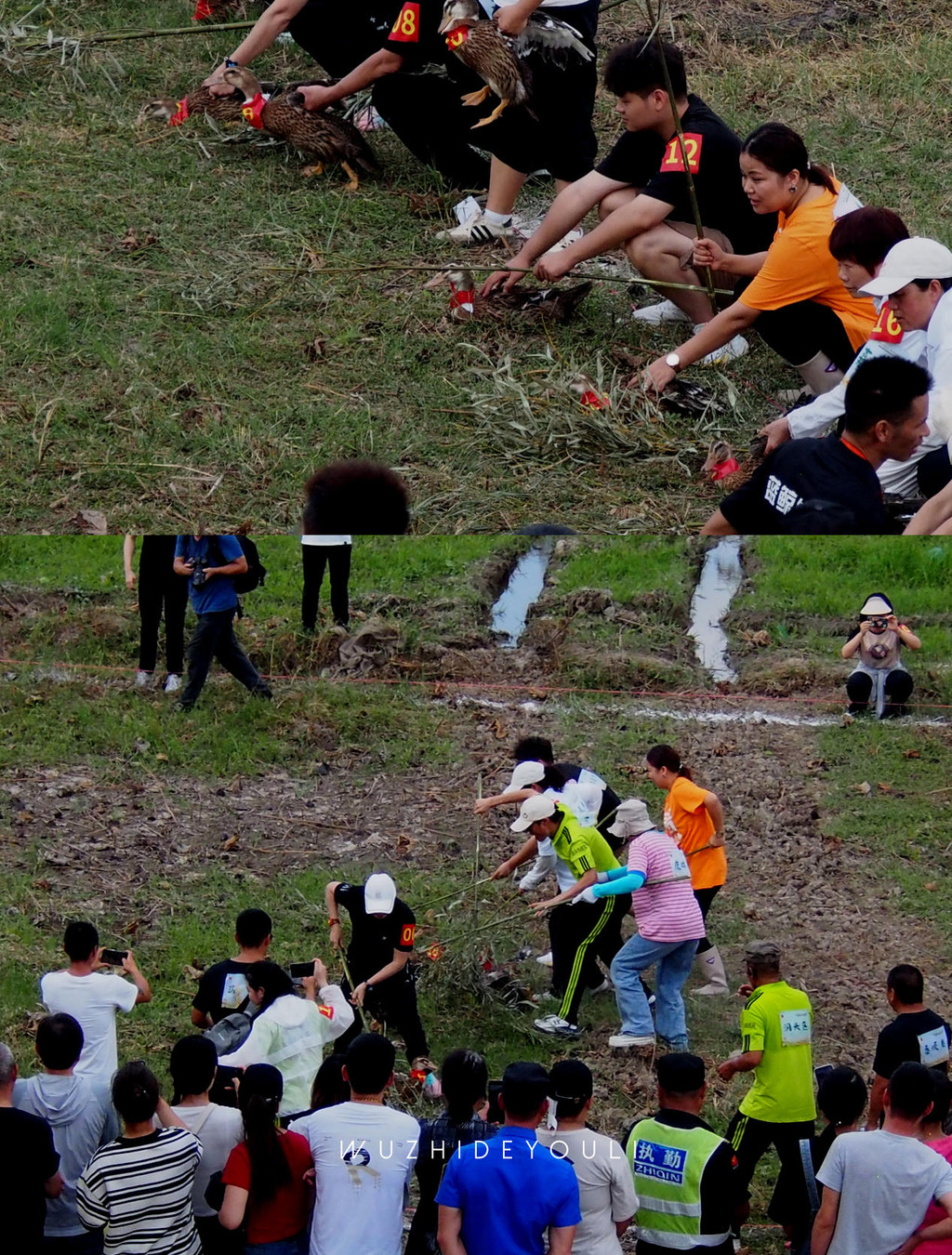 最逗的是抓鸭子比赛。刚把一群嘎嘎叫的鸭子赶进麦田,选手们手忙脚乱的赶鸭子走直线,鸭子们吓得扑腾着翅膀四处乱窜,根本不听指挥,惹得田边笑成一片。我举着相机追着拍,笑得手都抖了,镜头里的画面糊成一团,却把那股子疯玩的快乐全收了进去。