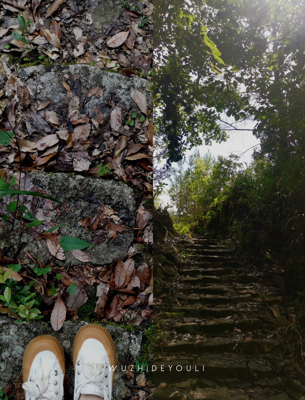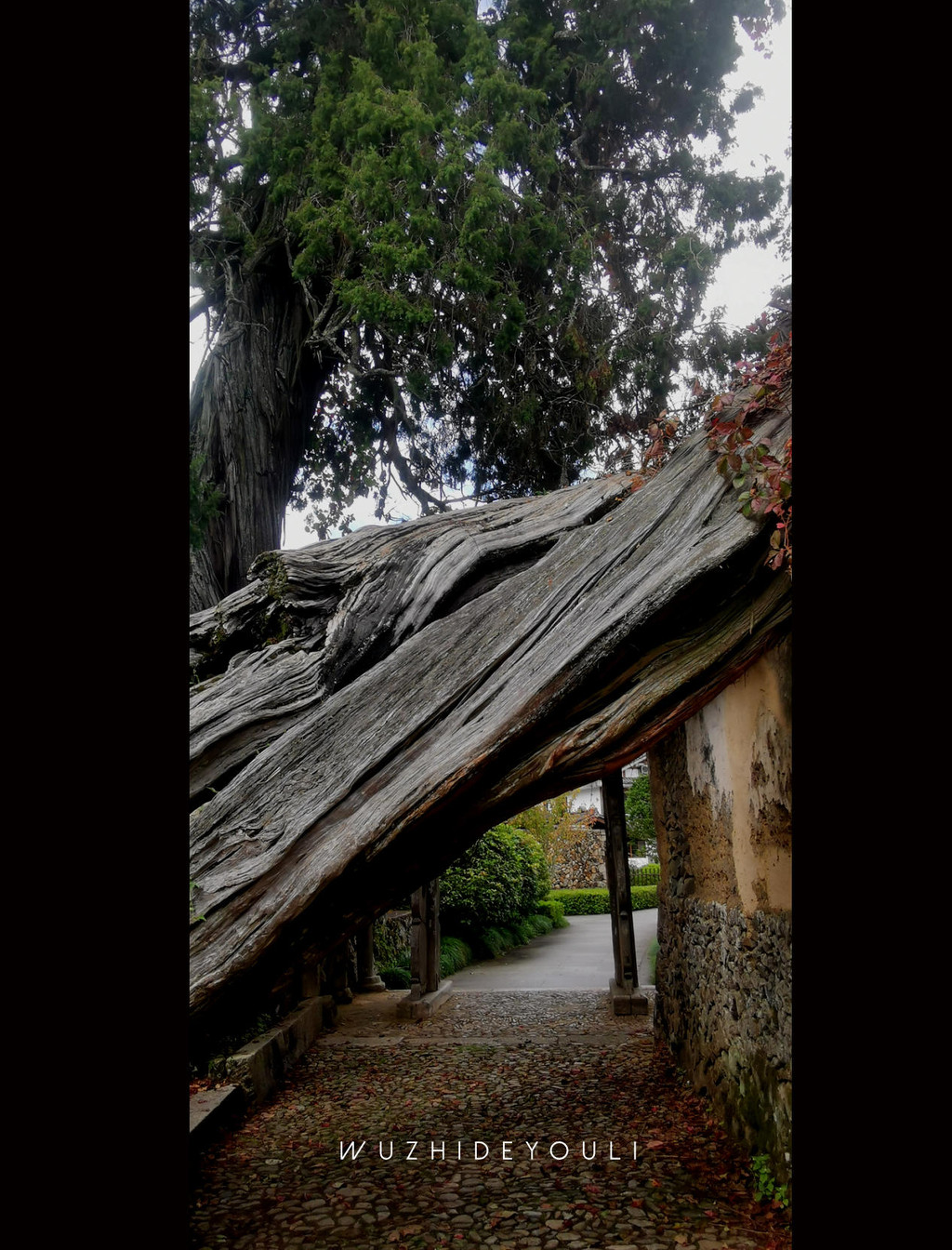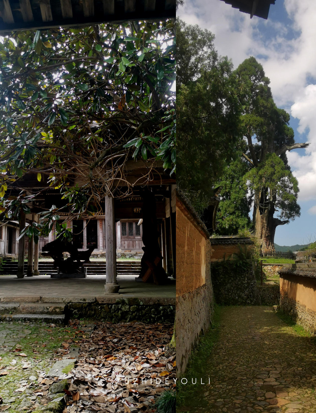 被古树吸引到近前,竟有一条小径通幽,青石板上覆着层薄薄的腐叶,踩上去簌簌作响。沿小径走去,又一棵古树倾倒在面前,粗壮的树干横亘路中,像是提醒我们要进入另一个时空了。