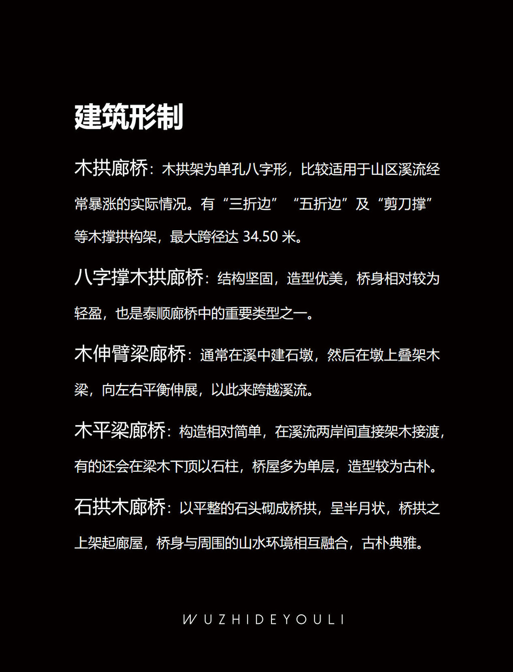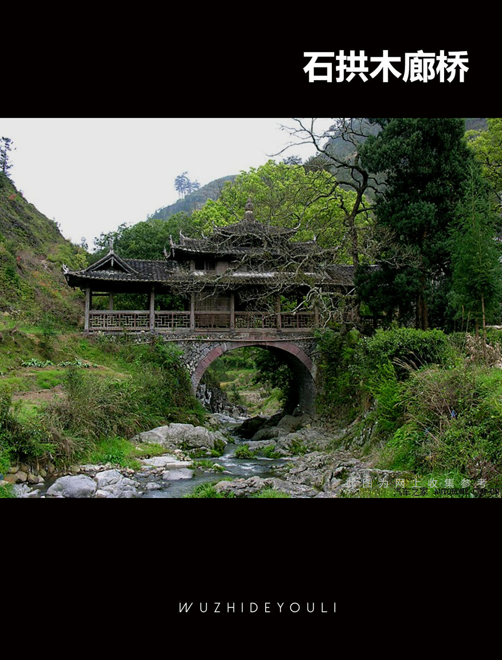 有木拱廊桥;八字撑木拱廊桥;木伸臂梁廊桥;木平梁廊桥;石拱木廊桥等。