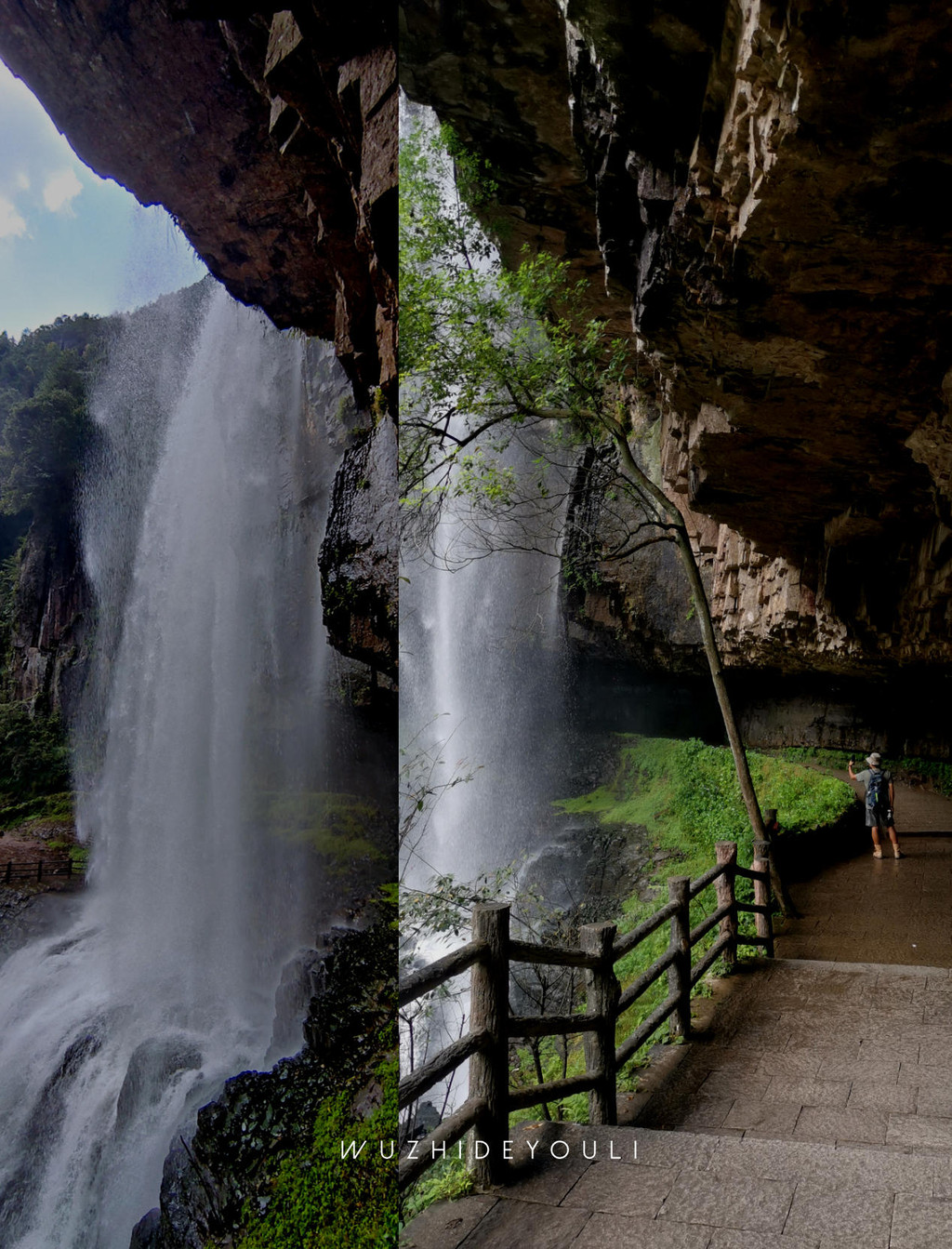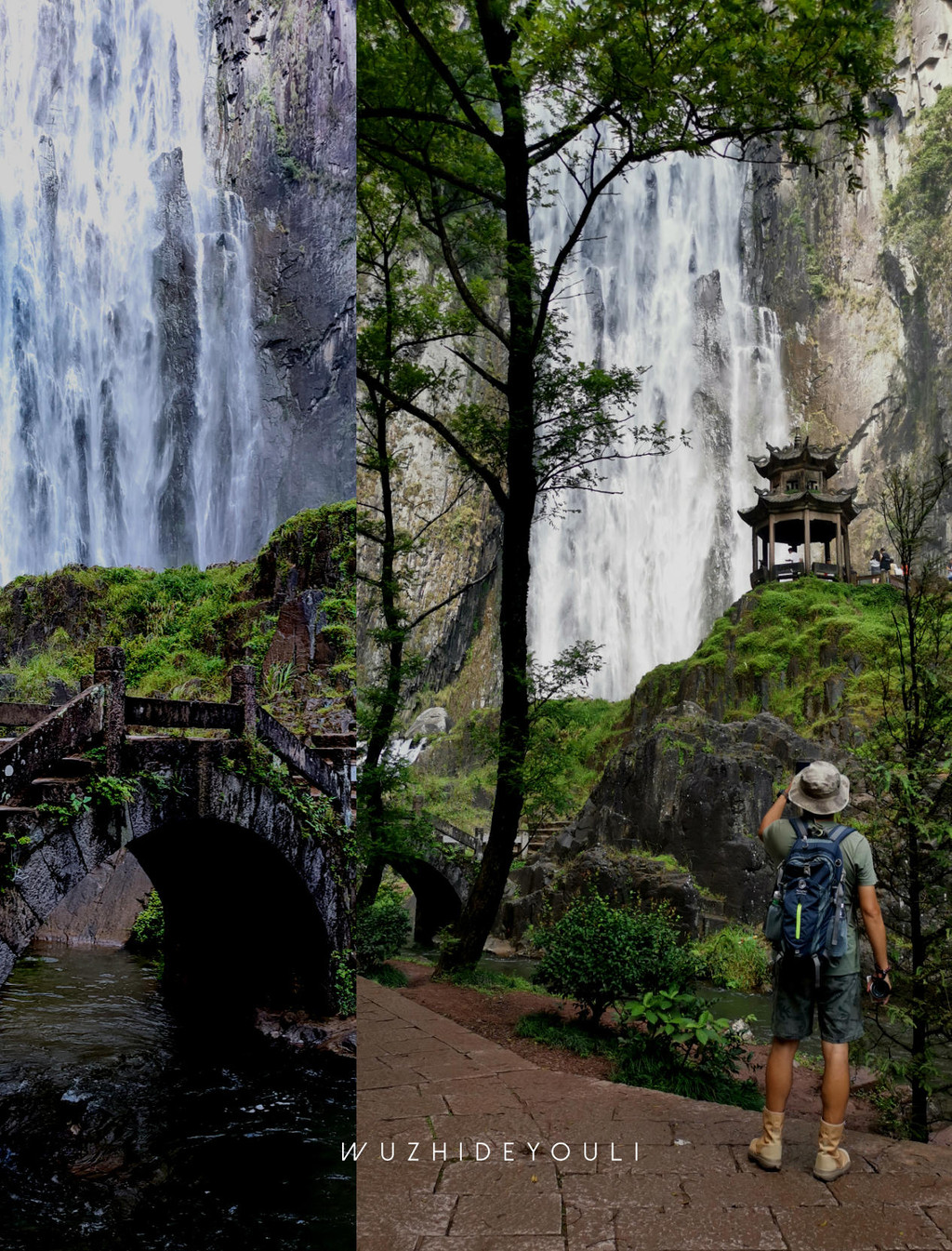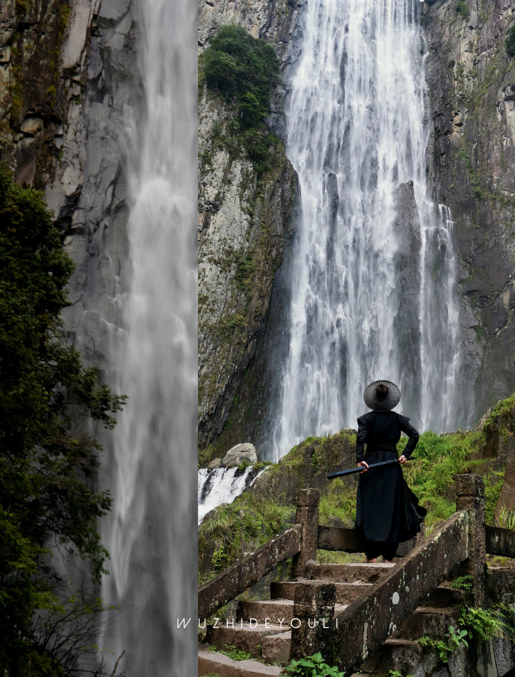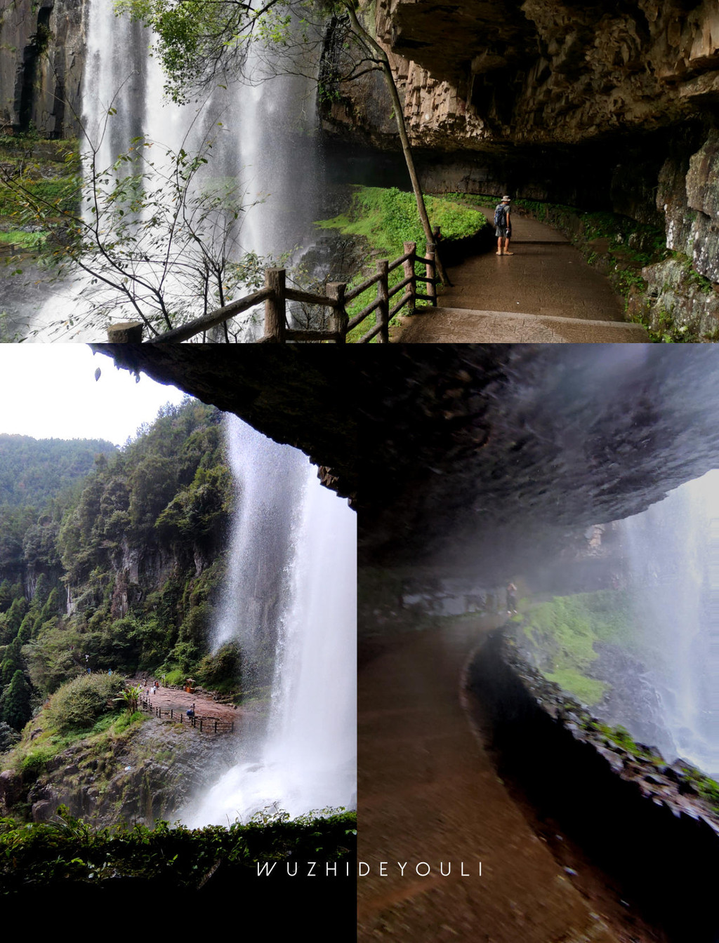 百丈二漈:中成水帘洞,瀑分上下水,可从瀑布后面穿越,感受独特的奇幻体验,从水帘洞出来,站在栏杆边,以瀑布为背景拍照,氛围感直接拉满。