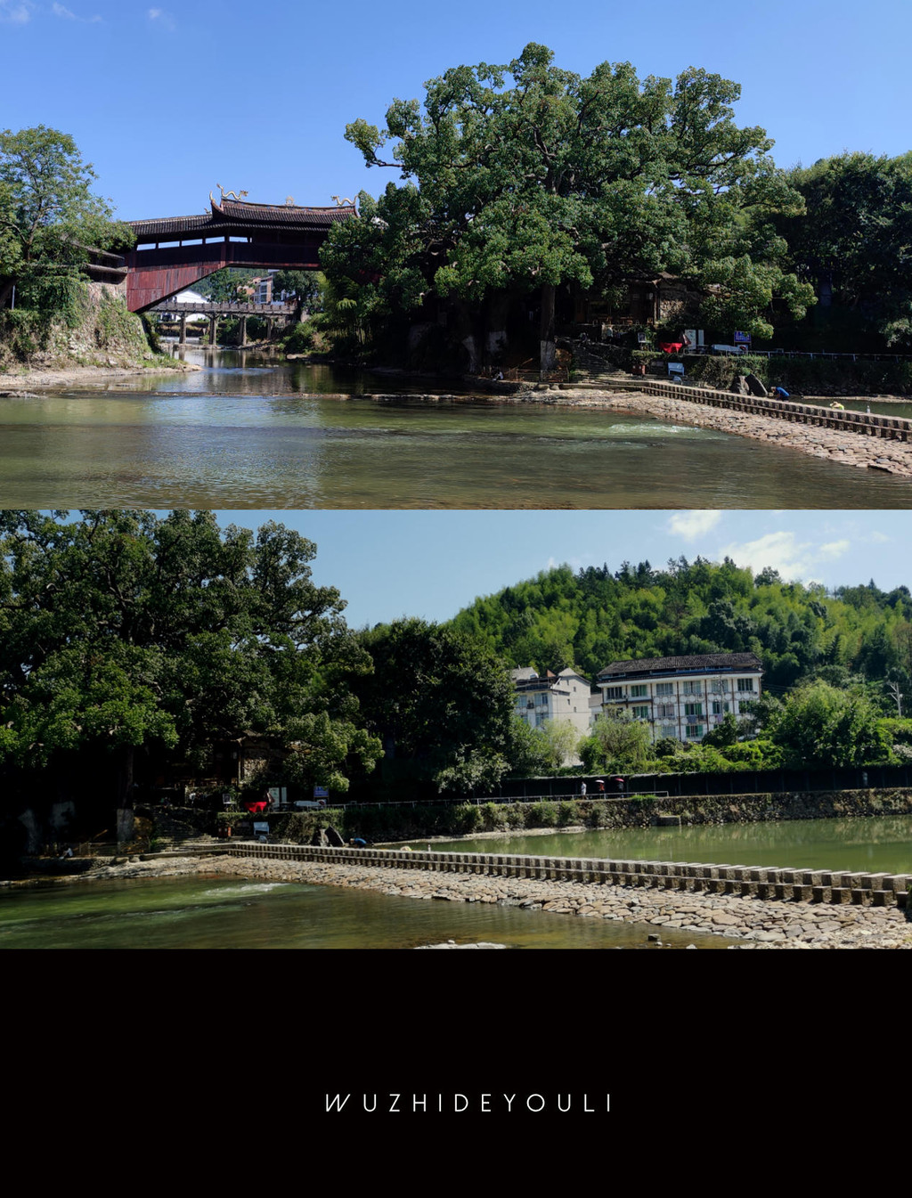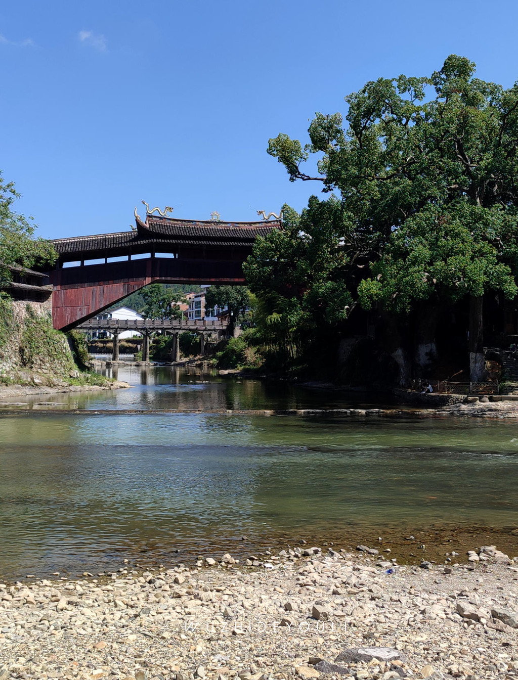 库村始建于晚唐时期,是一个历史悠久、风貌独特的古村落。到达时正值午后阳光最足的时间,村里也没什么游客,商铺都在休息,逛一圈后绕行村头去看泰顺最长廊桥。福庆桥位于浙江省温州市泰顺县新浦乡南浦溪上,横跨在宽宽的南浦溪上,南浦溪是飞云江上游的一条支流。始建于清道光廿八年(1848),原名漈下桥,后被大雨冲毁。清光绪六年(1880)重建,改名福庆桥。1990 年再度毁于台风洪灾,2020 年涅槃重生。