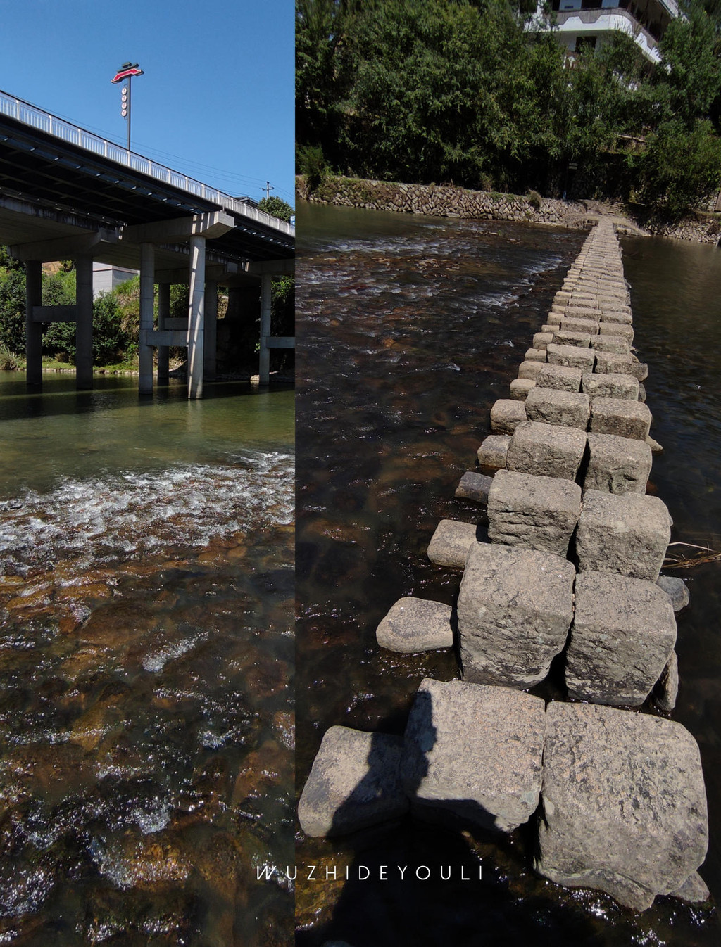 到达北涧桥要走一段碇步,走在水中央看参天树下的北涧桥,桥屋灰瓦红身,飞檐走兽,宫殿式重檐,结构精巧,造型古朴,从远处眺望,整座桥宛如像是一座空中楼阁架在溪流之上。桥旁古树掩映,桥下二水交汇,青山、碧水、虹桥、古树相互辉映,构成一幅迷人的风景画。