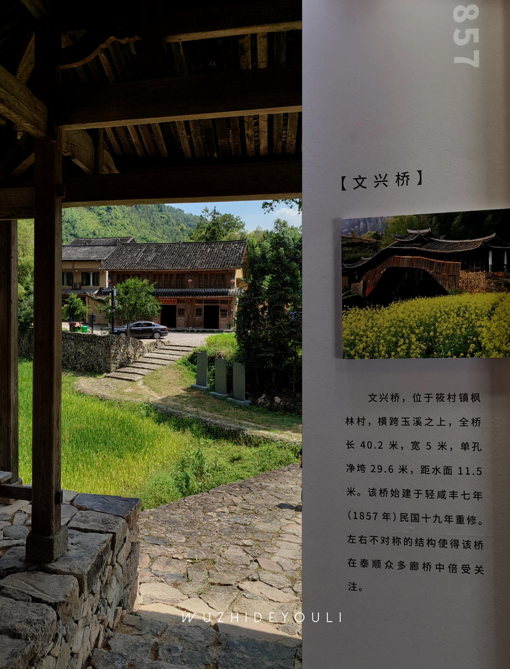 先从文兴桥开始吧,桥边有个小小的廊桥文化展馆,从介绍中了解到原来泰顺很多的百年古桥都在2016年的台风莫兰迪中损毁,现在看到的很多廊桥都是后来修建的。但庆幸的是保留了原有的建筑形式,修旧如旧原则完成修复重建。