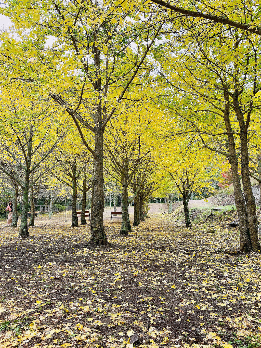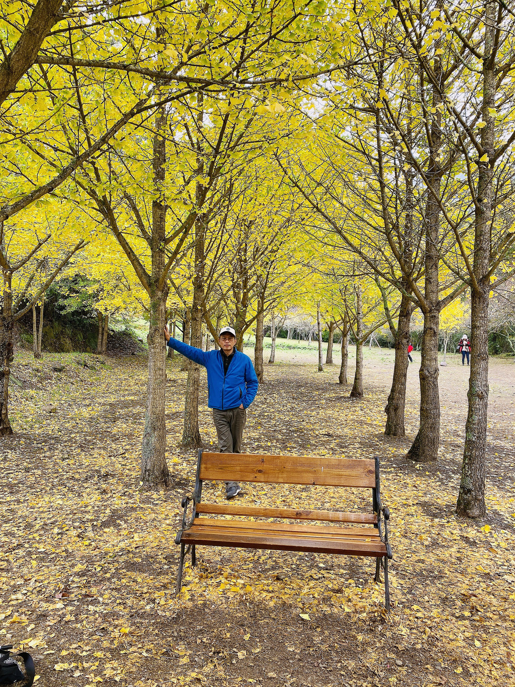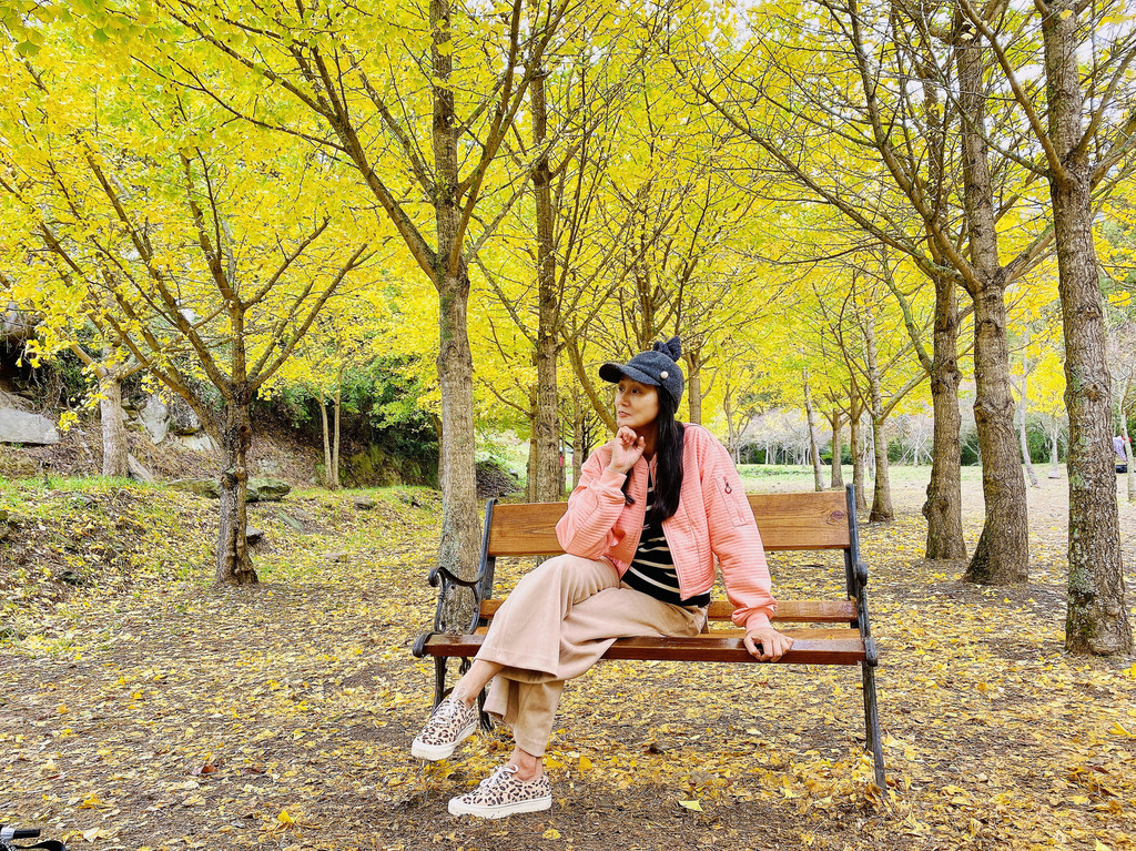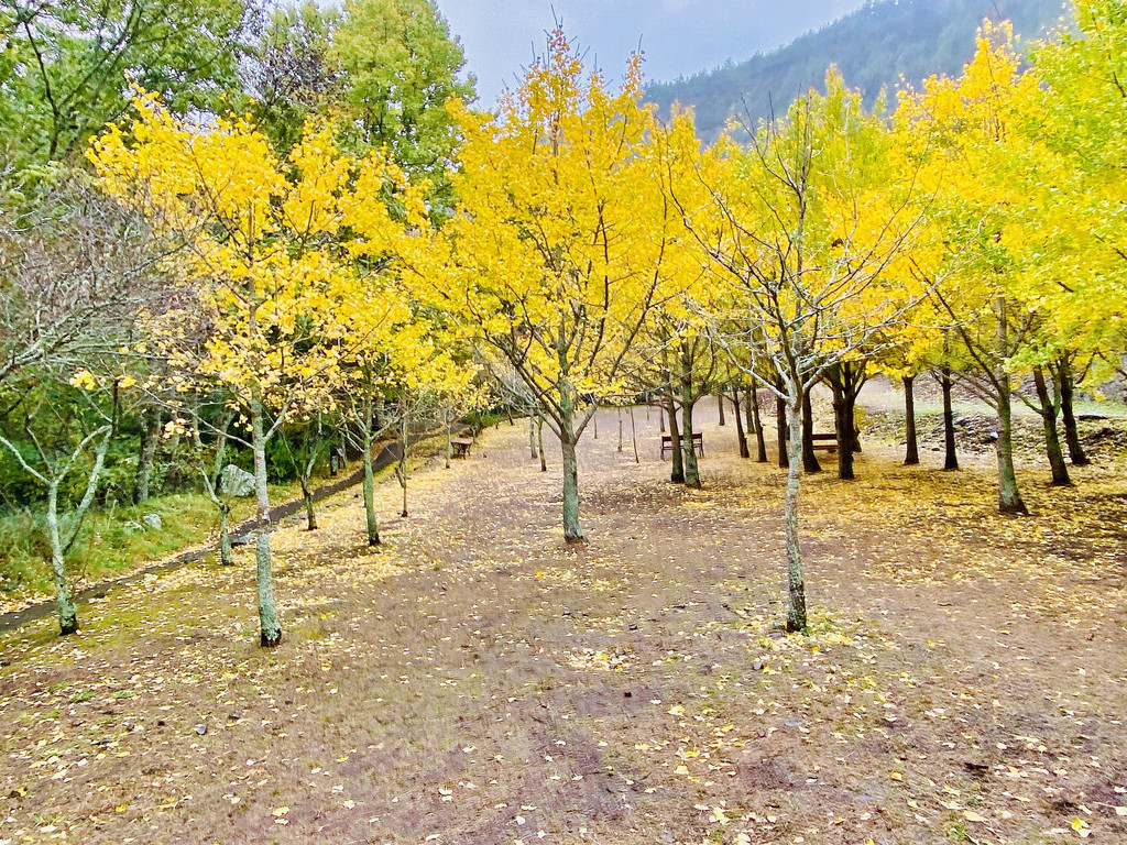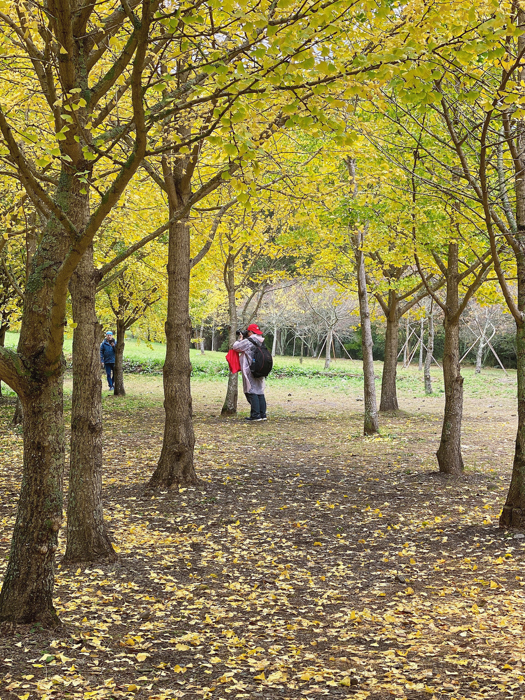 走入了銀杏林所舖成的金黃色隧道,那一整排金黃色的銀杏花海佈滿山谷,銀杏葉片隨風飄飛,那落下的黃色小扇子散落地上,猶如一床美麗的金黃色地毯,漫步在銀杏林裡,彷彿身在日本,感覺有種北國的浪漫情懷。