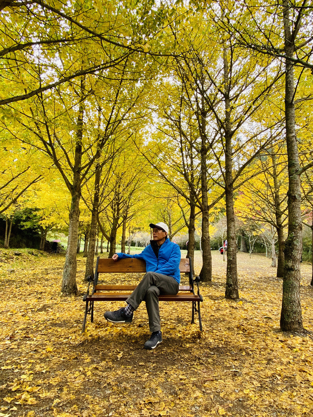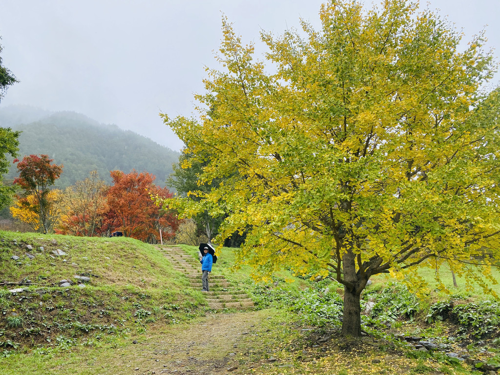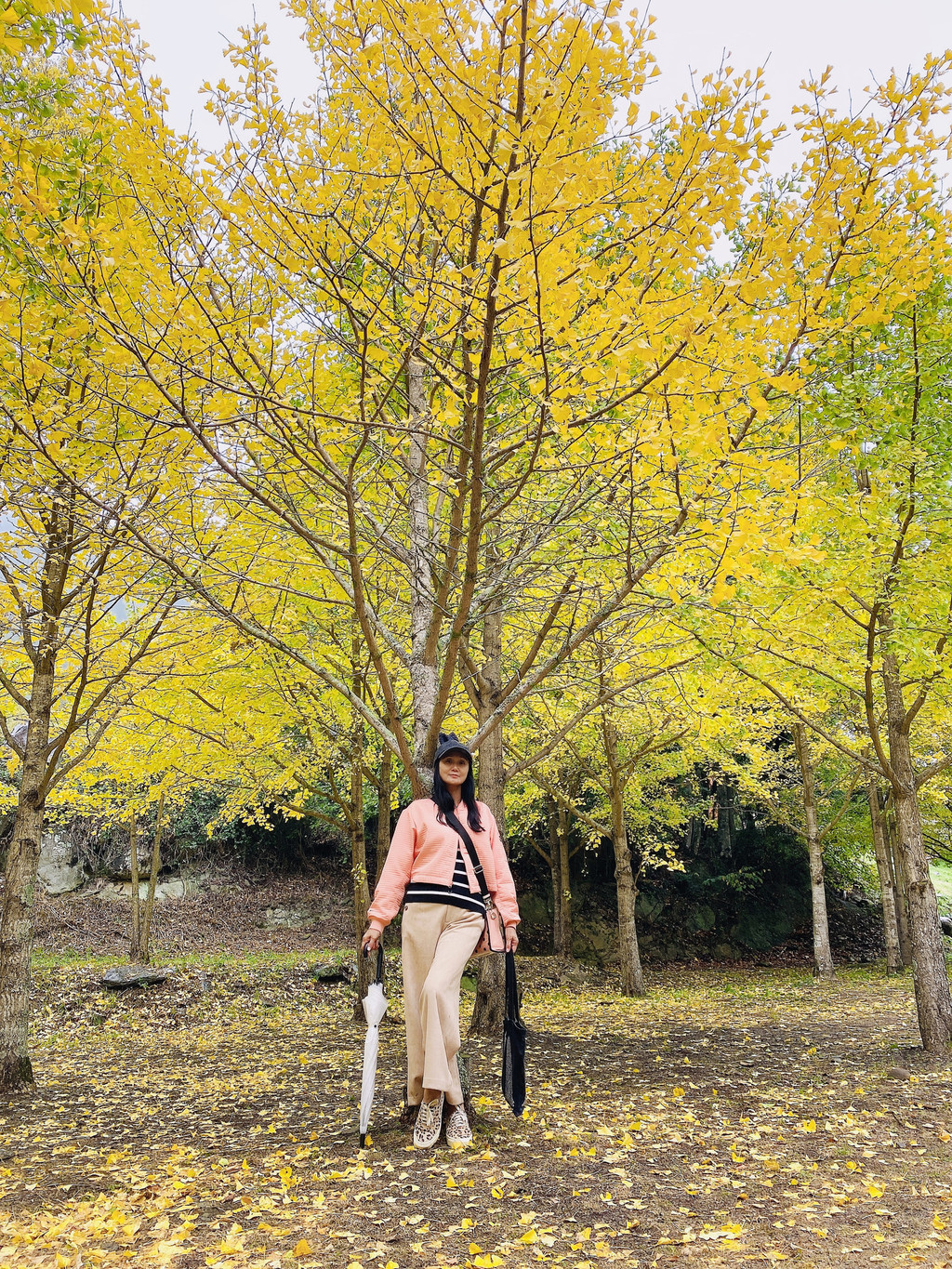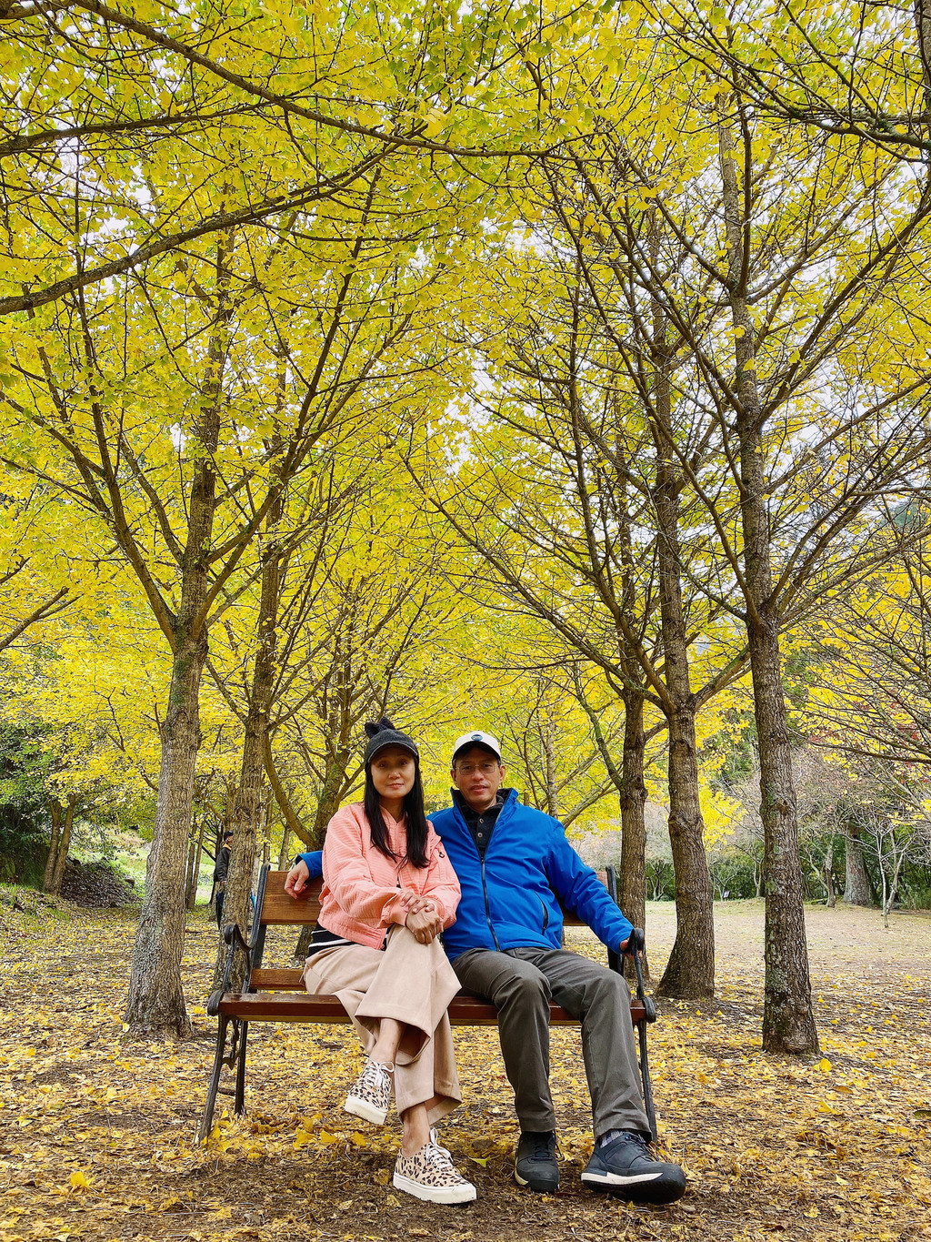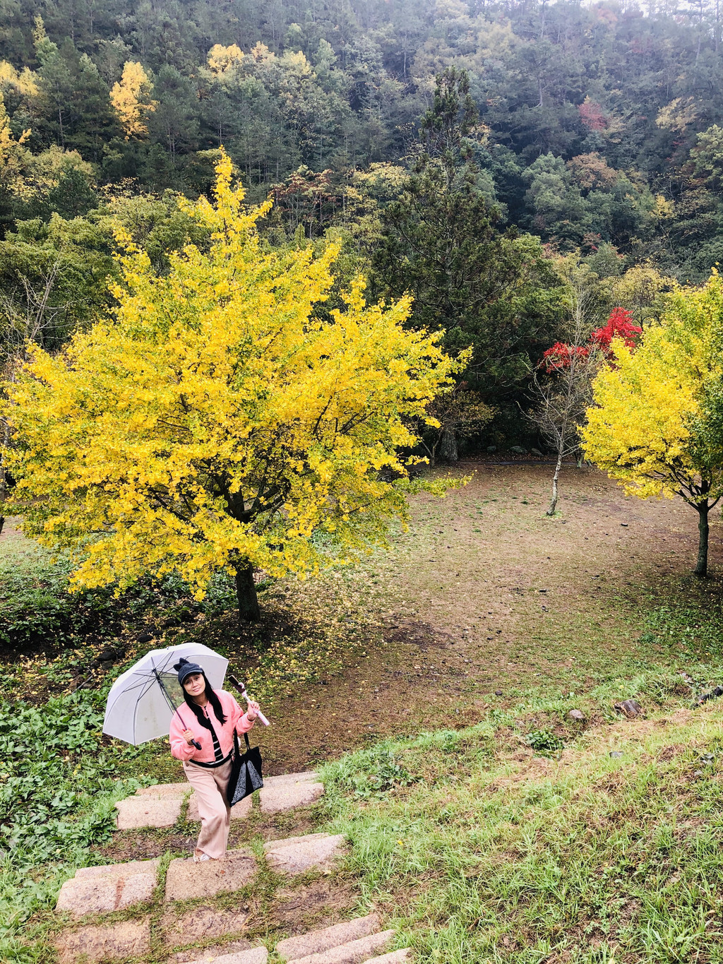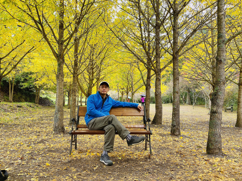 走入了銀杏林所舖成的金黃色隧道,那一整排金黃色的銀杏花海佈滿山谷,銀杏葉片隨風飄飛,那落下的黃色小扇子散落地上,猶如一床美麗的金黃色地毯,漫步在銀杏林裡,彷彿身在日本,感覺有種北國的浪漫情懷。
