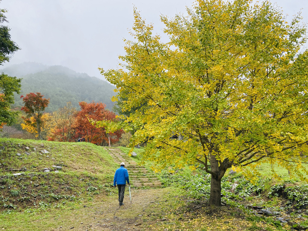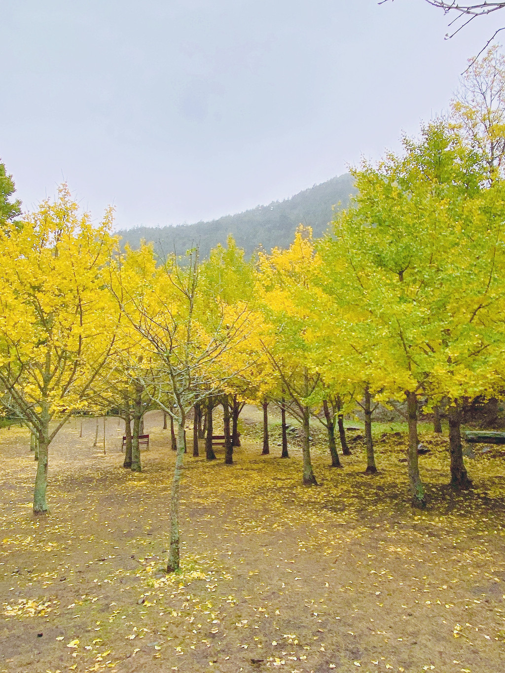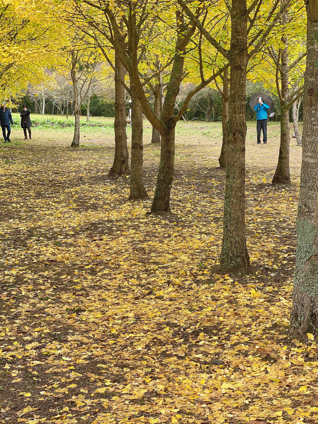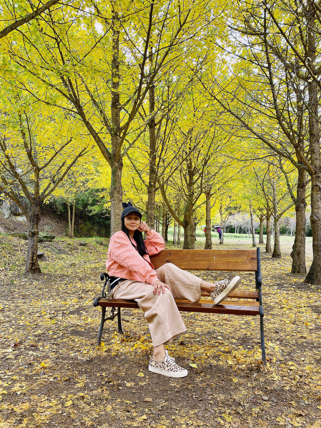 走入了銀杏林所舖成的金黃色隧道,那一整排金黃色的銀杏花海佈滿山谷,銀杏葉片隨風飄飛,那落下的黃色小扇子散落地上,猶如一床美麗的金黃色地毯,漫步在銀杏林裡,彷彿身在日本,感覺有種北國的浪漫情懷。