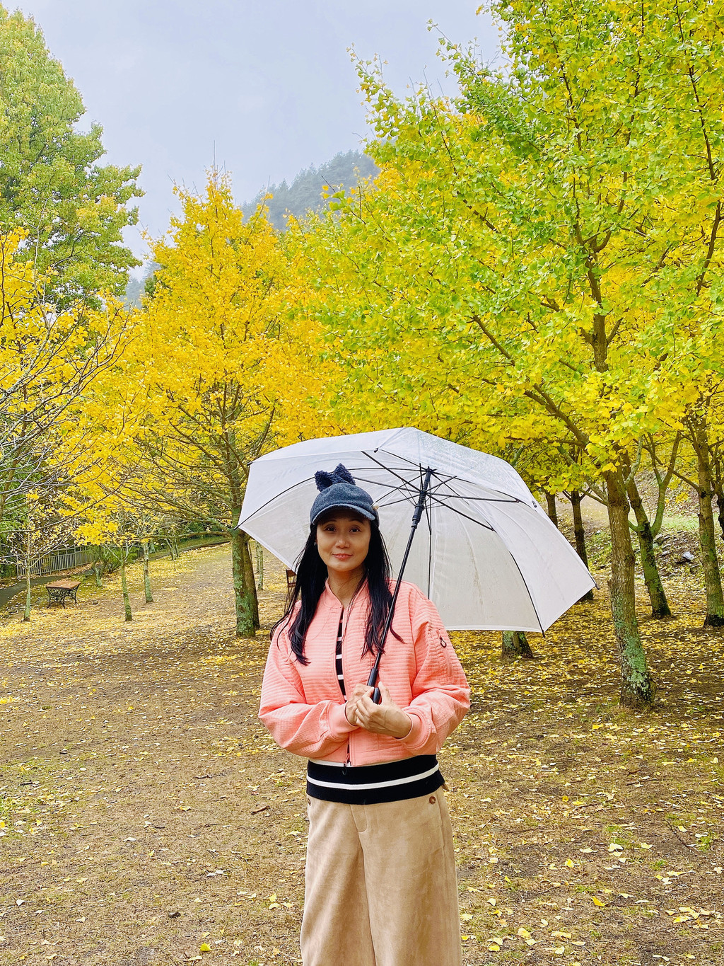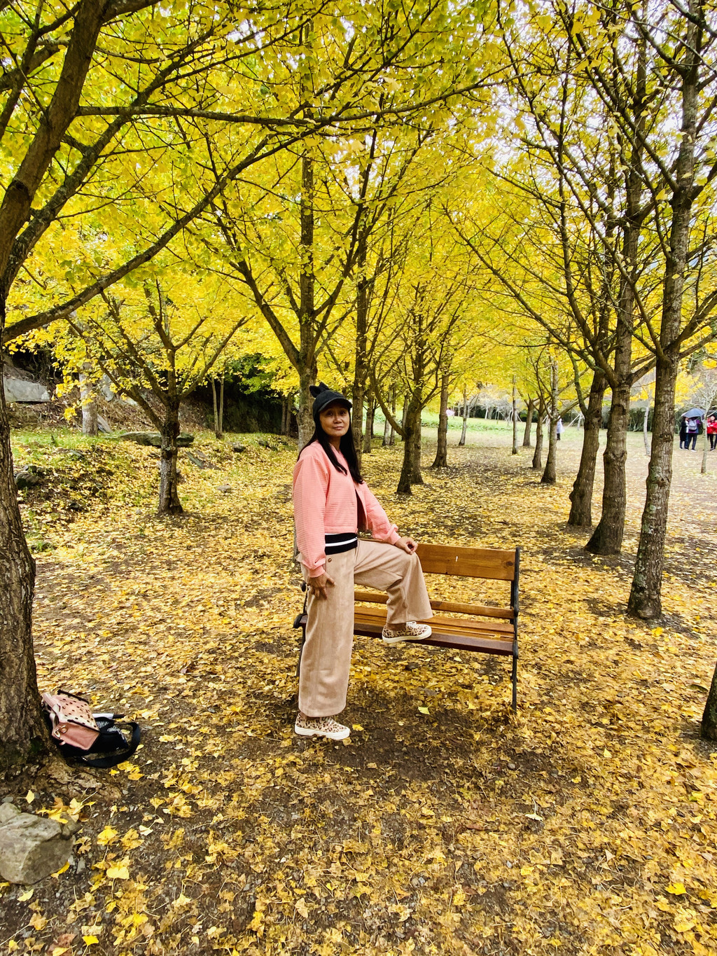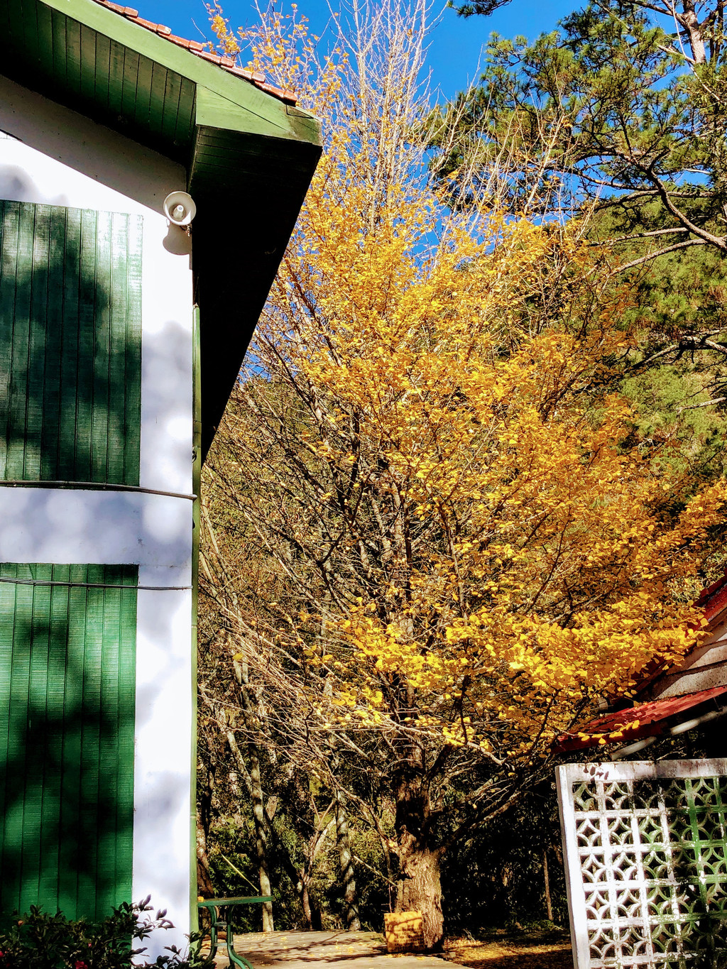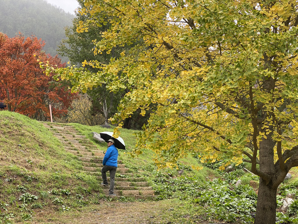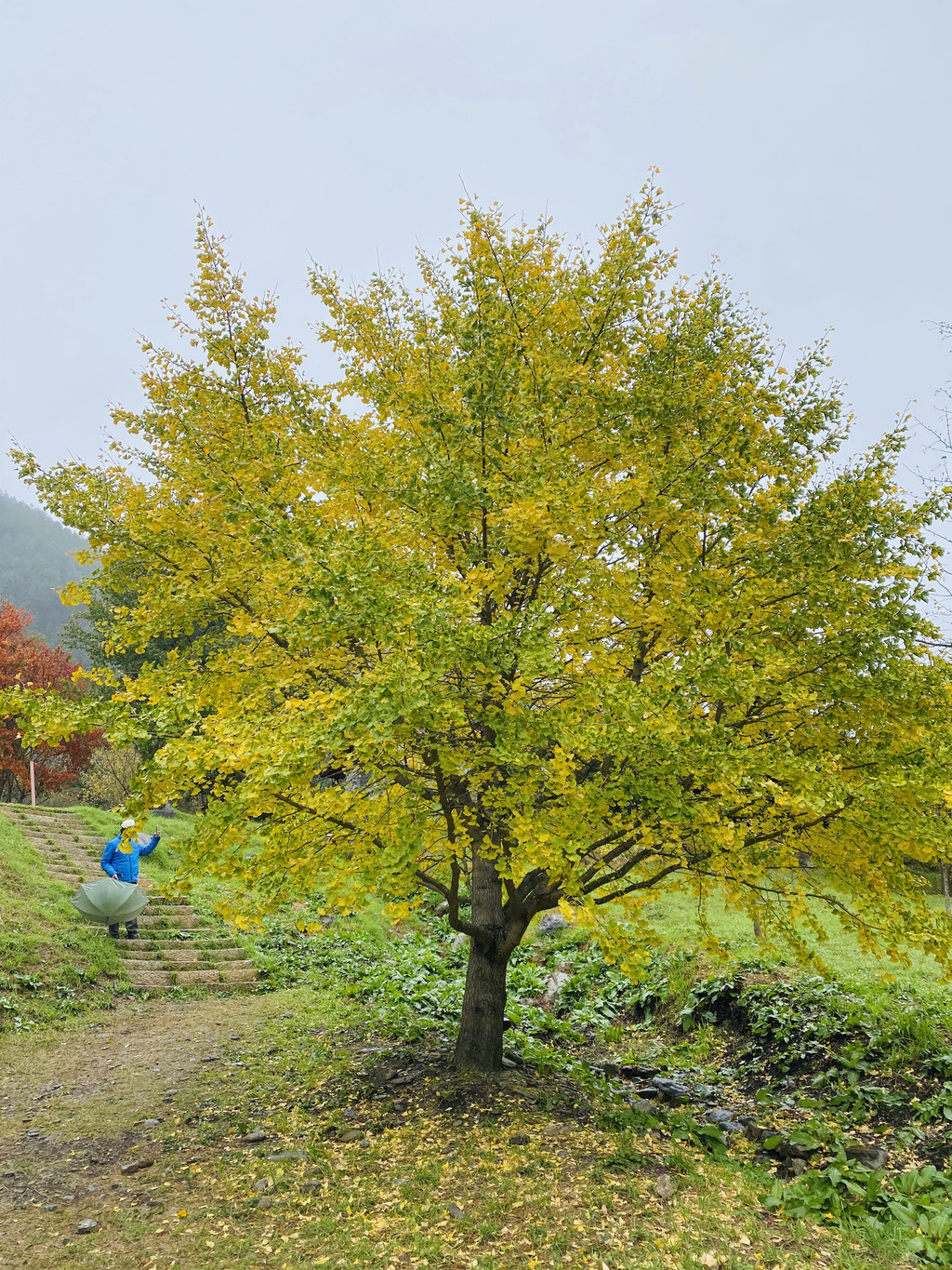 走入了銀杏林所舖成的金黃色隧道,那一整排金黃色的銀杏花海佈滿山谷,銀杏葉片隨風飄飛,那落下的黃色小扇子散落地上,猶如一床美麗的金黃色地毯,漫步在銀杏林裡,彷彿身在日本,感覺有種北國的浪漫情懷。