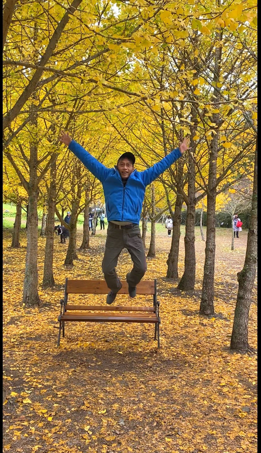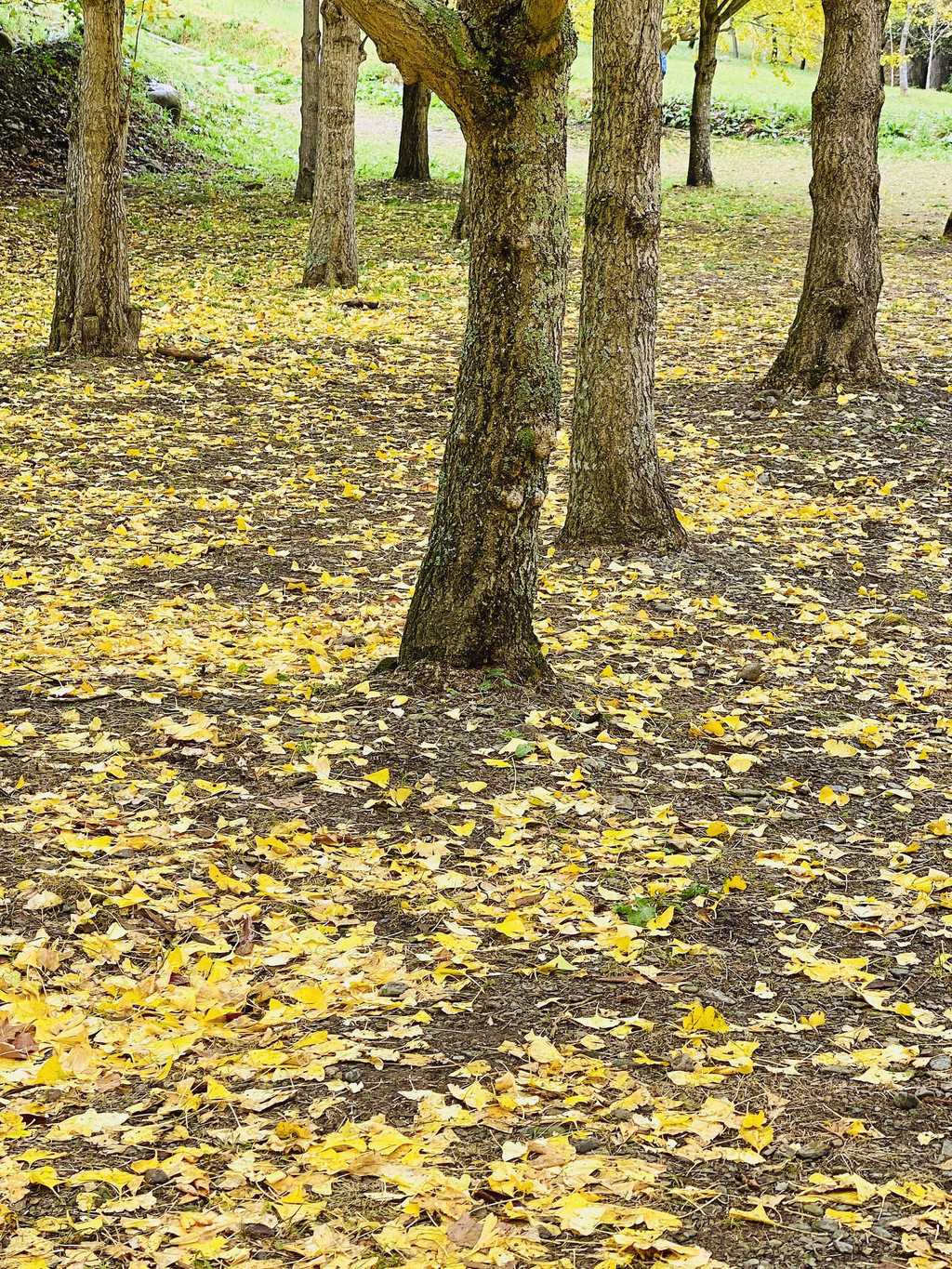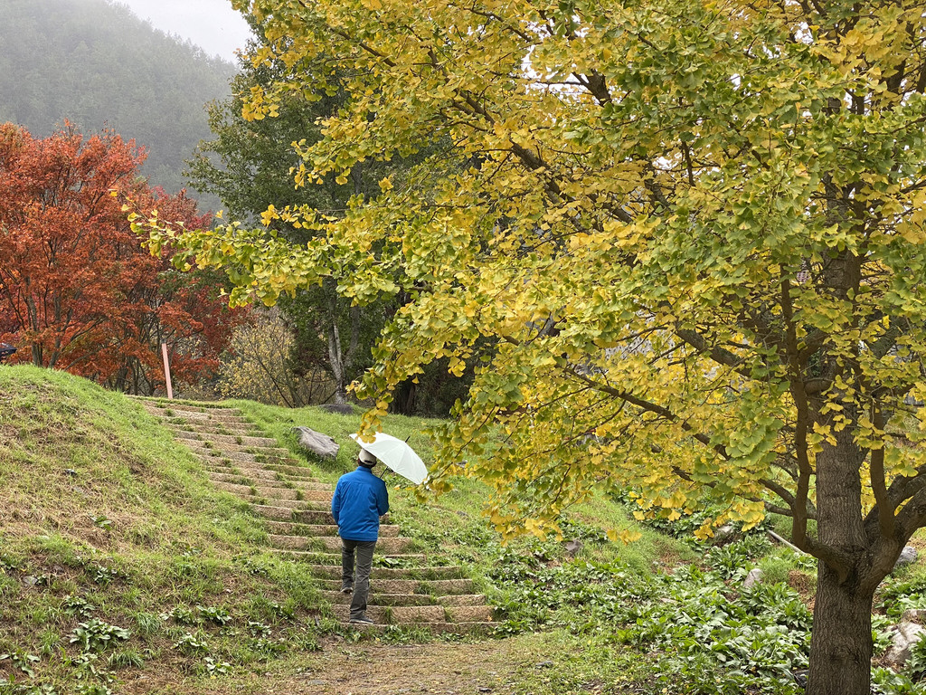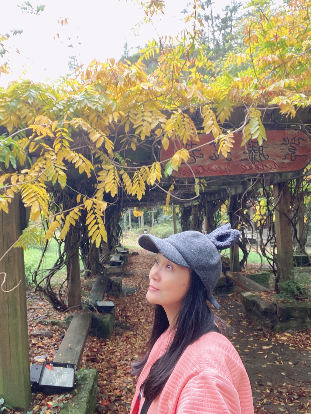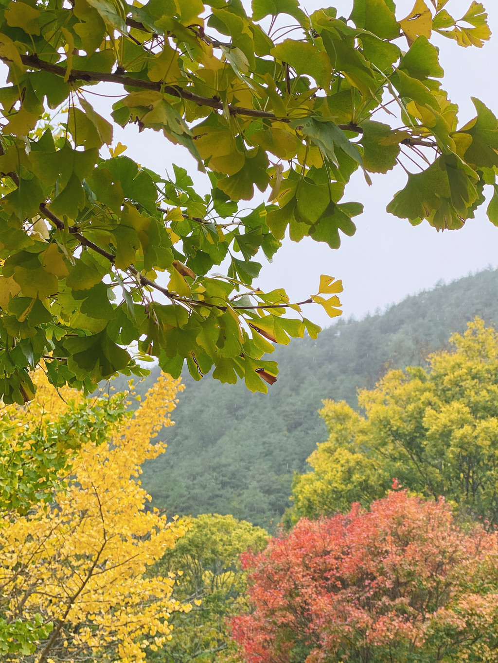 走入了銀杏林所舖成的金黃色隧道,那一整排金黃色的銀杏花海佈滿山谷,銀杏葉片隨風飄飛,那落下的黃色小扇子散落地上,猶如一床美麗的金黃色地毯,漫步在銀杏林裡,彷彿身在日本,感覺有種北國的浪漫情懷。
