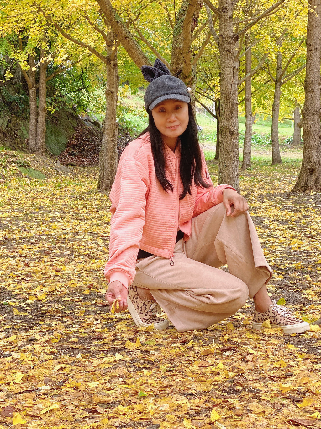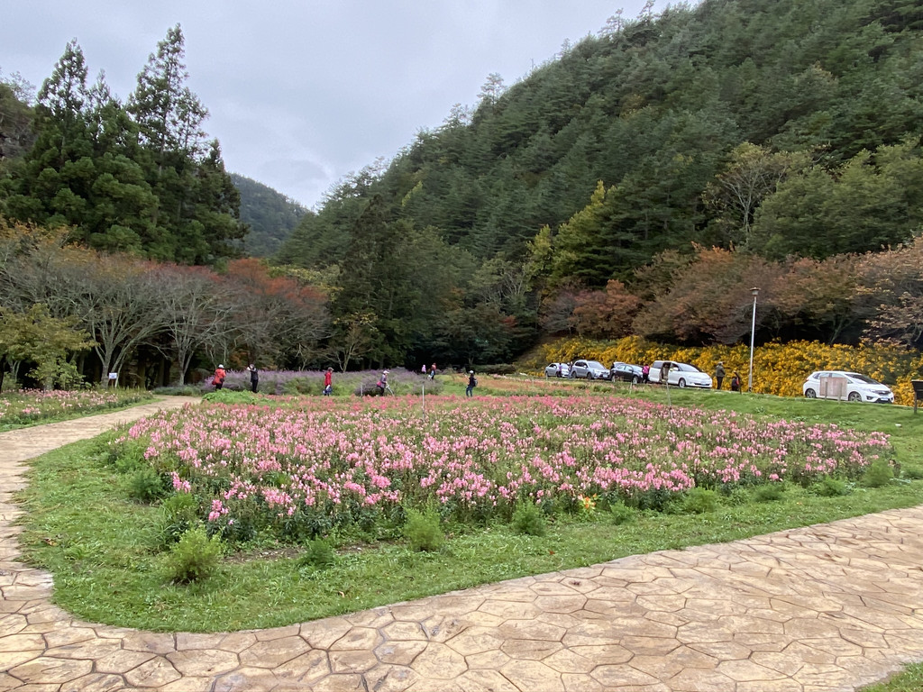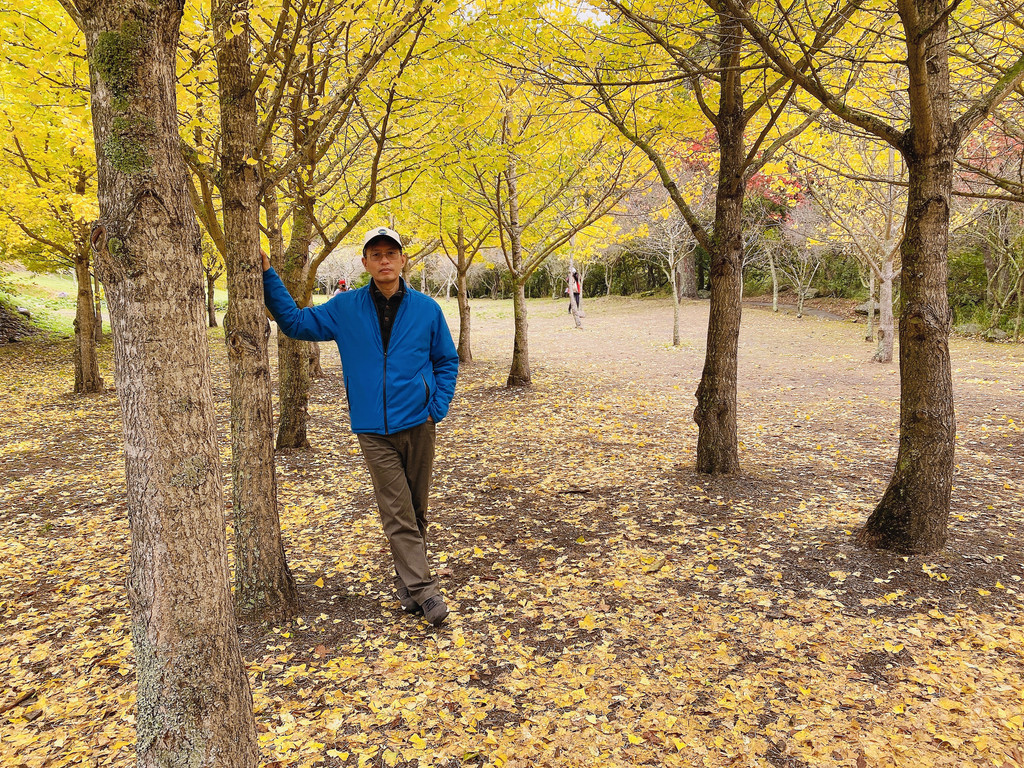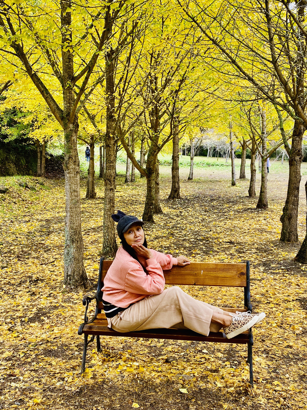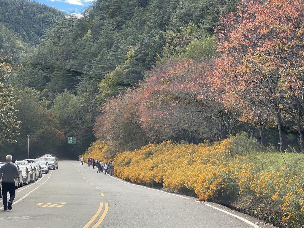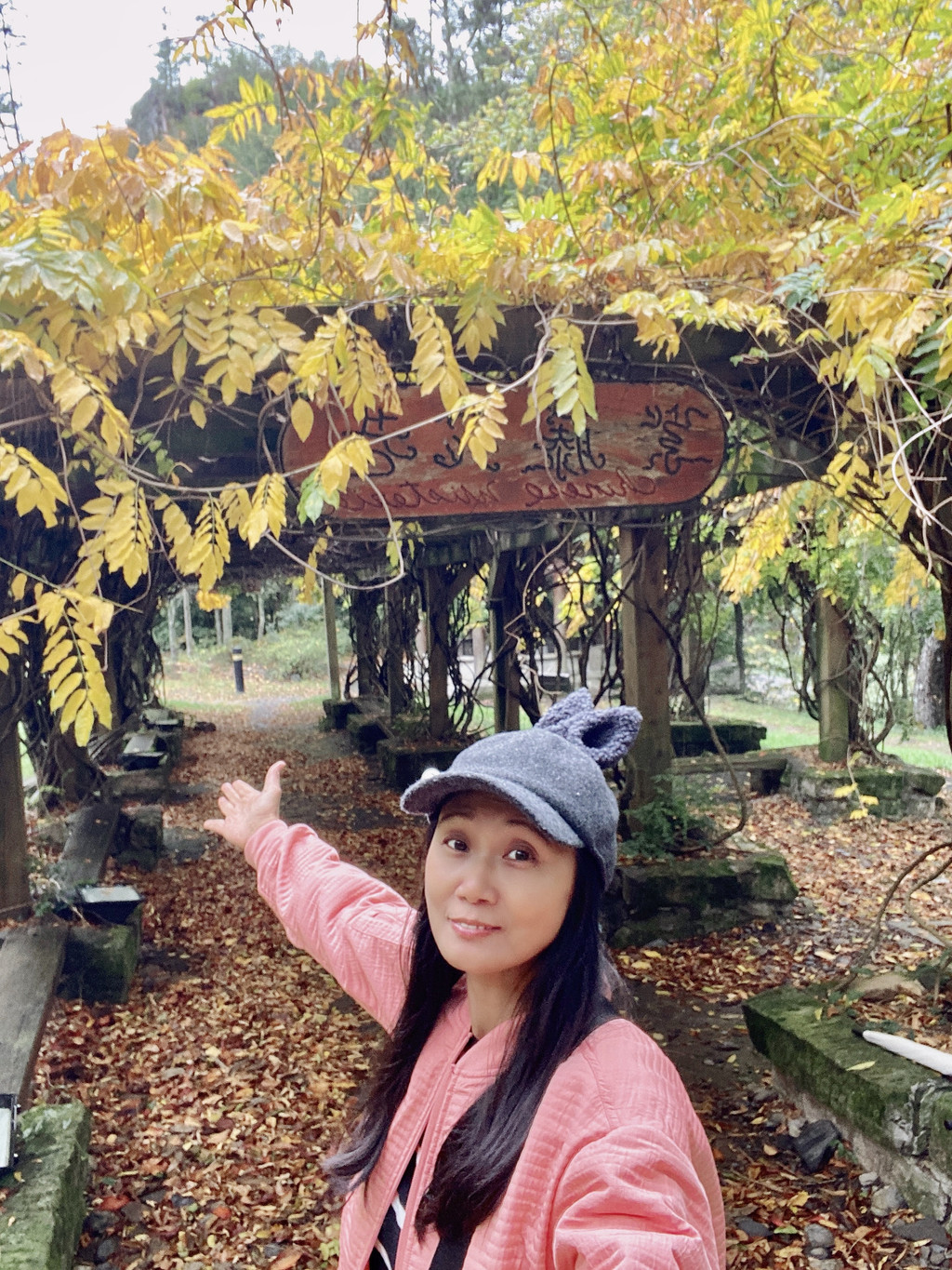 走入了銀杏林所舖成的金黃色隧道,那一整排金黃色的銀杏花海佈滿山谷,銀杏葉片隨風飄飛,那落下的黃色小扇子散落地上,猶如一床美麗的金黃色地毯,漫步在銀杏林裡,彷彿身在日本,感覺有種北國的浪漫情懷。