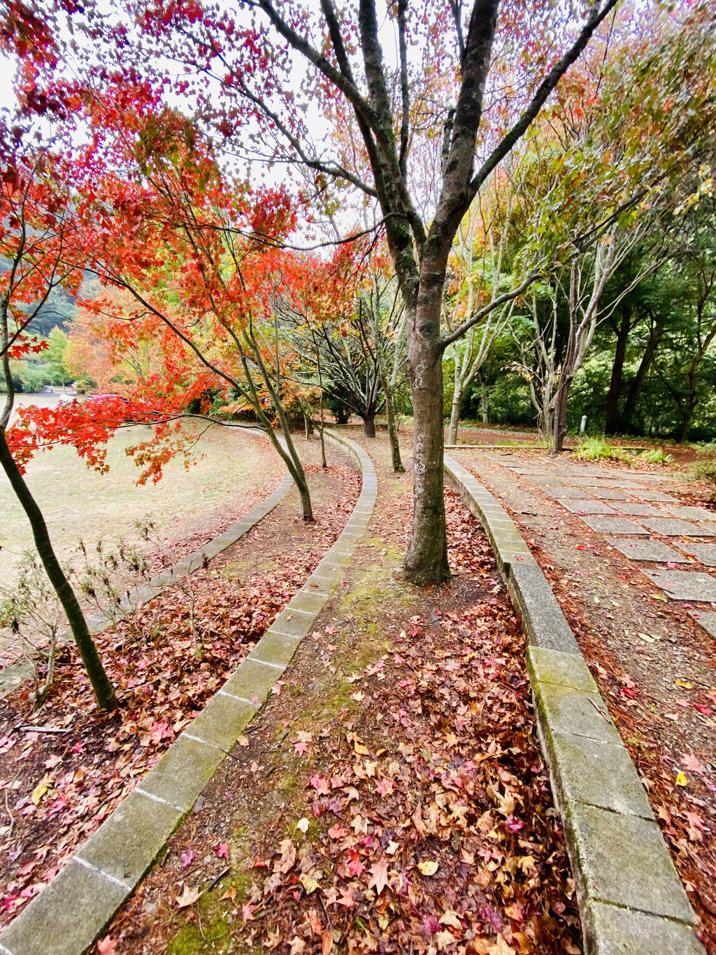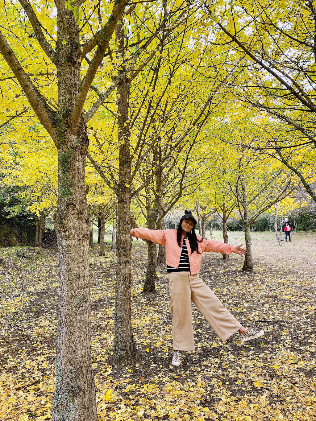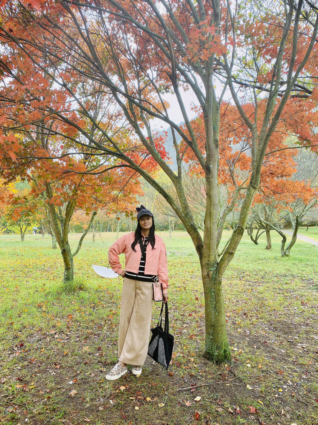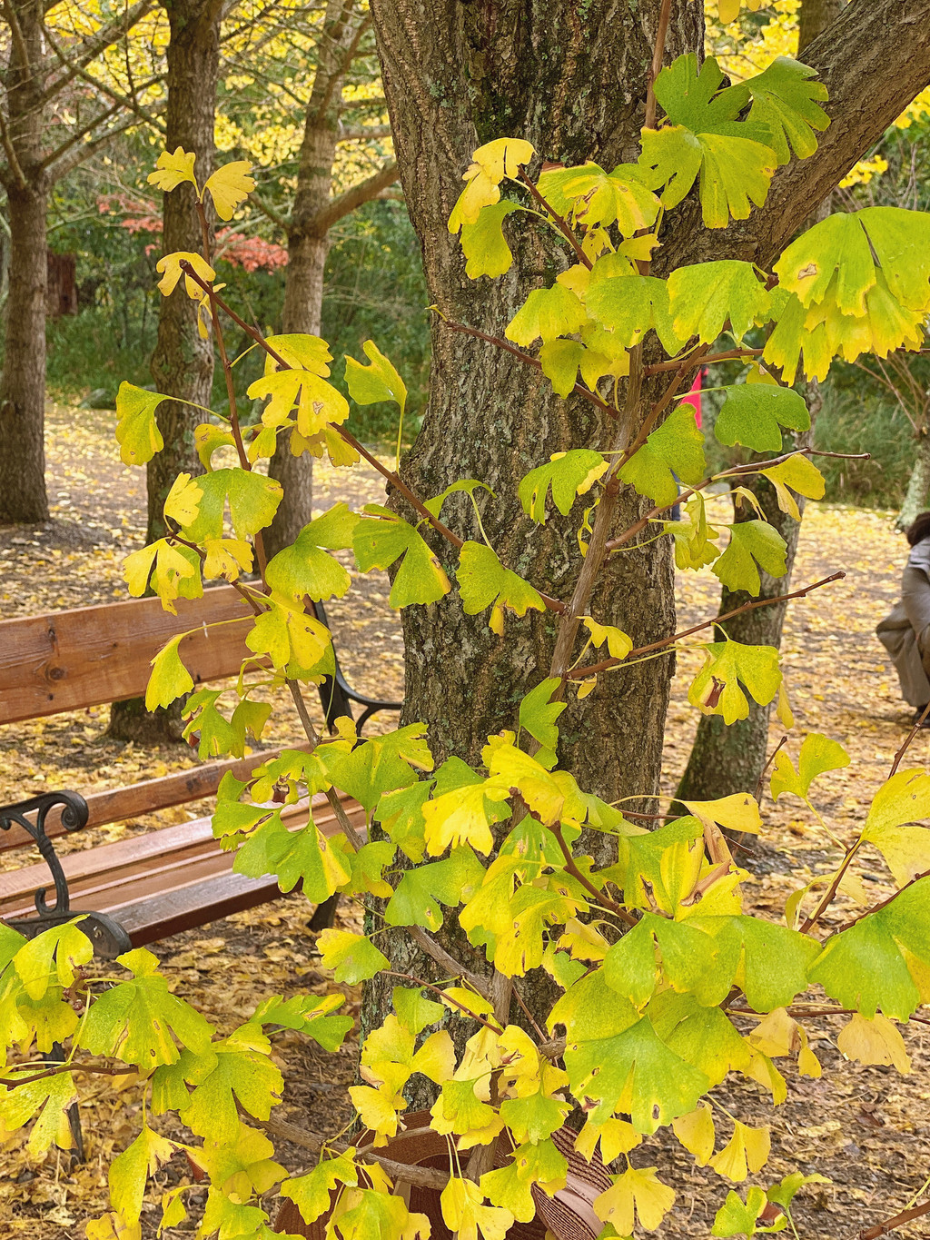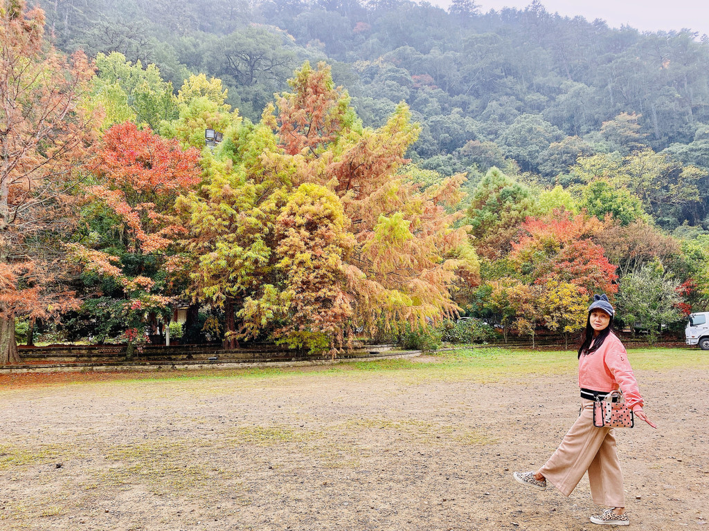 我們就隨意逛逛,我們此行的目的是要來拍紅葉及銀杏、落羽松。花園廣場的後方是一片銀杏林秘境,銀杏的綠葉在入秋後如漸轉色為金黃色一片,地上都是滿滿的銀杏葉,綻放金黄世界,非常美麗的畫面。再過去就是一片楓葉林、落羽松,紅色、黃色、橘色、綠色,顏色鮮艷繽紛,秋天的美麗神話。