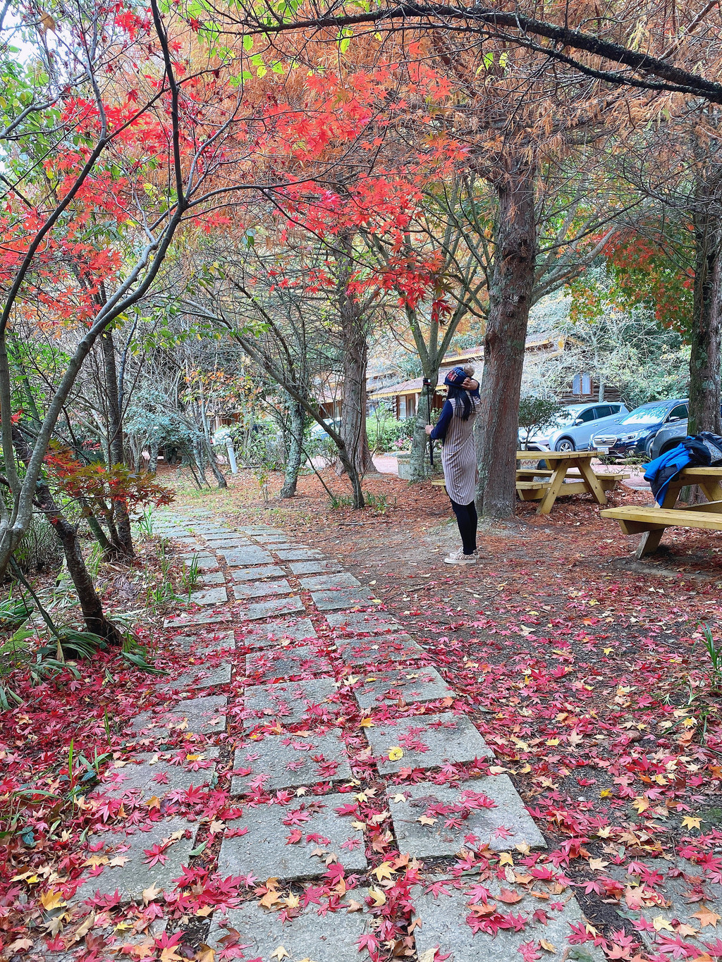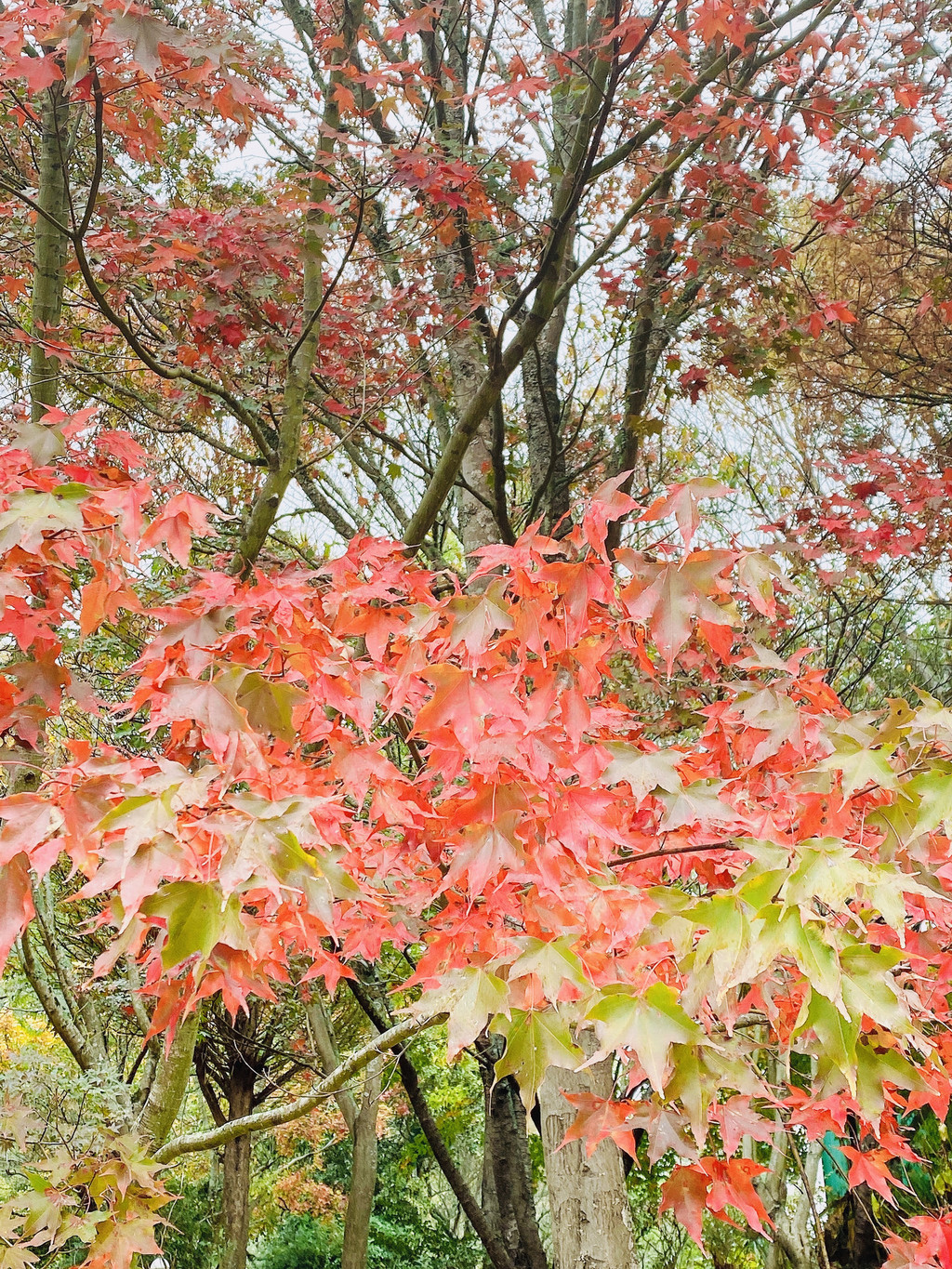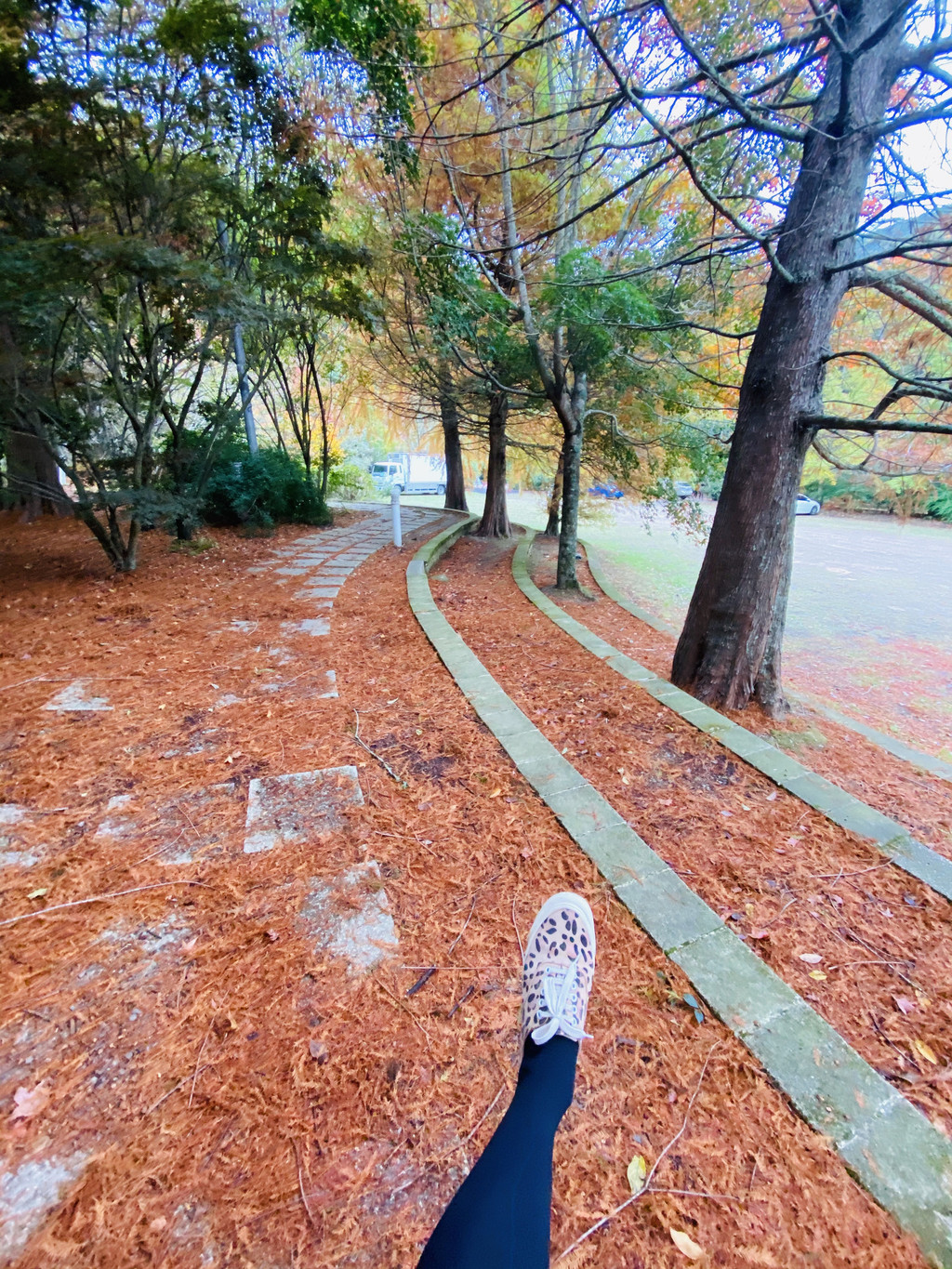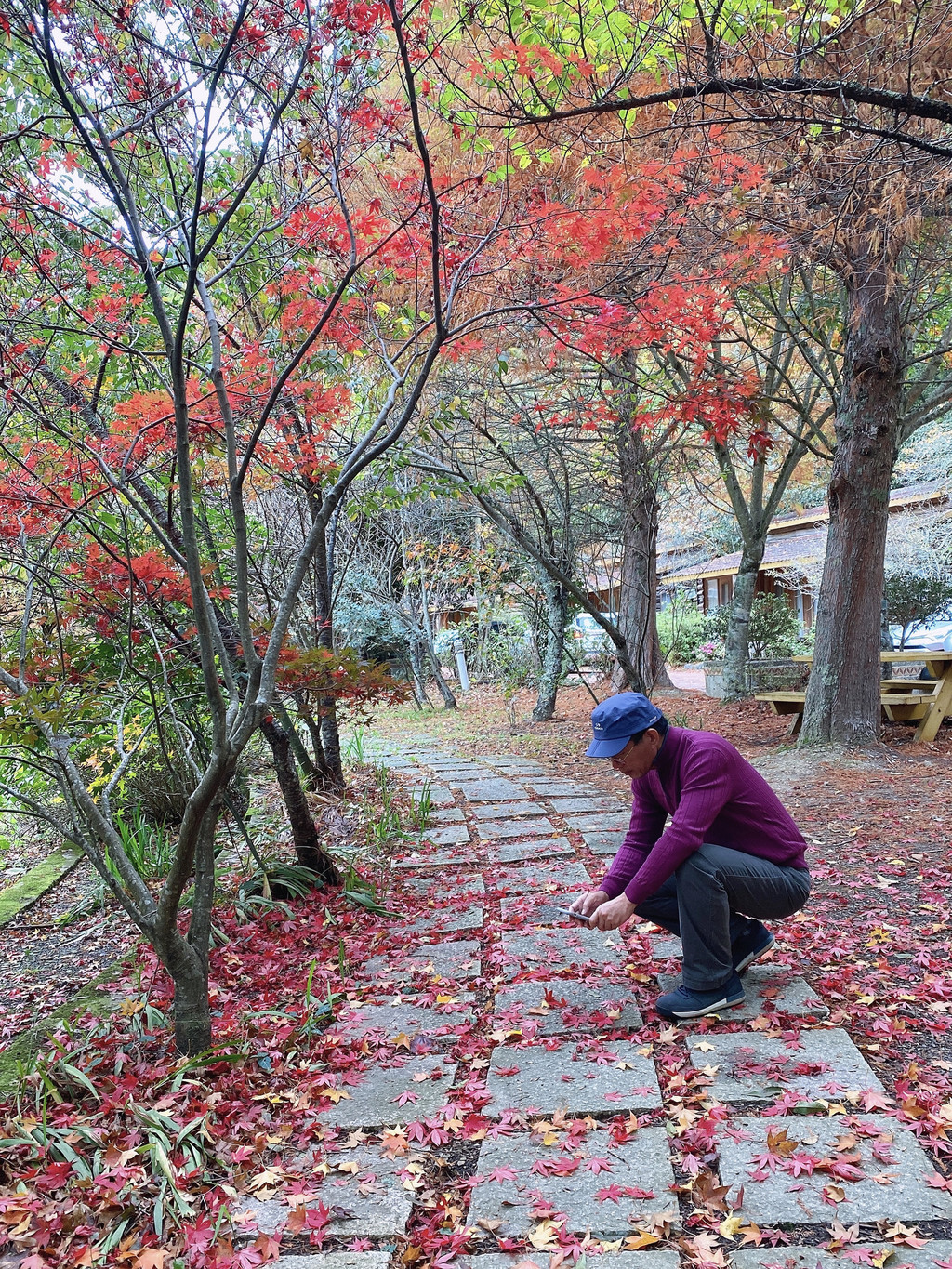 我們就隨意逛逛,我們此行的目的是要來拍紅葉及銀杏、落羽松。花園廣場的後方是一片銀杏林秘境,銀杏的綠葉在入秋後如漸轉色為金黃色一片,地上都是滿滿的銀杏葉,綻放金黄世界,非常美麗的畫面。再過去就是一片楓葉林、落羽松,紅色、黃色、橘色、綠色,顏色鮮艷繽紛,秋天的美麗神話。