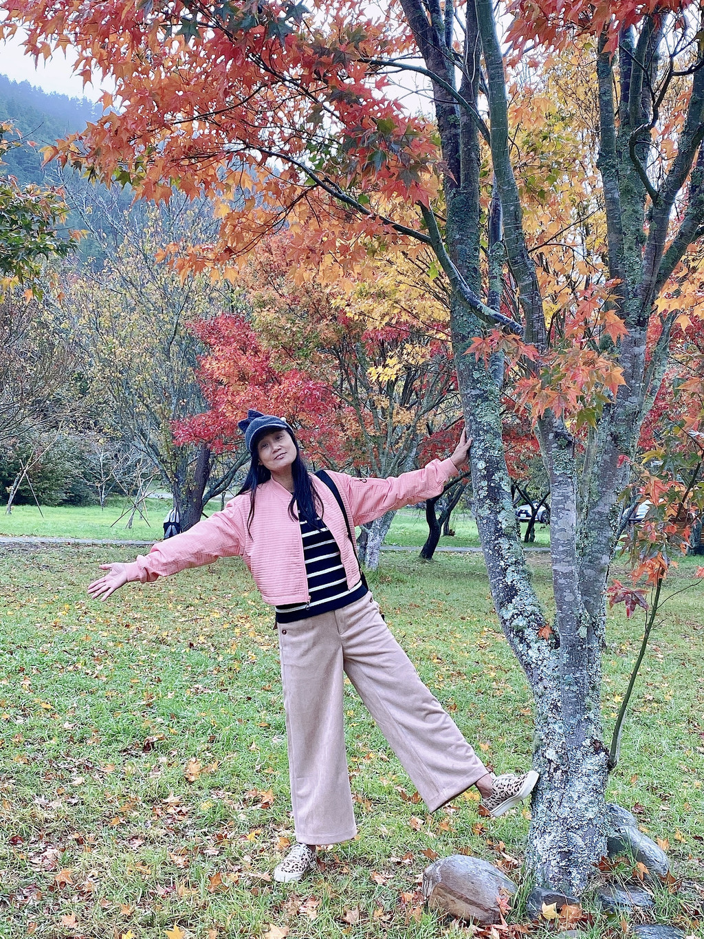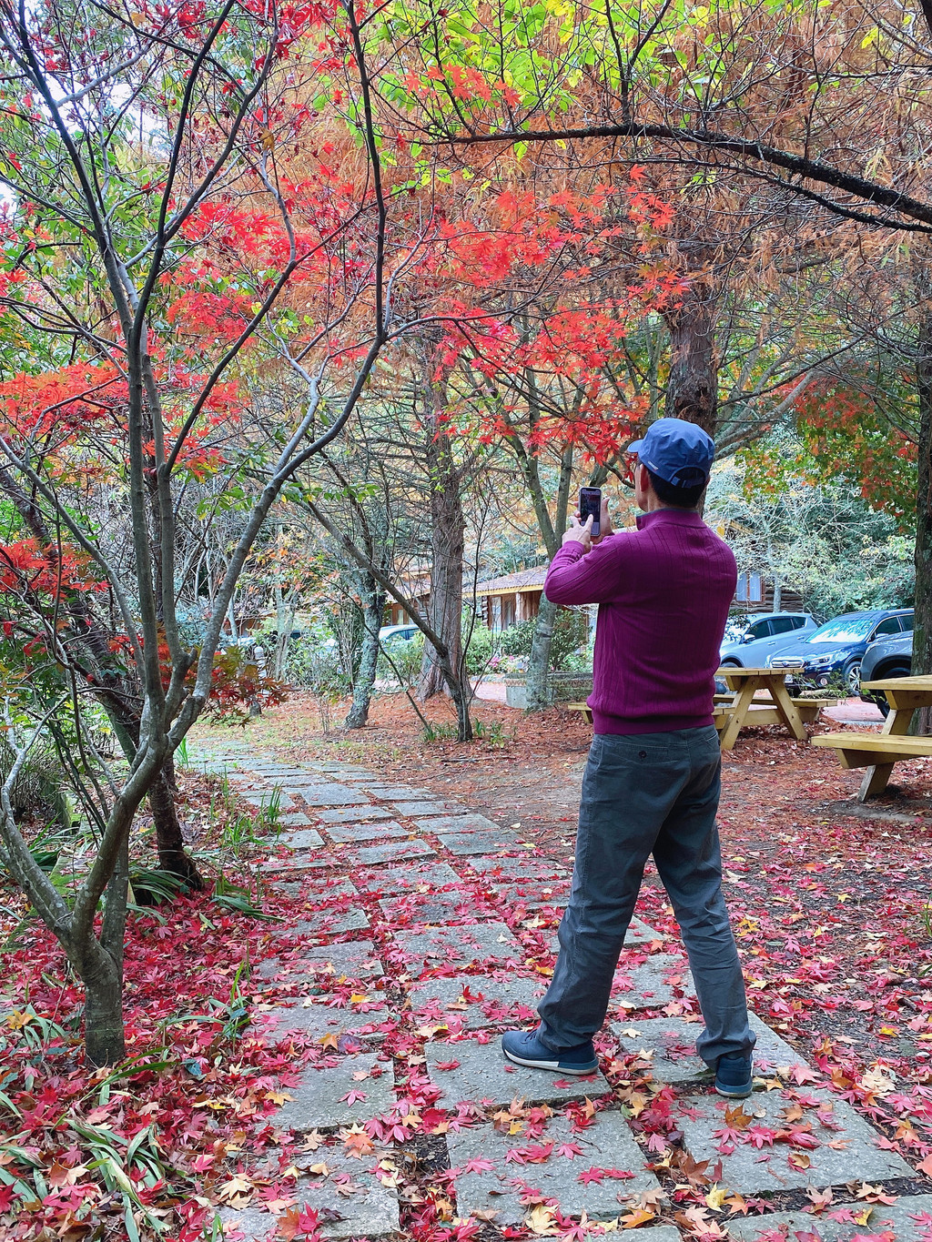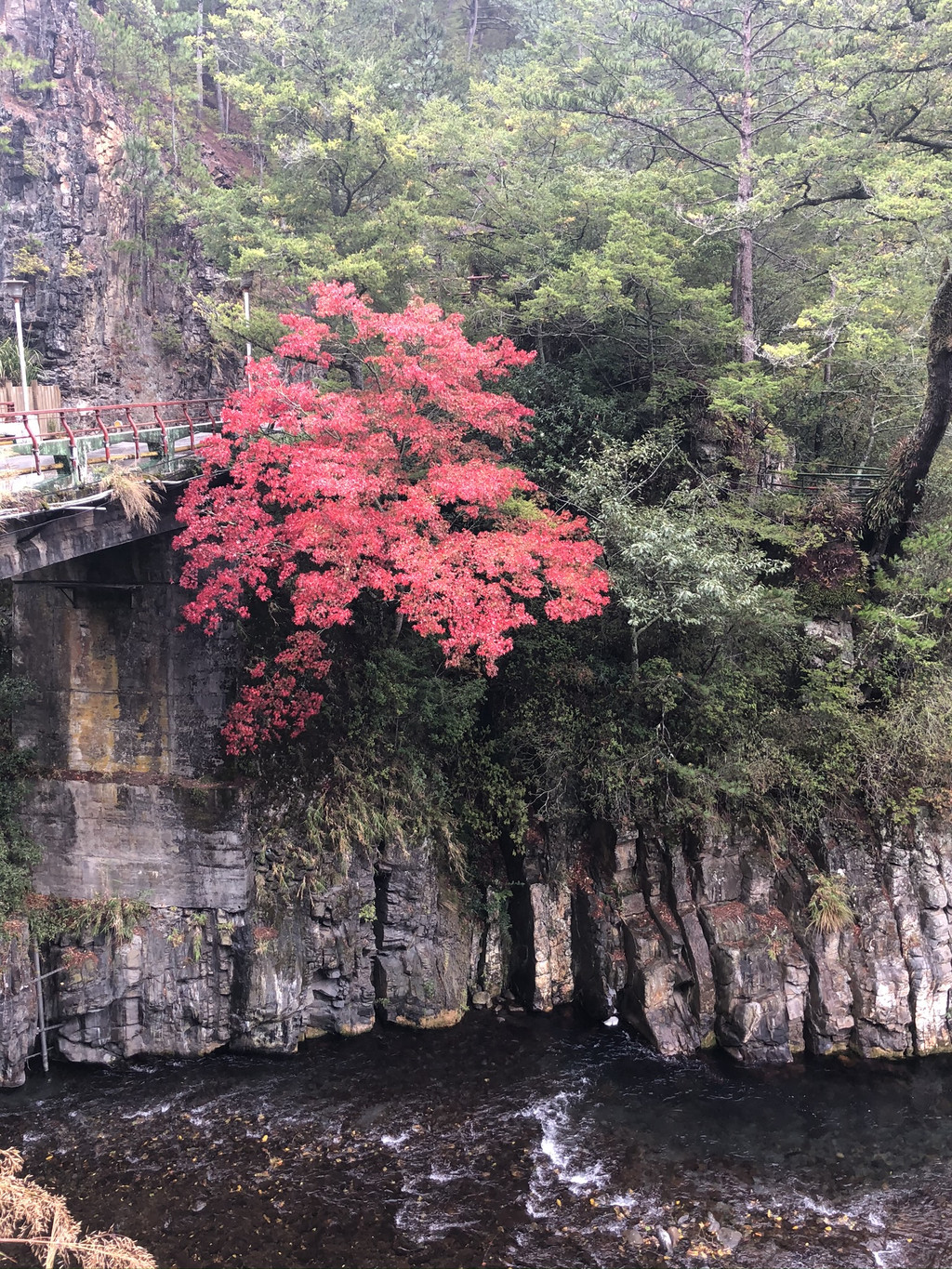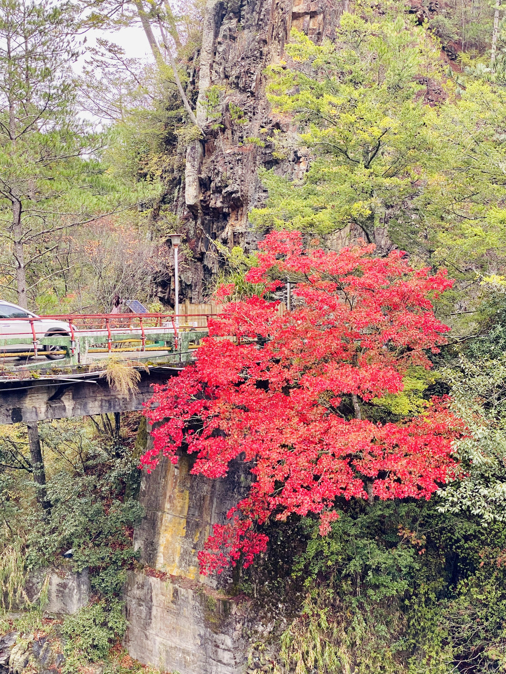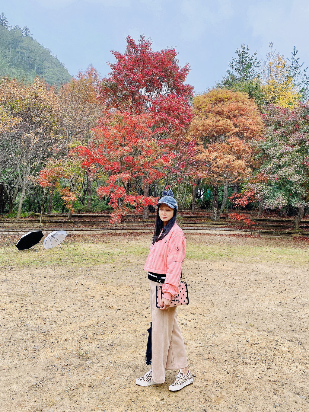 一夜的好眠,第二天想要避開人群再去楓林木屋旁的紅葉廣場拍些美照,因為賓館後面廣場紅葉林是武陵紅葉的盛地,景色非常的漂亮,所以想利用早餐前的空閒先去拍照。沒想到才7點,人還真不少,原來住在這裏的遊客都有同樣的想法,但比起平時盛況還是少一些人,也比較好取景。在這裏真的是怎麼拍怎麼的美。所以來到武陵旅遊最好是能住上一晚。我們在邊緣找到一處沒什麼遊客集中在拍照的地方,拍照很美,算是我們的秘境,我們拍的超開心,還可以玩跳躍。