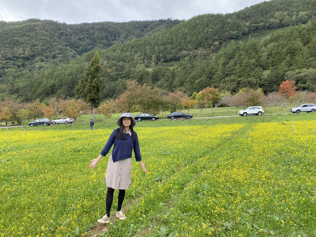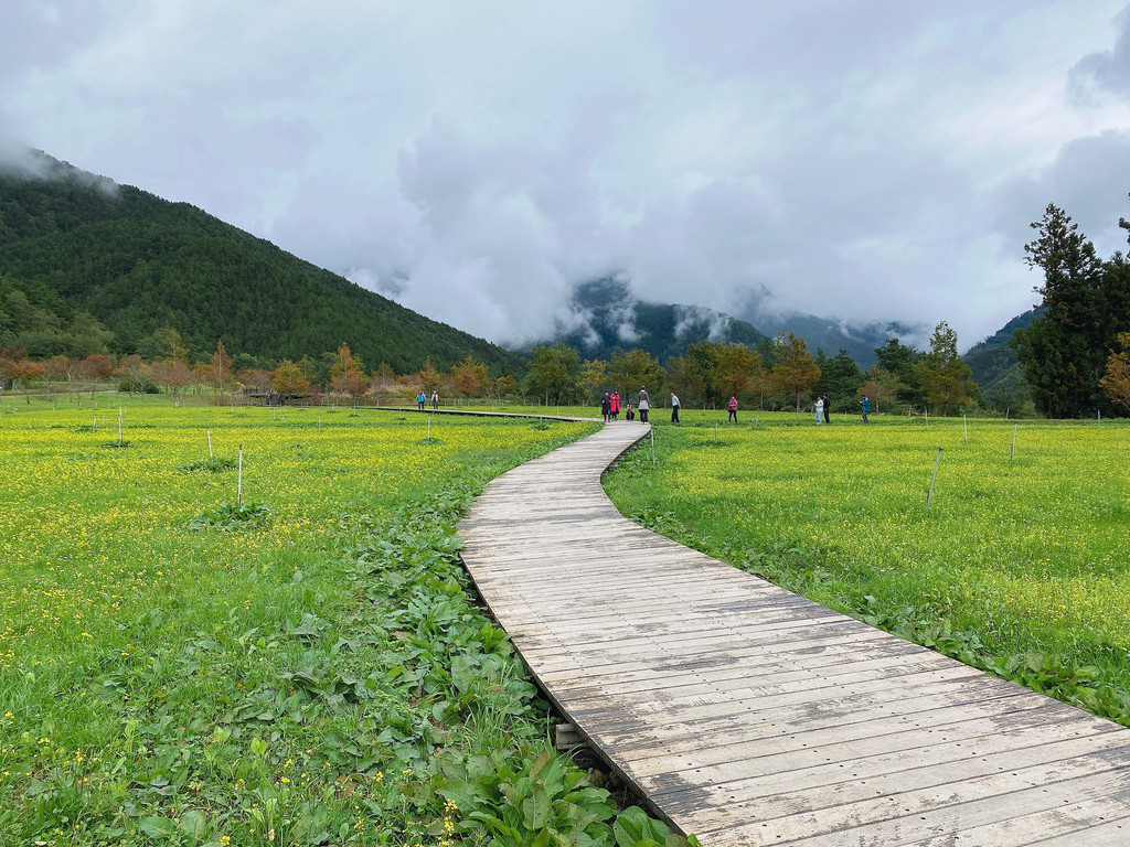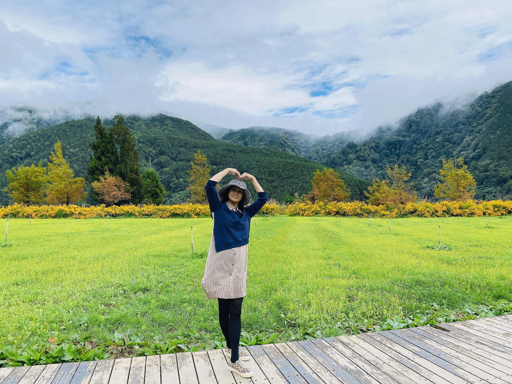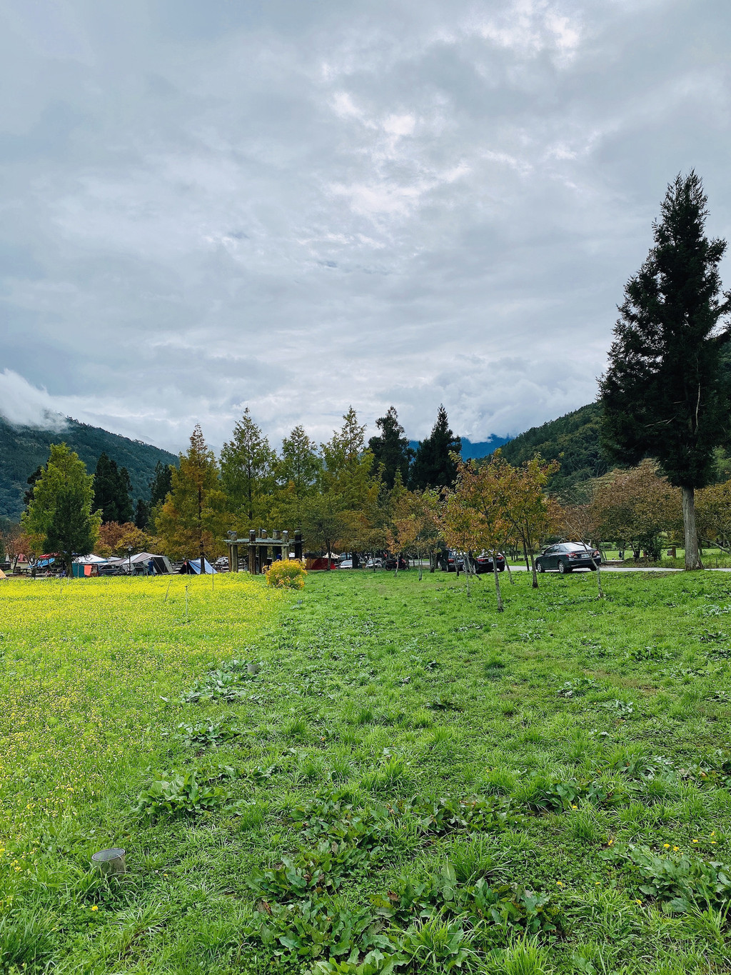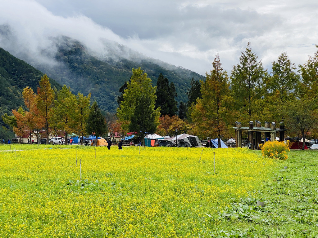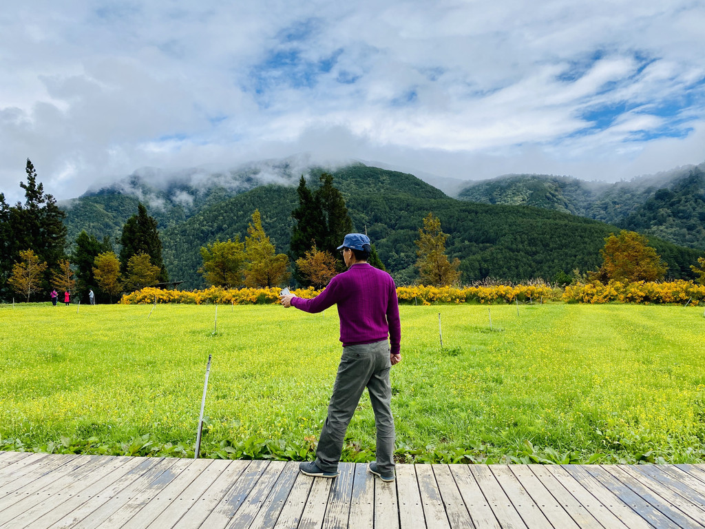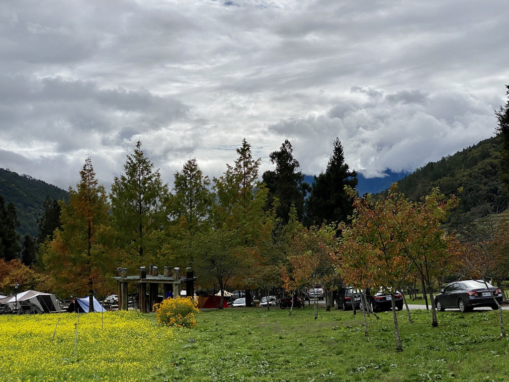 下一站我們來到了花海區,這是在露營區的後方,這是一大片的油菜花田,不過現在還不算是油菜花盛開的季節,所以還沒有黃澄澄的金黃色花海,但一片綠再點綴些許的金黃,搭配一旁雲霧渺渺的山巒及變色的落羽松,也是一片美景。