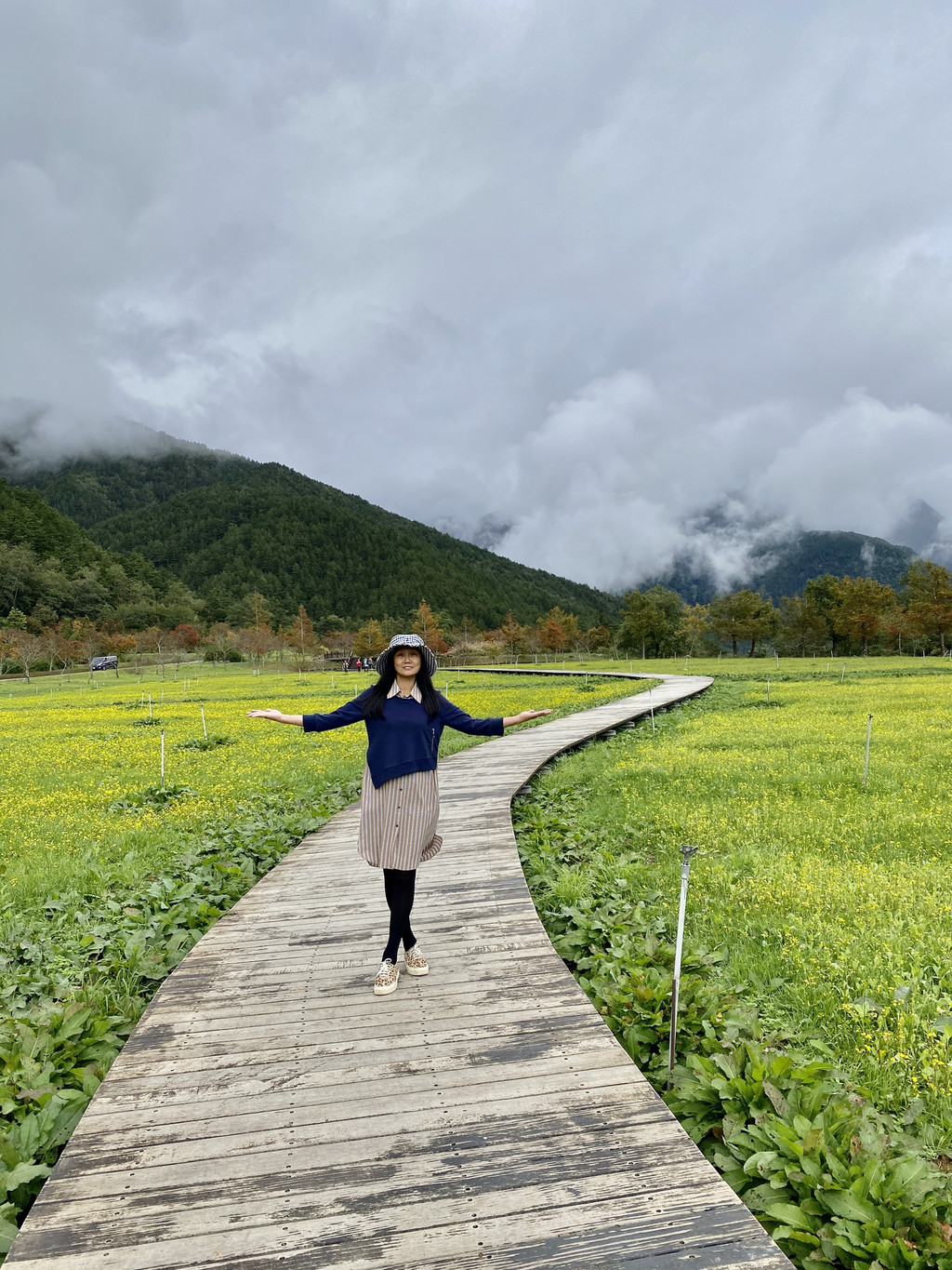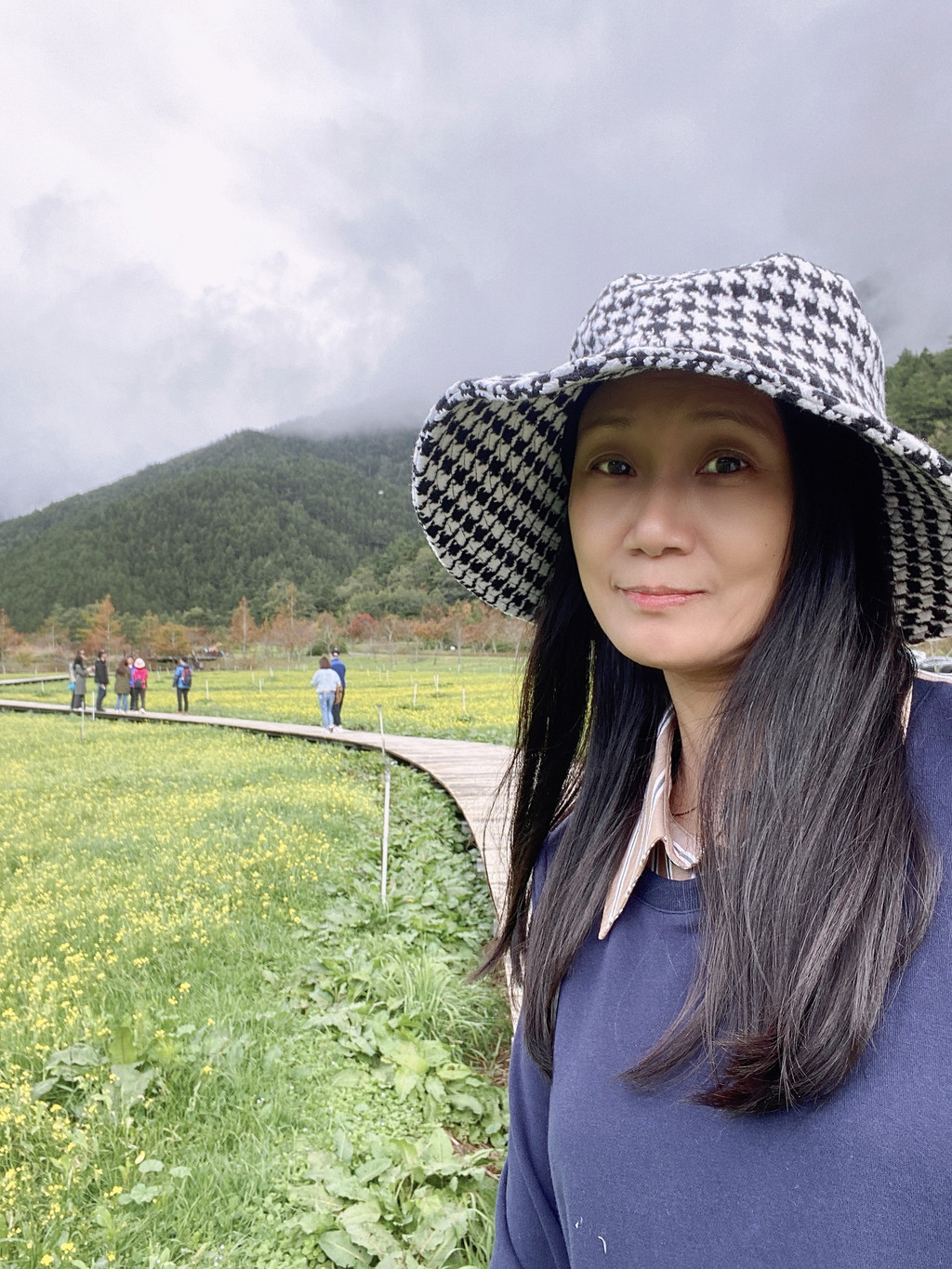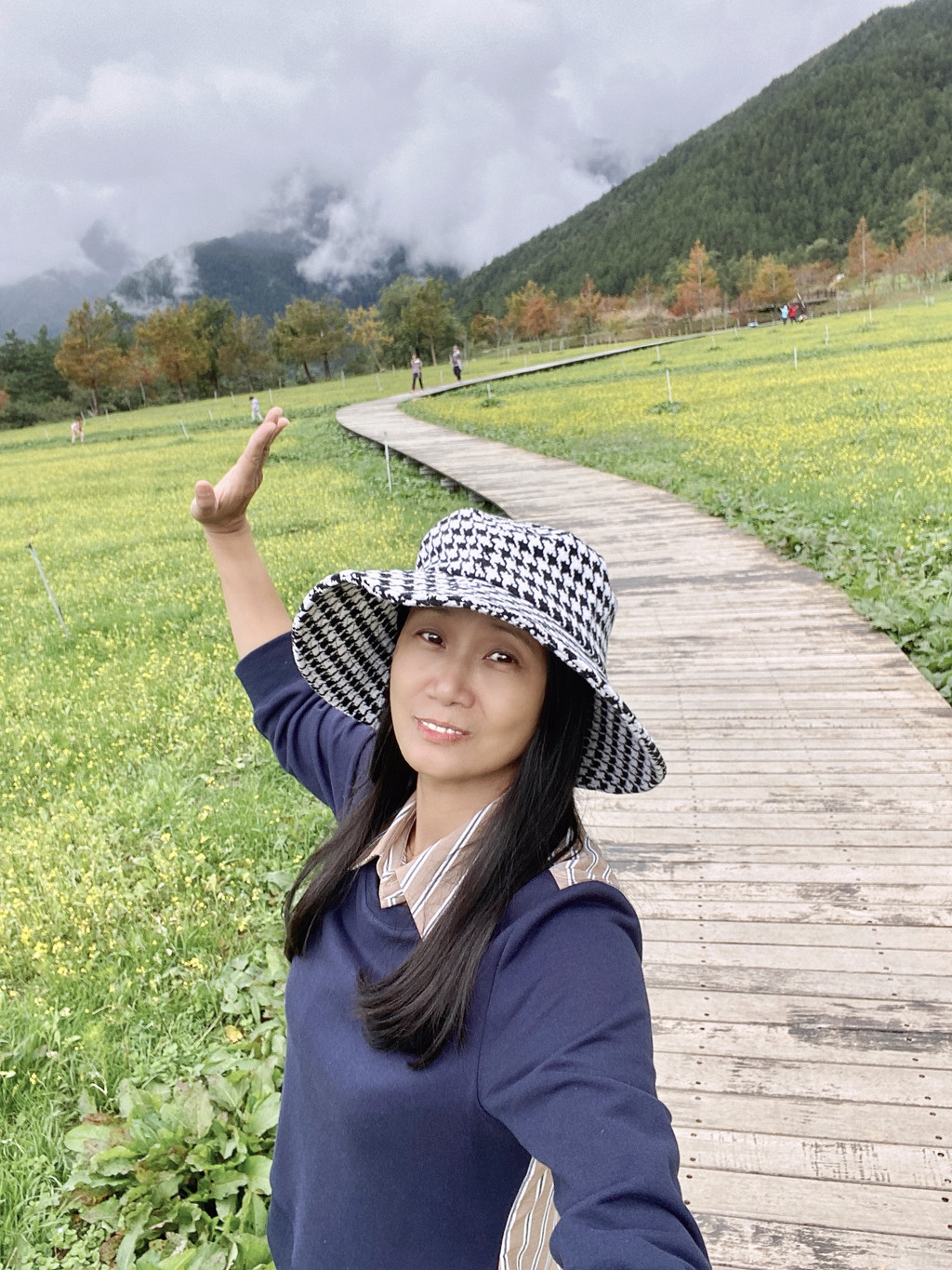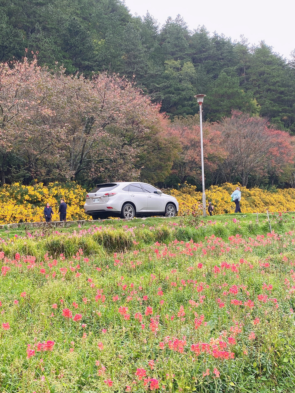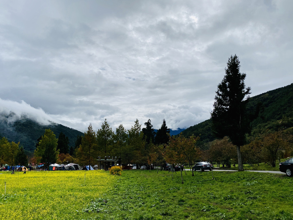 下一站我們來到了花海區,這是在露營區的後方,這是一大片的油菜花田,不過現在還不算是油菜花盛開的季節,所以還沒有黃澄澄的金黃色花海,但一片綠再點綴些許的金黃,搭配一旁雲霧渺渺的山巒及變色的落羽松,也是一片美景。