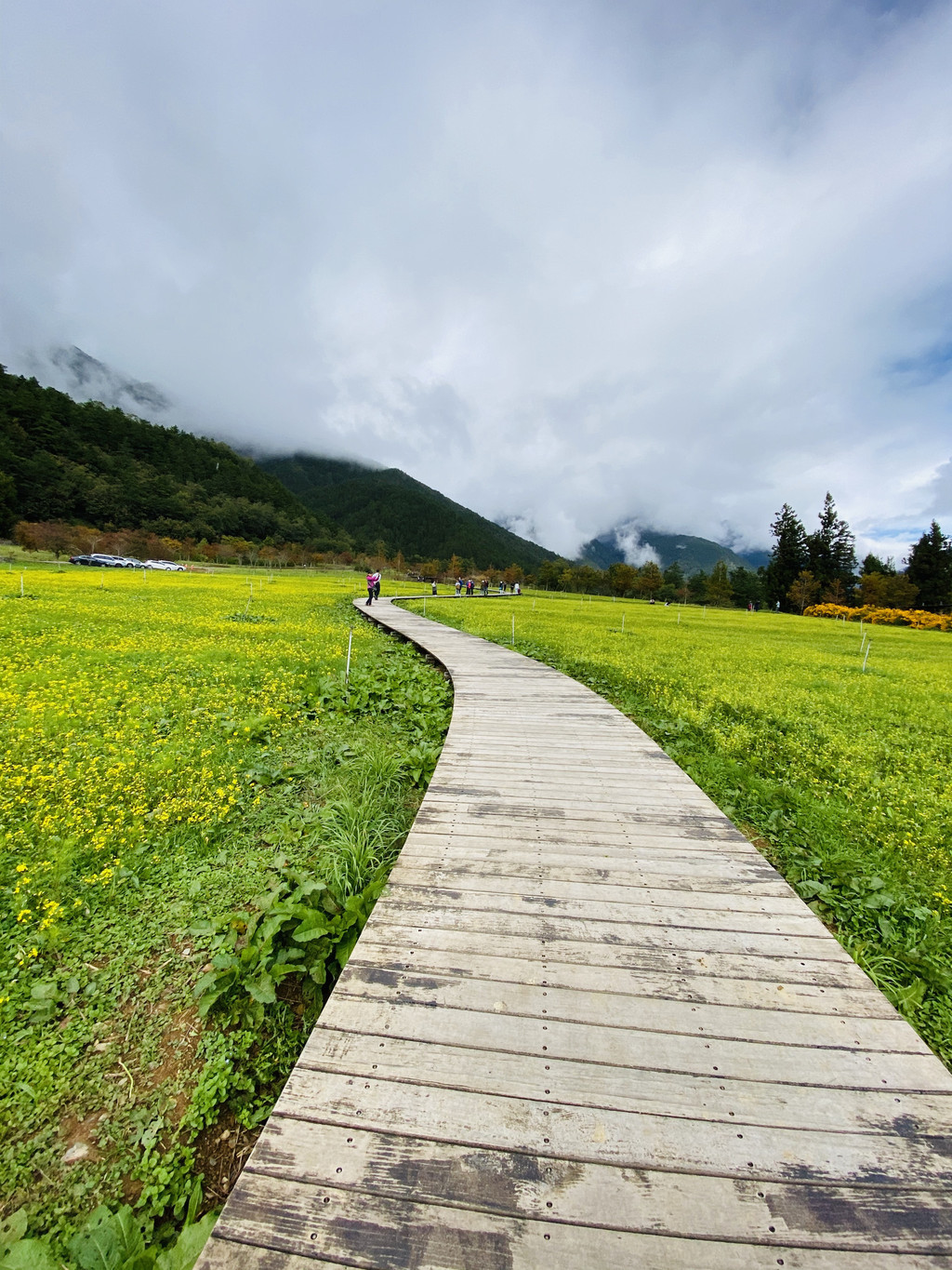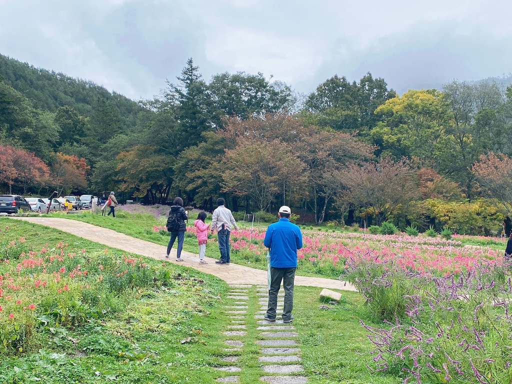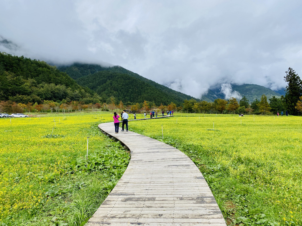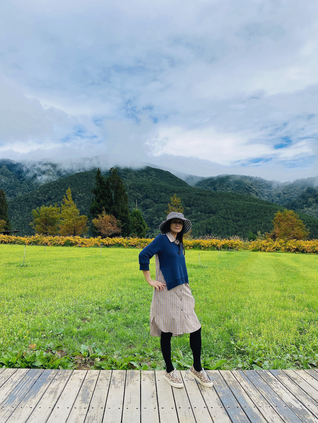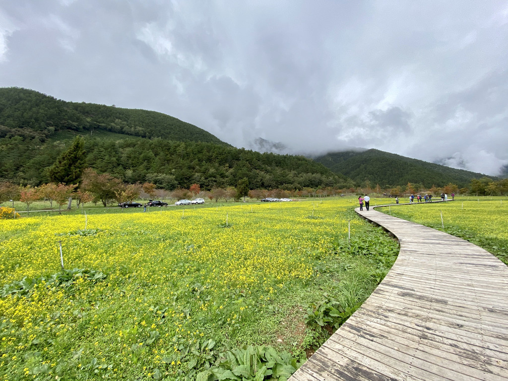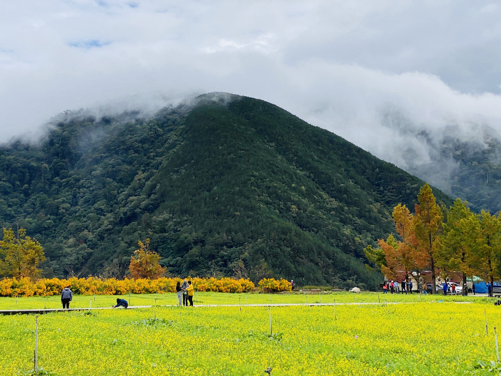 下一站我們來到了花海區,這是在露營區的後方,這是一大片的油菜花田,不過現在還不算是油菜花盛開的季節,所以還沒有黃澄澄的金黃色花海,但一片綠再點綴些許的金黃,搭配一旁雲霧渺渺的山巒及變色的落羽松,也是一片美景。