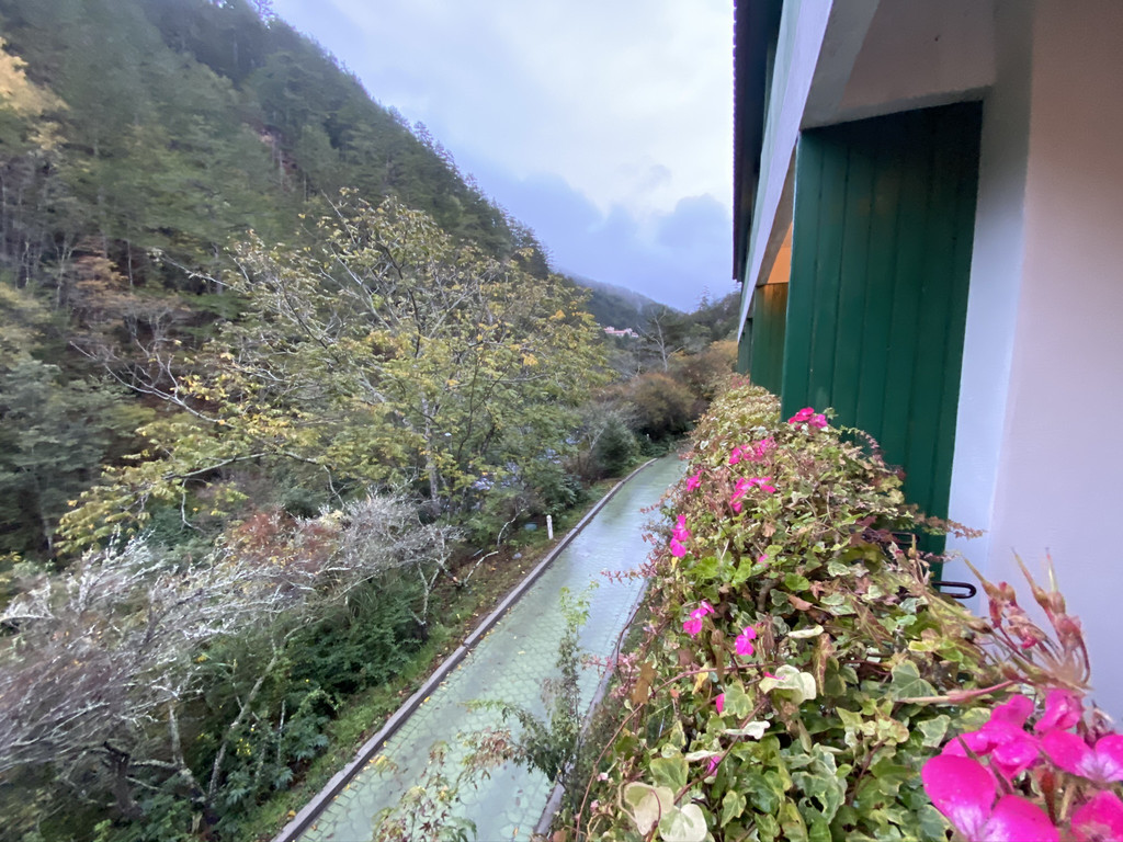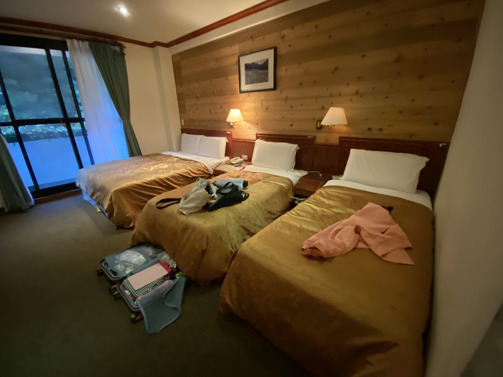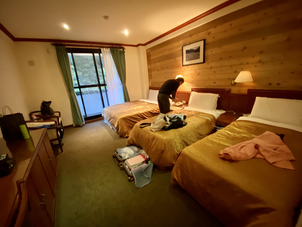大約12點的時候我們先去check-in,希望可以有二張大床的房間,但是得到的答案是沒有了,可能都被團體客先搶了,只有二小床及一大床的房間。四人房原價是4993元台幣,但是軍公教人員可以打七折,若只有二人入住還可以扣除二人的早晚餐費用。早先我從網路上看來的文章都說國民賓館的房間設備非常的老舊,所以我當時有點糾結,但又訂不到武陵富野渡假村,心想能有地方住就要偷笑的心態,就將就點了吧。但沒想到比我想像中的好很多,除了地毯舊一些,傢俱舊一些,但床頭牆上釘的木板應該有更新,房間的空間很大,房間內沒有冷暖氣,但床上附有電毯可保暖。這個電毯真的蠻保暖的,晚上我鑽進被窩裏就不想再離開床一步。房間還有陽台,可以在外面透透氣或者看看外邊的風景也是不錯。我個人覺得武陵國民賓館的地理位置真的很棒,賓館後面廣場的紅葉及落羽松真是美極了!