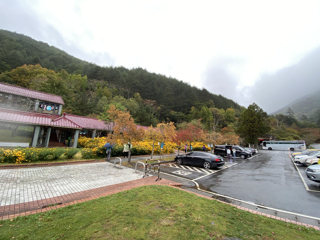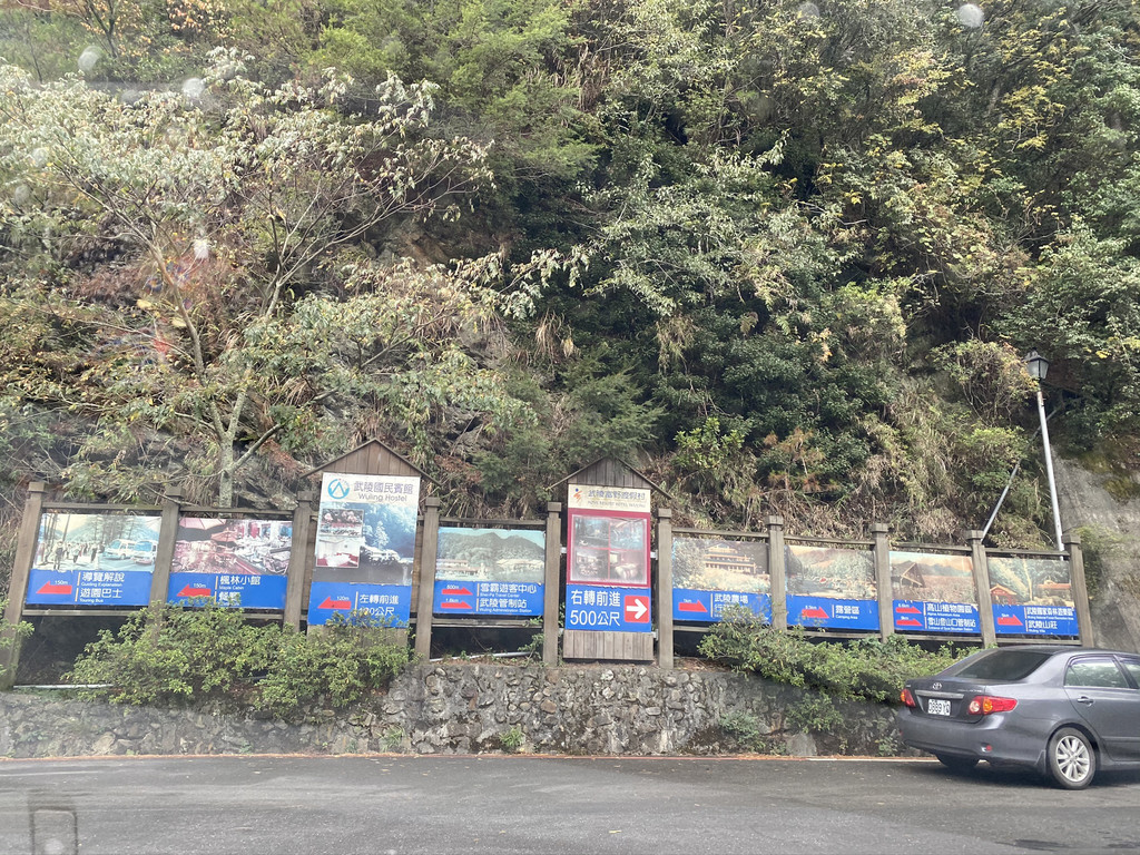 早上7點半從台北出發,走國道五號經雪山隧道到宜蘭,經員山(台七線)到棲蘭(台七甲線),經過南山部落到武陵農場,約11點多到達,行車時間約3.5小時。但從進入宜蘭開始就一直飄雨,雨勢還不小,一路的盤山公路,覺得還是有點危險。原本風和日麗時,整個山區的風景很美,但今日下雨整個山區雲霧飄渺能見度不佳,會有些像是在仙境的感覺。因為一直在山裏盤旋,不耐坐車的人可能會暈車嘔吐。