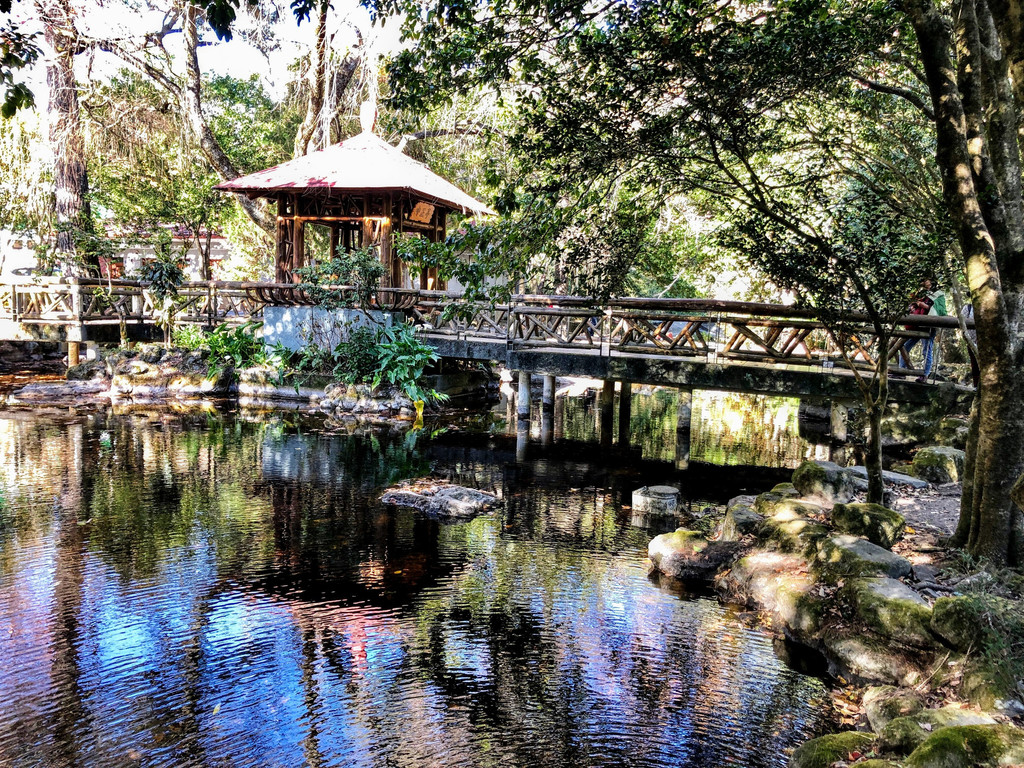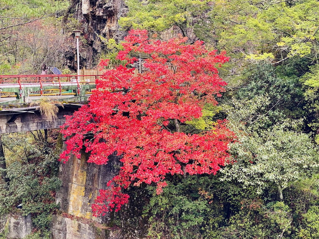 因為3點過後才能去取房卡進房,利用空檔我們就先去周圍景區逛逛。萬壽橋位於農場的最前方,過售票口進來後一定會經過此處,遊客必須在此處選擇左轉往武陵賓館或往右轉往遊客中心。夏天的萬壽橋或許不怎麼起眼,但是在秋天時候就令人眼睛一亮,橋邊那唯一的一棵楓香,火紅的紅葉在萬綠叢中非常的搶眼,吸引一堆遊客在此拍照。