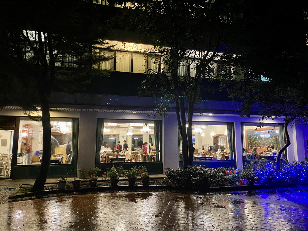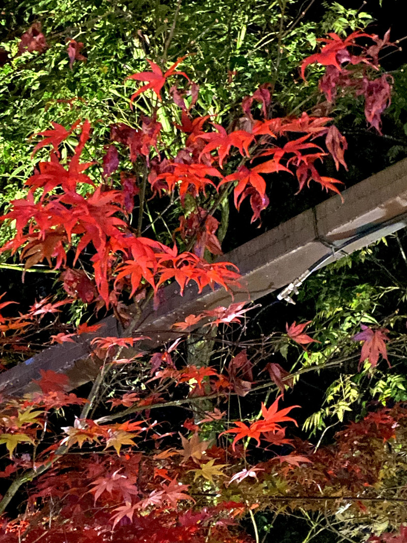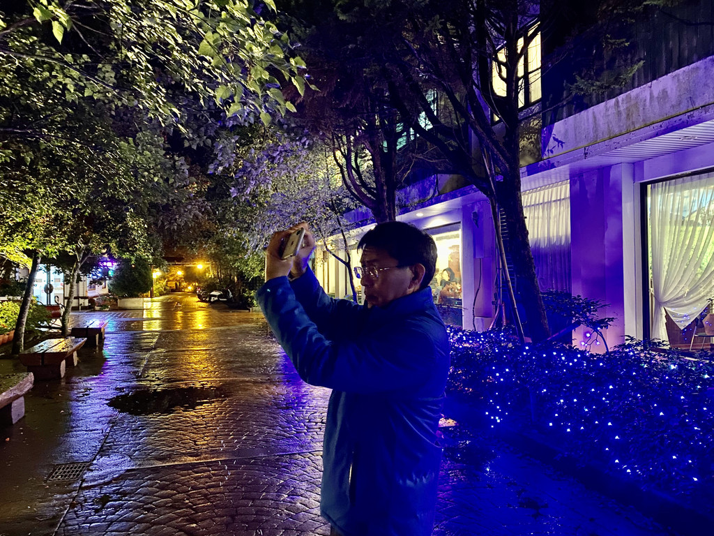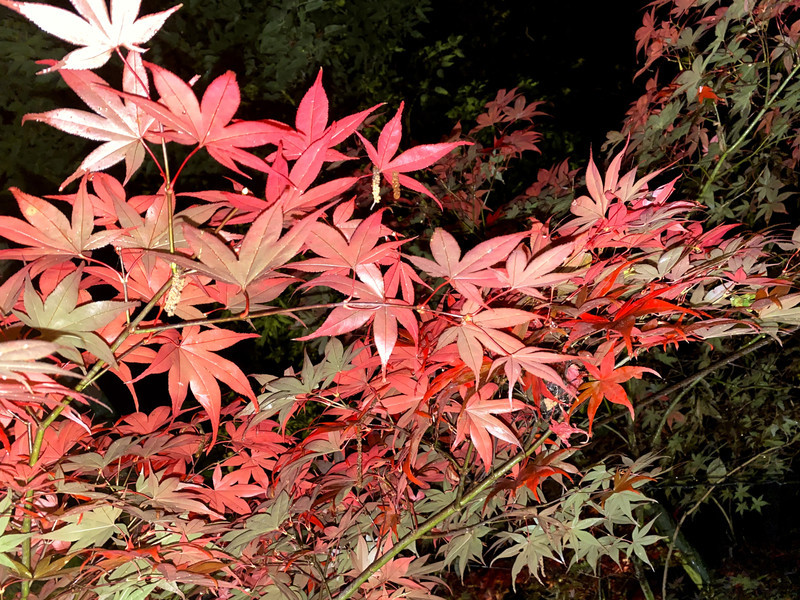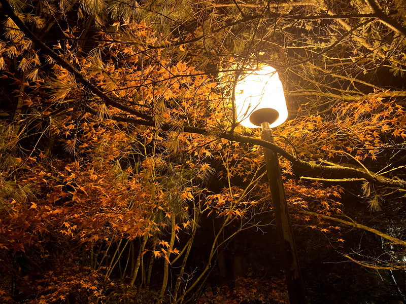 這次可以住宿在武陵農場才有機會看到夜楓,在國民賓館餐廳用過晚餐後,雖然外面氣溫有點低有點冷,但還是抵不住誘惑想要去後面的廣場看夜楓,這是很難得的經驗。白天的楓紅是奔放是艷麗,夜晚時刻的楓紅是神秘是含蓄是安靜,二種不一樣的表態。但晚上的小廣場停滿了小汽車,有點破壞景觀。