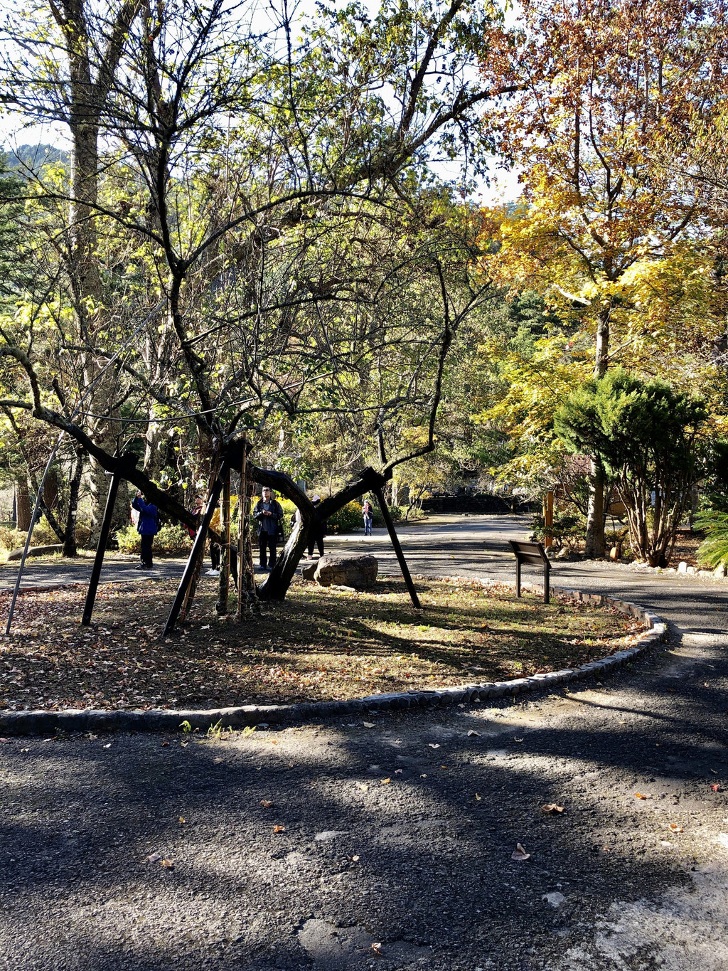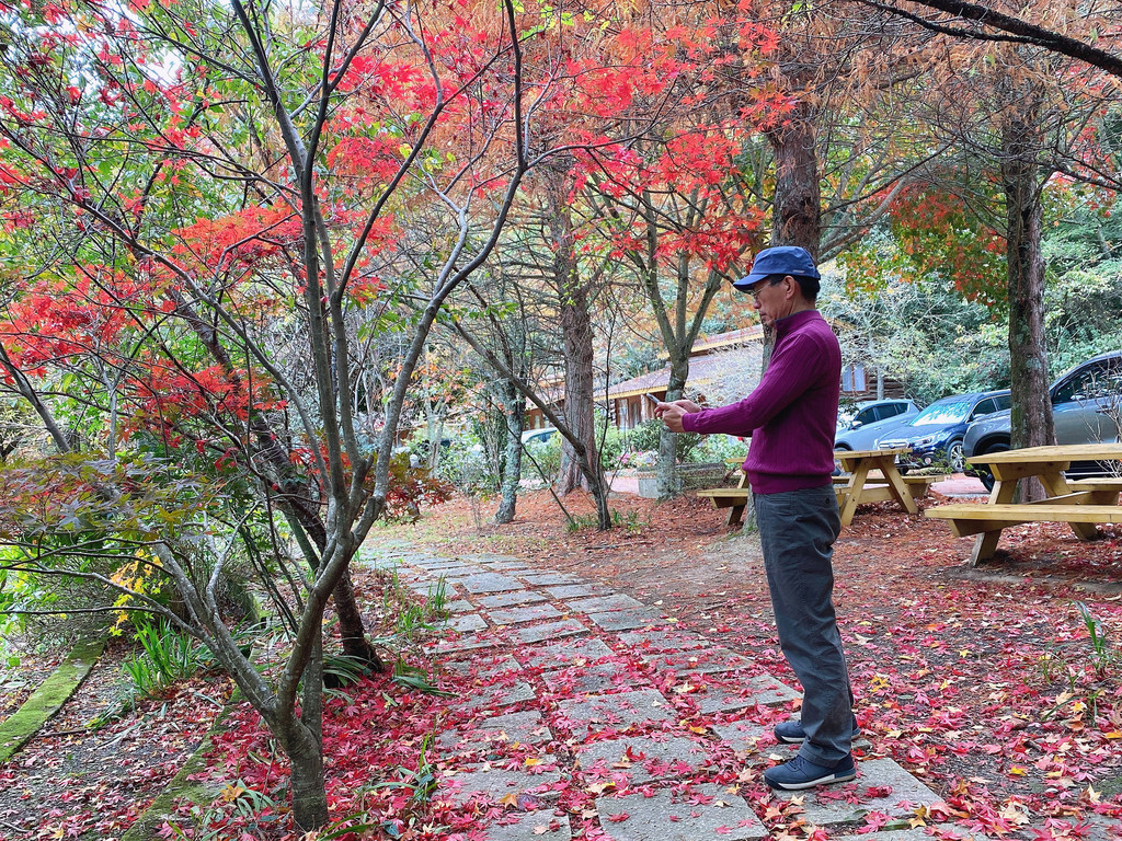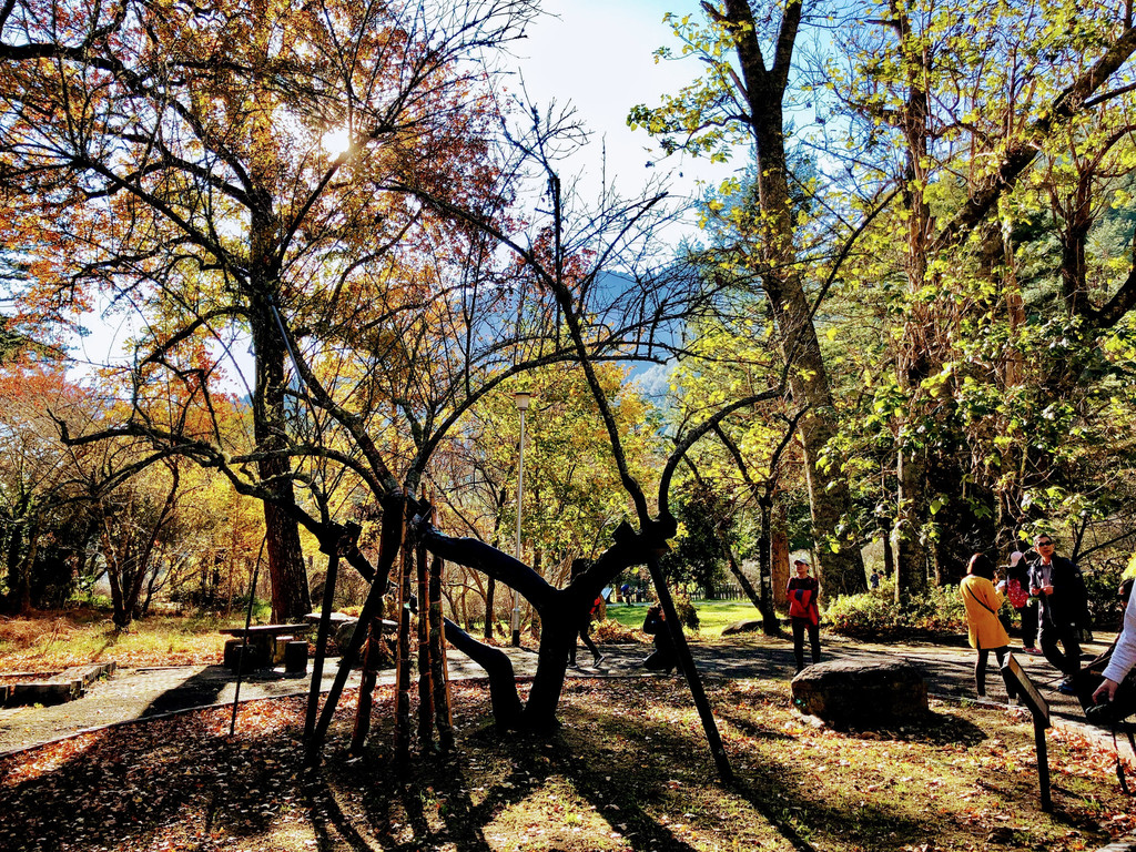 因為武陵國民賓館要下午3點後才能入住,所以我們就先到賓館後面的紅葉林圓形廣場拍照。每年秋季是武陵國民賓館最美的季節。國民賓館本棟後面有歐式林間木屋、楓林小館,再過去是一片的楓樹、落羽松、水杉,這兒是遊客拍照的勝地。因為很集中,所以拍起來特別的漂亮。即便只是樹下的任何一座木椅,都可拍出很有秋天氣息的美麗小品。落羽松、青楓、楓紅把整個廣場染成橘橘紅紅黃黃的熱鬧極了。