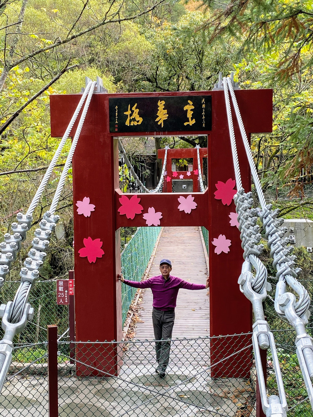 我們今天要往北口方向遊覽,先往桃山瀑布方向。我們先來到了京華吊橋,這座吊橋橫跨七家灣溪,於今年七月七日開幕啟用,橋名為「京華橋」寓意為天地萬物繁華昌盛。並由李秉圭大師提字贈墨。這座橋是因為武陵農場近年來遊客遽增,為保遊客安全防止遊客與車爭道於吊橋舊址規劃興建。走在紅色的京華吊橋上可遠眺桃山,青山白雲綠樹溪水,景色宜人。