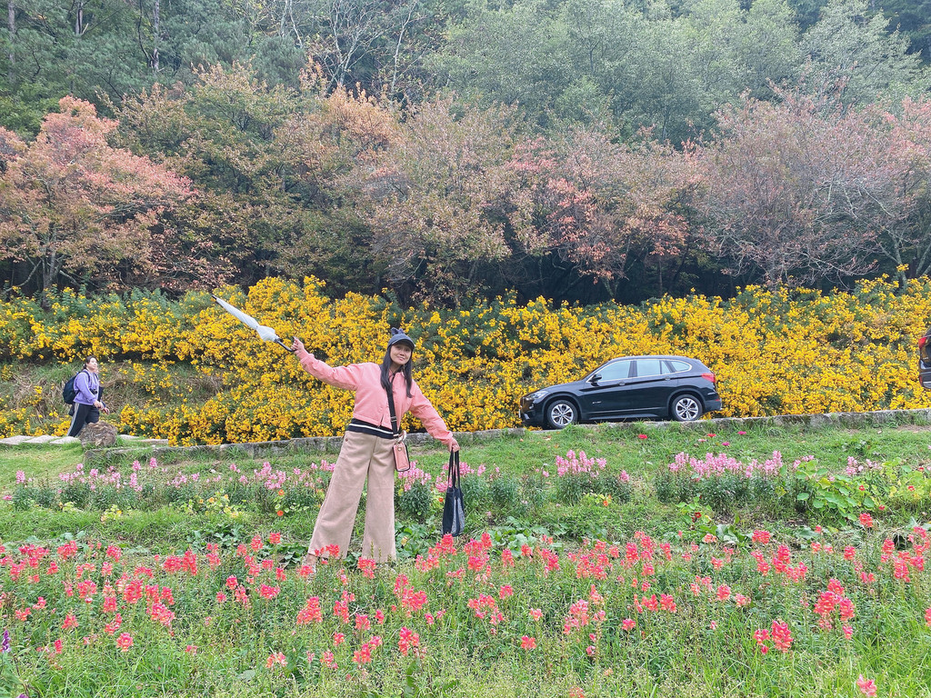 在入口花園處的路邊有一排金黃芳香萬壽菊的花牆綿延,像個花瀑,好多遊客都停下車或停下腳步穿梭在花叢中拍照,讓人一入園就拍個不停。