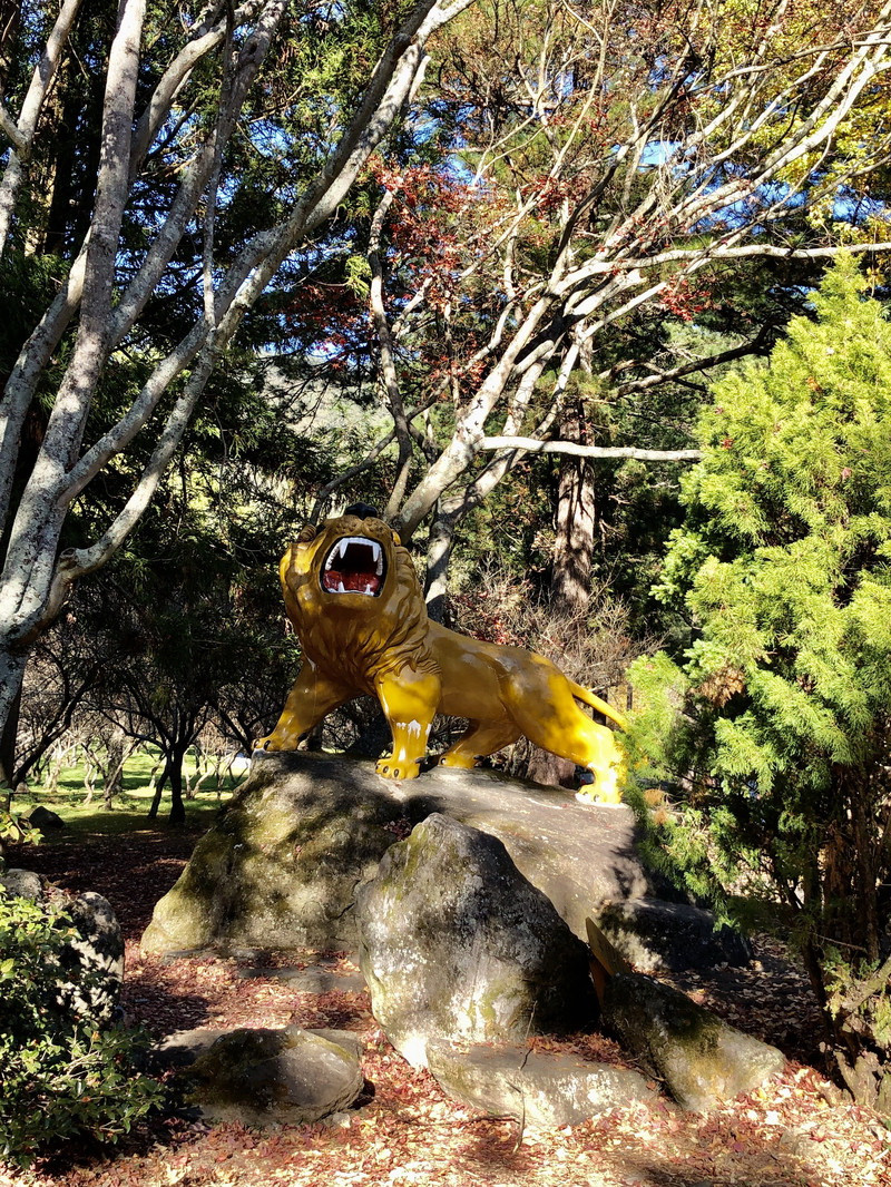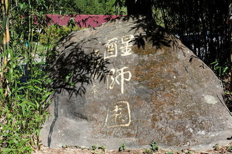 而後穿過筆直高聳的松林大道,旁邊一大片草坪綠地,再過去就可看到醒獅園的大獅子。據說是為了當初在此開墾荒地的榮民伯伯們,能夠鎮壓住瘴癘之氣,國畫大師張大千先生建議由獅子擔當,而且要有非洲雄獅一般的霸氣,因此得名。除了這座吼獅的塑像,一般遊客沒注意到還有一座石碑,碑上的題字是張大千先生的墨寶,寫著醒師園。以前的武陵農場是由國軍官兵在此開墾,張大千大師題這句「醒師園」是在鼓勵此地的國軍弟兄。