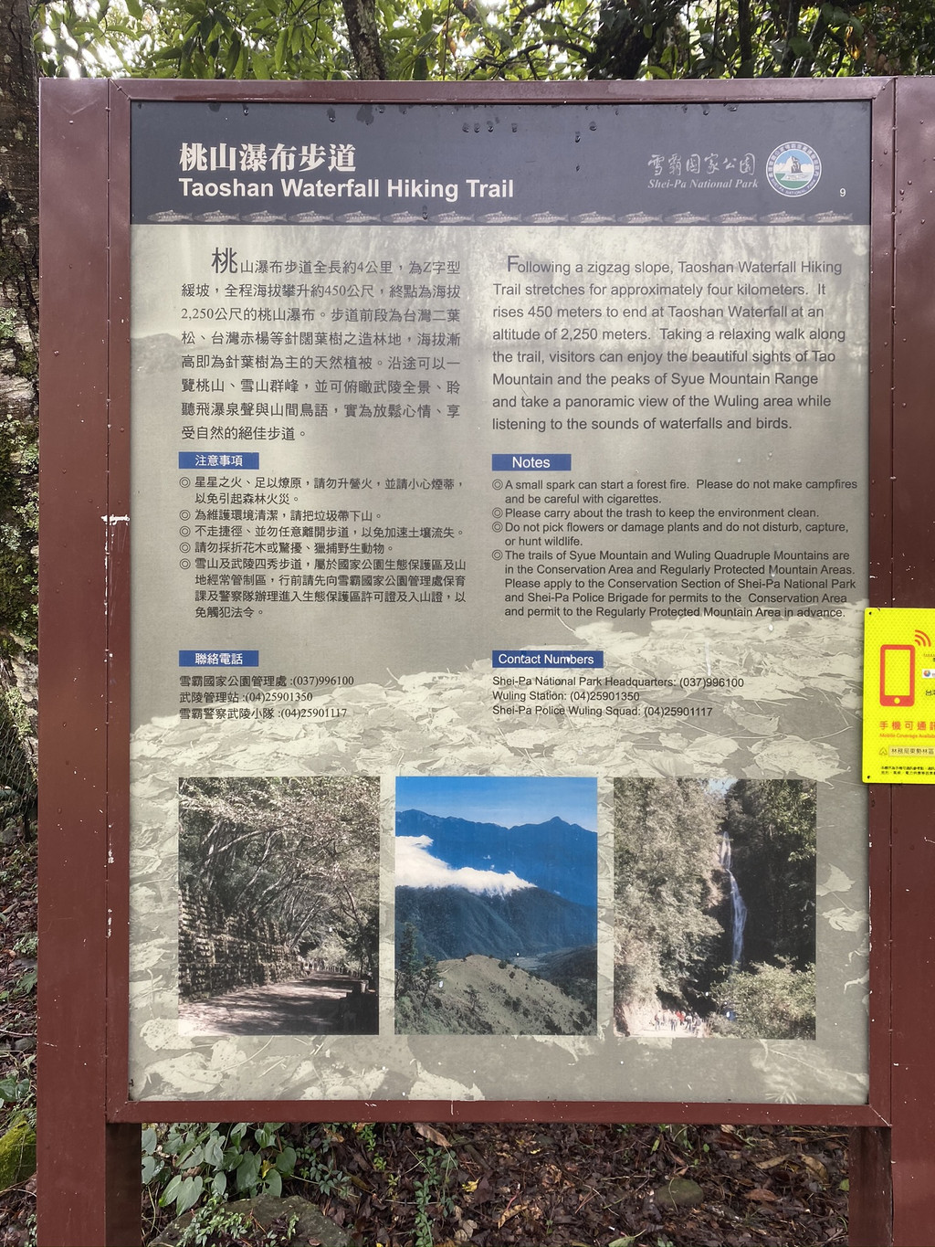 這裏是武陵國家森林遊樂區的範圍。其位於台中市和平區,屬於雪山山脈系統,區內的七家灣溪為大甲溪之上游,其西岸的河階台地廣大,即為「武陵農場」的所在地,由此向北的松林茂密處,桃山步道、桃山瀑布為武陵國家森林遊樂區。