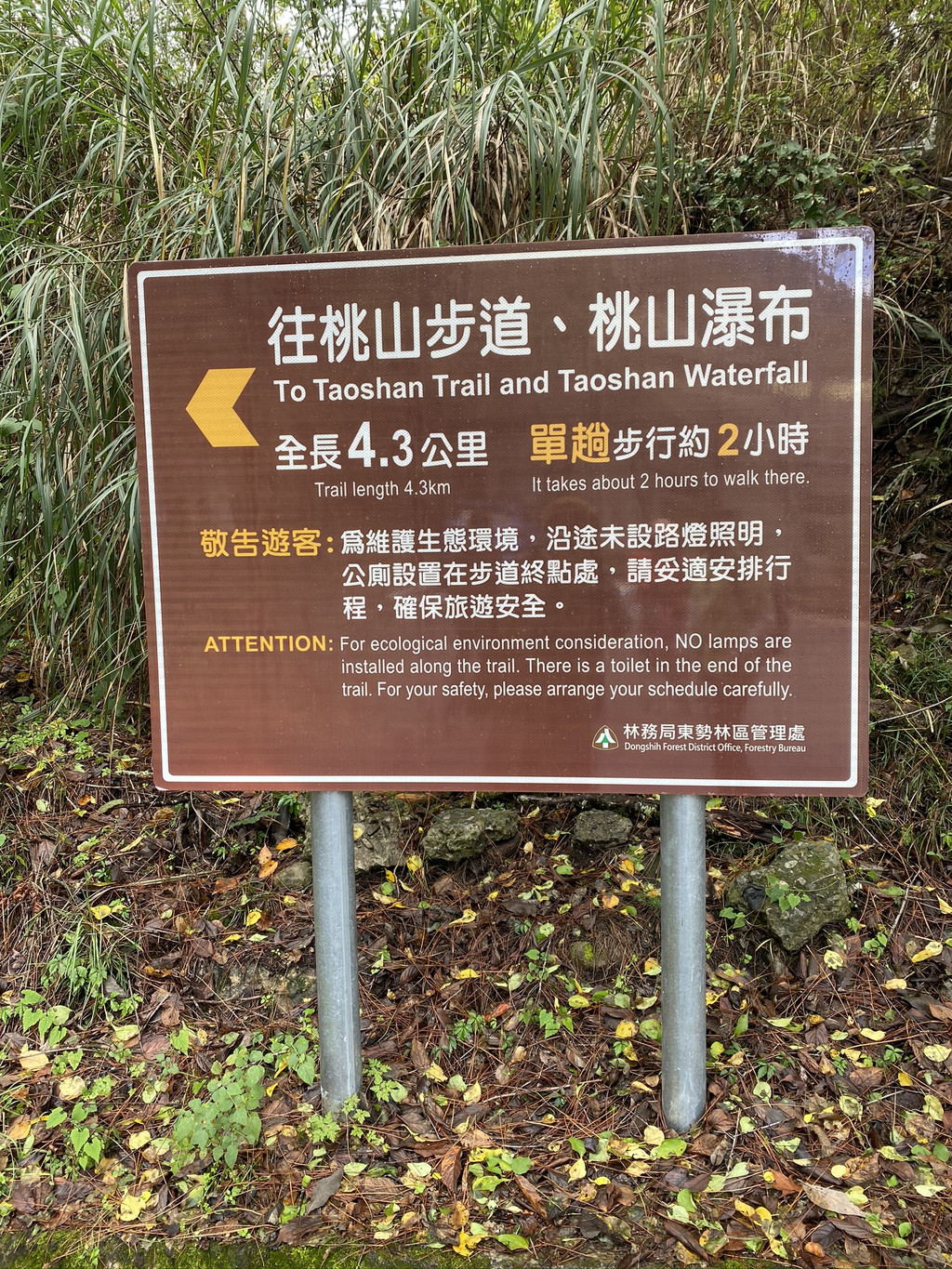 桃山瀑布位於七家溪上游之一的桃家溪,海拔約為2250公尺。桃山瀑布步道全長4.3公里,全程海拔攀升約450公尺,往返約需3-4個小時之久,進入步道前行一小段會先來到武陵吊橋,跨越桃山西溪,走在吊橋上可以清楚遠眺四周的群山風光和清澈的桃山西溪,回程我們趁吊橋上沒有其他遊客,我們還在吊橋上拍攝跳躍的片段,蠻有趣的。過了吊橋後,轉為上坡路,筆直的水泥步道,二旁有香杉、台灣杉等高聳矗立。所謂的台灣杉是以「台灣」當人竹木「屬名」的祼子植物,分布於中央山脈的中海拔山區,是台灣針葉五木之一。因為我們今天中午就要回程台北,所以不能去到終點的桃山瀑布,但有來到桃山登山口走了一小段也心滿意足了。
