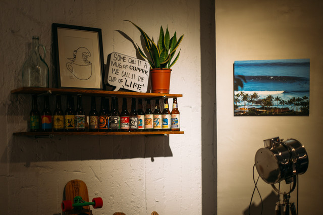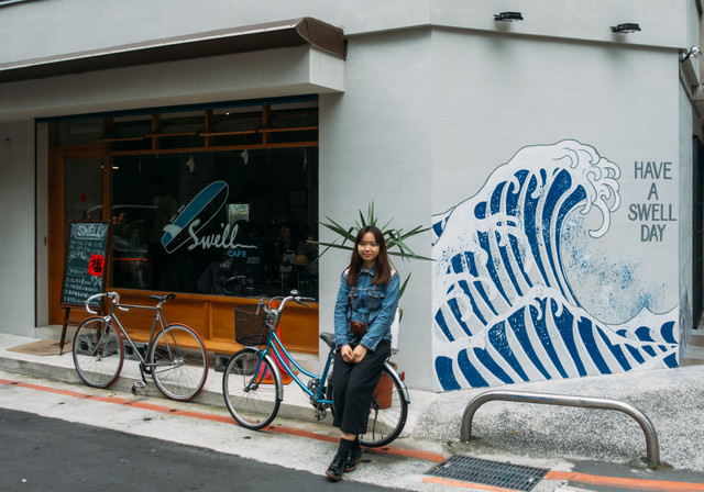 SWELL CO. CAFE,这是一家冲浪主题咖啡店,假日的午后店内几乎满座,聊天的、写作业的、发呆的都有。店内满满的冲浪元素装饰,但最抢眼的还是外墙上的壁画《神奈川的浪》。我厚着脸皮请在路边抽烟的小哥哥帮我拍照留念。