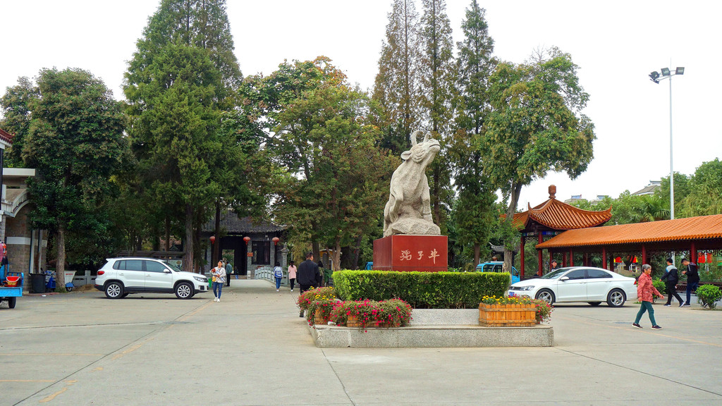 门楼进入是一个小广场。广场正中孺子牛的雕塑,一侧是各种门店,另一侧是风雨长廊。广场两侧是停车位。