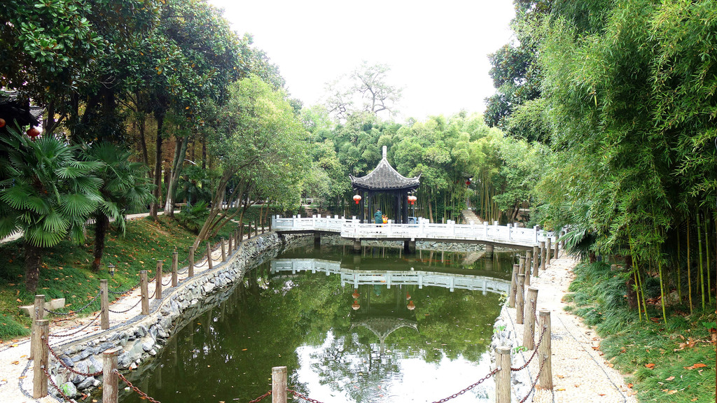 公园中有片片竹林,碧绿的色彩围绕着白玉兰色的九曲桥黑色四角亭,颜色古朴淡雅。