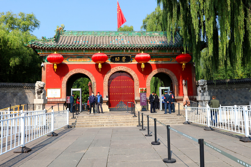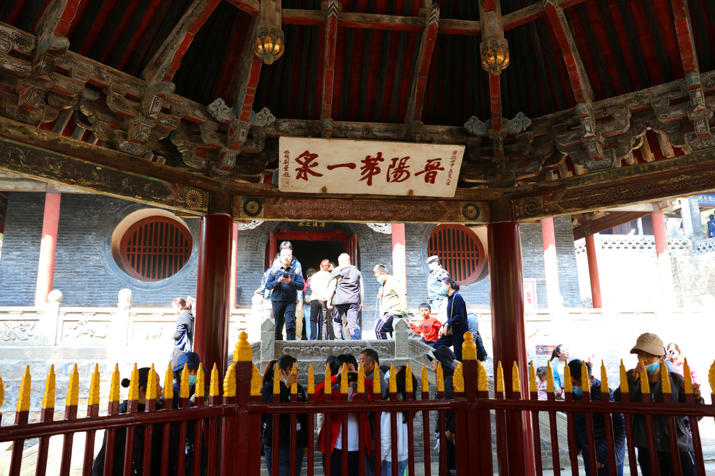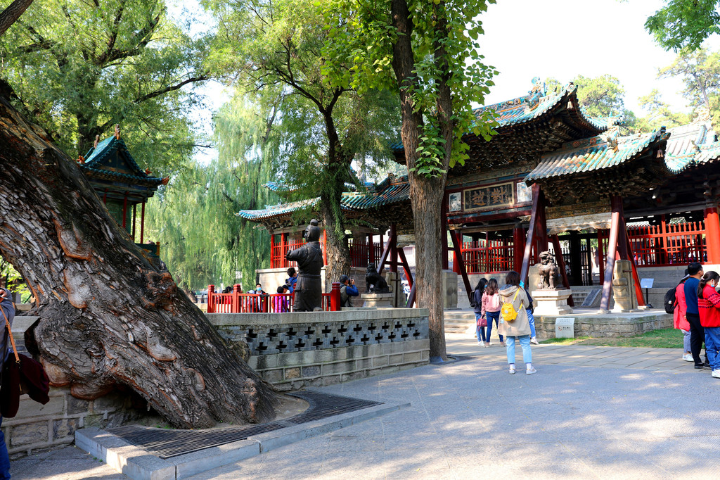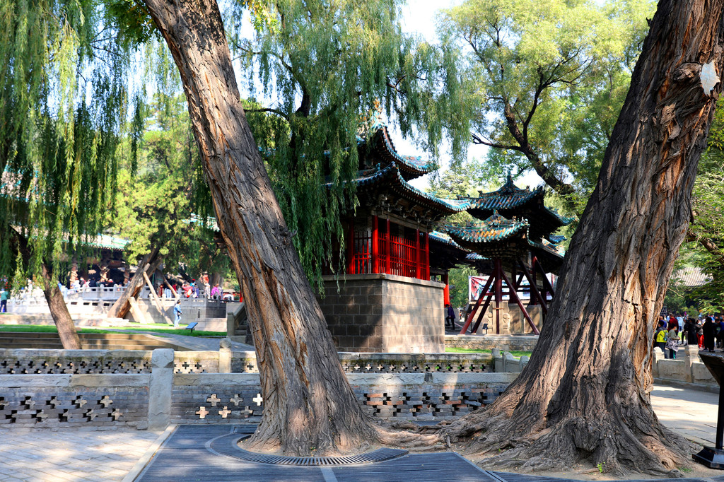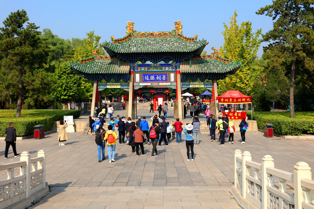 购票进晋祠,一看门口排着长长的队,原来进晋祠先要通过晋祠外围的晋祠公园,晋祠公园是一处免费的公园,不用预约也可以进入,但是要排队测体温和刷身份证,山门上也是写着晋祠,气势很强大,其实真真的晋祠山门还在公园里面很深处,走进晋祠公园,绿草如茵,四周到处是亭台楼阁水榭,不过肯定都是新建的,因为我二十多年前来这里时根本没有这些,现在的晋祠公园里面环境很优美,有点江南公园的感觉,公园的面积非常大,我们下午要去晋中王家大院和平遥古城,重点是看晋祠,所以走马观花、一路匆匆走过晋祠公园直奔真真的晋祠山门,而山门里才是现在正式名称之为的晋祠博物馆,凭票进入外表和晋祠公园一模一样、但规模上要小了不少的真山门,这个山门匾额上的晋祠”两字是有原国务院副总理兼外交部长陈毅元帅题写的。进山门后首先看到的是一座明清时期的建筑——水镜台,这座看起来像庙的建筑,实际上却是一座戏台,面朝晋祠大门一侧,其实是戏台的后台,正中上方挂“三晋名泉”横匾,今天是国庆长假期间,游人不少,来到背面,戏台上正在表演和晋祠历史有关的故事,上面演的起劲,下面看的也热闹。离开戏台向前走是对越坊,对越坊的“对”,意为报答,“越”意为宣扬,二字合起来,即报答宣扬祖先功德之意,或者也可以理解为宣扬母德高尚,穿过对越坊,就到了晋祠三宝之一的献殿,这座建于金代的建筑,完全是由木头与木头以榫卯连接,没有使用一根钉子,殿内悬挂的“献殿”匾额,为金代原物。献殿是祭祀圣母时陈列供品的场所,献殿之后就能看见圣母殿了,不过之间隔着也是晋祠三宝之一的鱼沼飞梁,这座十字形的石桥,建在晋水三泉之一的鱼沼之上,此桥早在一千五百年前就已经存在,在北魏晚期的郦道元所著《水注经》中就对鱼沼飞梁有所记载,走过石桥就是晋祠的主殿——圣母殿,这座规模宏大的建筑创建于北宋太平兴国年间的公元984年,是晋祠三宝中价值最高的一处,站在殿堂外看里面大殿内很宽阔,有梁无柱是一大看点,殿前8个廊柱上雕刻着8条跃跃欲飞的木雕盘龙,而殿堂内就是陈列着被称之为晋祠“三绝”之一的四十三尊宋代彩塑,包括圣母像一尊,宦官像五尊,着男服的女官像四尊,侍女像三十三尊,人们习惯上把他们统称为“宋塑侍女像”,这四十三尊彩塑侍女是晋祠文物中的精华,是晋祠三绝之首,也是中国古代泥塑艺术的珍品,这些彩塑完工于北宋元祐年间,距今已有超过九百年的历史,除龛内两尊小像是明代补塑外,其他皆是宋代原物,主像圣母邑姜,头戴凤冠,身穿蟒袍,霞被珠璎,凝神端坐于中央,一副主人贵妇的仪表气质。现在为保护这些文物圣母殿禁止游客入内,我们只能在门口隔着栅栏参观,门口游客围了一大堆,想仔细看这些彩塑根本不可能,圣母殿外右侧北边的晋祠三绝另一绝周柏倒是可近距离接触观赏,晋祠内古木众多,这棵古柏,树龄在3000年左右,为国家一级珍稀古树,由于它形似卧龙,树身向南倾斜,又名卧龙柏,树干粗两围的古柏与地面呈45度夹角,倾斜依靠于圣母殿的殿顶,更神奇的是,不知何年在这棵卧柏的下方又长出一棵翠柏,支撑住了倾斜的古柏。看完古柏,我们从古柏旁的一条登山小路登上高处的读书台,从这看晋祠博物馆内历代兴建的各种殿、堂、楼、阁、亭、台、桥、榭一目瞭然,这座称得上中国皇家祭祀园林是一处文化内涵极为丰富并且有着重要历史、艺术、科学价值的古建园林,为我们后代留下了一处宝贵的遗产。下高处后我们来的圣母殿另一侧的南面,这里有一座水母楼和难老泉亭,四周围满了游客,难老泉亭匾额上题有“晋阳第一泉”,而这个难老泉也是晋祠“三绝”之一。难老泉至今仍是晋水的主源,常年恒温17摄氏度,水从难老泉涌出后,从一龙口流入一汪清潭,潭中有一道石堰,上有十个直径相等的孔,泉水于此分为两股,南三北七,所以叫做“三七分流”。这里还载有一段历史和故事:山西自古缺水,在一千多年前,这条小溪附近有两个村庄,一个叫南村,一个叫北村,为了争抢水源,两个村庄时有争斗,为了平息争端,县太爷想出了一个“馊”主意,他在溪水前的坝上打了九个洞,又在一个滚烫的油锅里扔进去9枚铜钱,两个村庄各派一人去油锅里捞铜钱,谁捞出几枚铜钱,谁的村子就能得到几孔溪水。北村一个17岁的小伙子挺身而出,跳进油锅捞出了7个铜钱,自己却被烫伤致死,县官因此把七个出水孔判给了北村,北村的老百姓为了纪念那个舍生忘死的小伙子,在溪中建起一座小白塔,把小伙子的白骨埋在了白塔下面。难老泉左南侧还有一组建筑“晋溪书院”、也称“王家祠堂”,主题建筑是子乔祠,这里原是明朝大臣王琼的别墅,建成于明嘉靖五年(1526),园内正室翁溪堂曾设王氏列祖灵位,为王氏祖堂,现在书院里还开了家咖啡馆,挺有创意的。