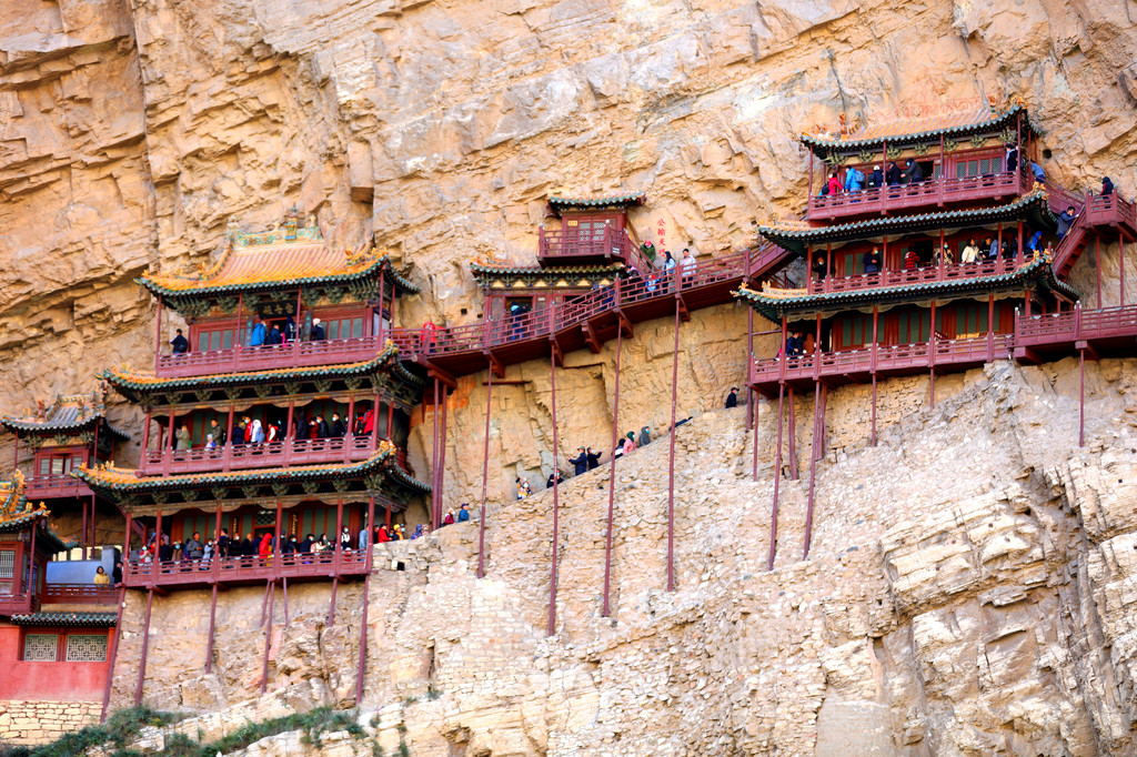 位于北岳恒山第二主峰翠屏峰悬崖峭壁之上的浑源悬空寺,有中国第一空中阁楼之称,这座于公元491年北魏时期建成的悬空寺是一座佛、道、儒三教合一的独特寺庙,以选址之险、建筑曲折出奇、结构多变而闻名,看起来摇摇欲坠、却1500年还能屹立不倒,堪称世界奇观。