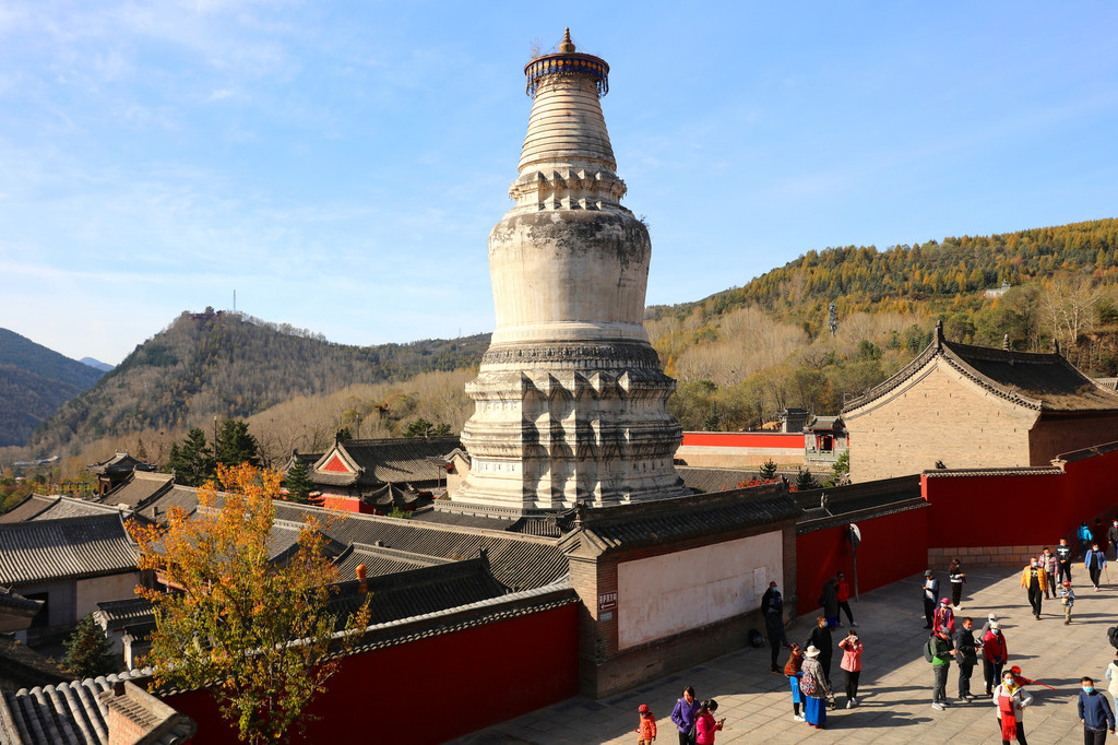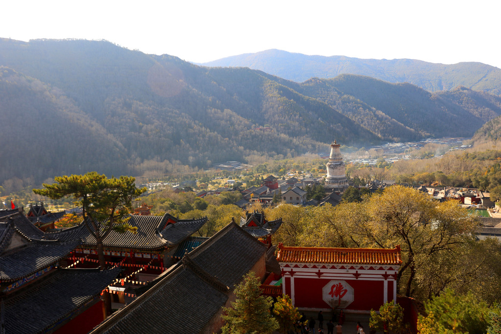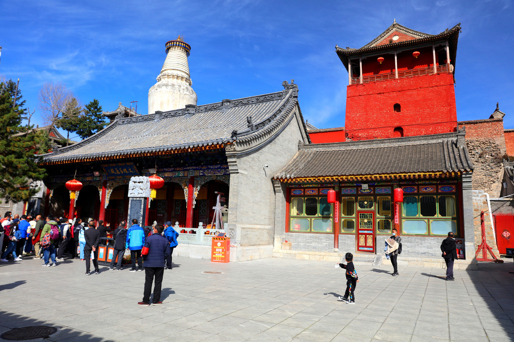 五台山大大小小寺庙二百多座,但对游客开放的仅十之一二,寺庙都不算大,格局也都相对简单。从殊像寺出来已是中午时分,我们决定不再进寺庙参观了,而是沿着台怀镇街头往我们住的客栈方向往回走,今天是个好天气,远处高高的菩萨顶红墙黄瓦在蓝天下格外醒目,而周边白塔高耸,庙宇连绵,和着蓝天白云,一切都倒映在湖水中。
