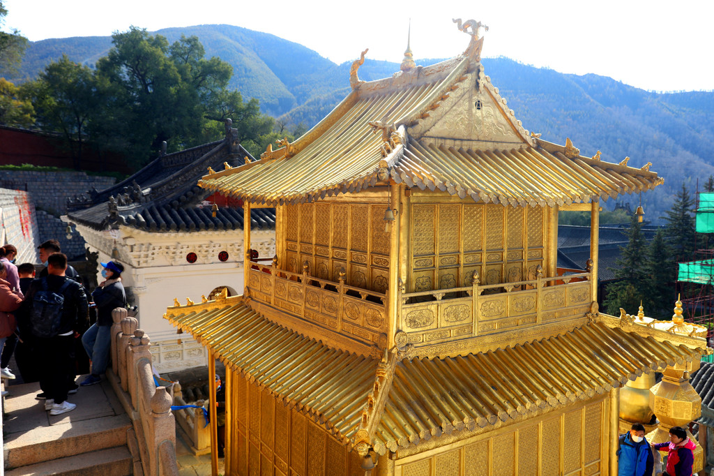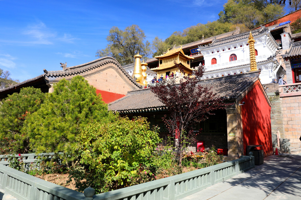 我们慢慢地从菩萨顶下来走到塔院寺,因塔院寺的天王殿供奉的不是弥勒,而是清万历帝的母亲,考虑到皇家的地位,该殿正门终年关闭,需从后门进入,寺中的大白塔可谓是五台山的标志性建筑之一,也是五台山的象征,塔身高大挺拔,气势恢弘,雍容高贵,为四大佛教圣地之首的标志。紧邻塔院寺的是大显通寺,很久以前和“塔院寺”是一体的,不知何故一分为二,进了大显通寺的山门要左拐,走一条100米左右的通道才到寺院,大显通寺是一座有不同建筑风格的寺院,也是五台山最有看点的寺庙之一,建筑中有全木,全砖,全铜建成,也有不同时代建成,所以有人说五台山是“一部佛国寺,百座艺术宫”,这座大显通寺就是五台山寺庙中的一大力作,具有一定代表性。该寺坐北朝南,中轴线上建殿七座,分别为观音殿、文殊殿、大雄宝殿、无量殿、千钵殿、铜殿和藏经阁。远远地,半山腰的铜殿、铜塔和白色的藏经殿十分醒目,最珍贵也是最值得一看的建筑是无量殿,无量殿从外观看似欧洲建筑,并且涂成了白色,殿内是三间穹隆顶砖窑,三个连续拱并列,左右山墙成为拱脚,各间之间依靠开拱门联系,砖窑充分运用了力学的原理,一块块青砖垒砌,向上逐渐收缩,建造技艺精湛,内雕藻井悬空,形似花盖宝顶,是中国古代砖石建筑艺术的杰作,而在无量殿后方,依山势筑起分层次的高台的第二层次上,有显通寺的另一看点-铜殿,铜殿用铜10万斤铸成的,铜殿方形,外观重檐两层,高约5米,四周隔扇上棂花图案和壶门花鸟装饰,殿前原有同期铸造铜塔五座,按东西南北中方位布置,象征五座台顶,现仅东西两座原塔尚存,塔有13层,高8米,塔身满铸佛像图案,底座正方形,四角各铸一尊力士,手托,肩扛或头顶塔身,后又以铁补铸三座塔立于原处,铜殿、铜塔皆饰以金箔,远远看去一片金壁辉煌。