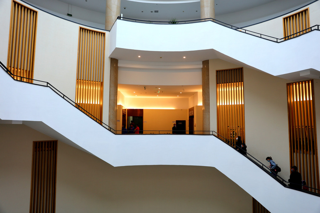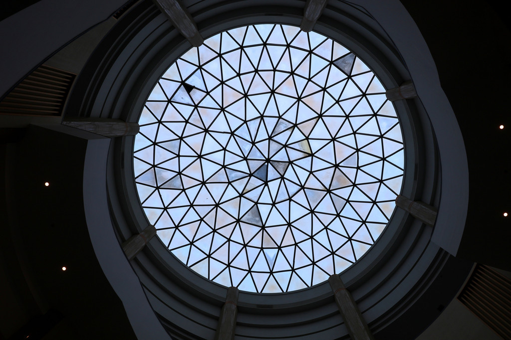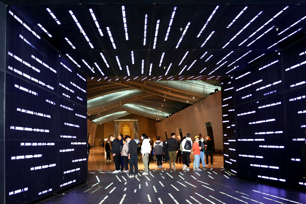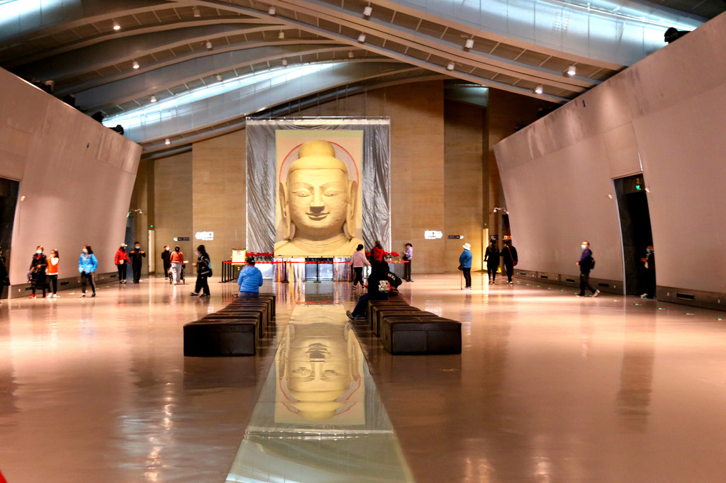 我们从第二十窟露天大佛走向对面山坡下的云冈陈列馆,这是一座半地下具有现代风格的博物馆,整体设计简练大气,跨幅达40米的拱顶,馆前下沉式广场由数道放射状砖壁式通道环形围绕,象征云冈汇聚多元文化的艺术特质。馆内所展示的文物,多为建国后云冈石窟窟前、山顶历次考古发掘出土的文物,也有近年来征集到的流散文物以及从海外回归的文物。