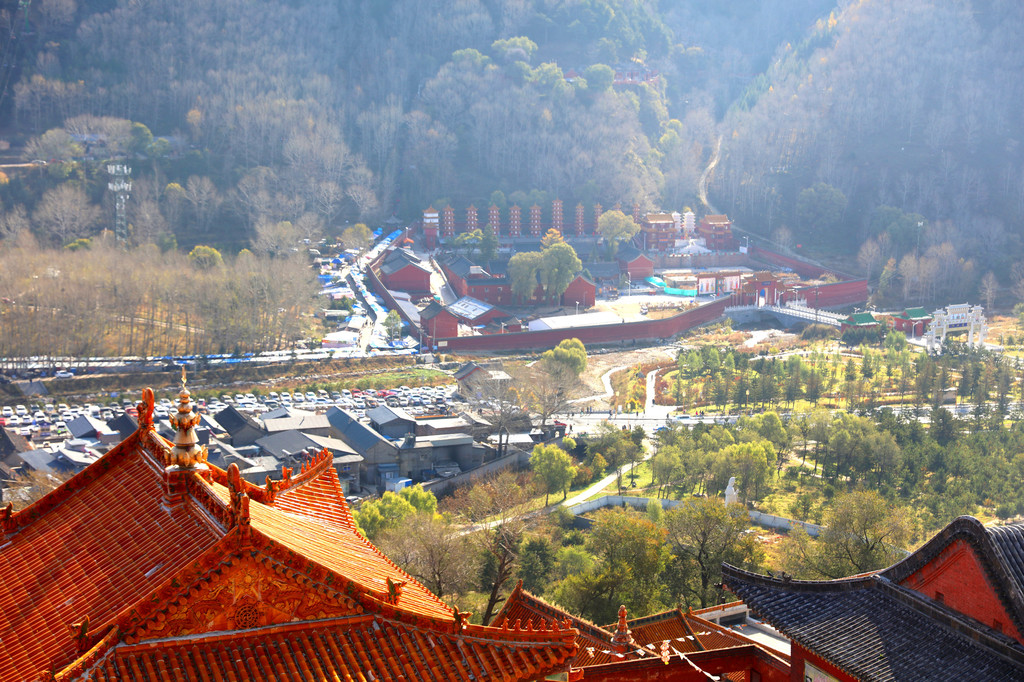 二十多分钟后我们来到后山,眏入我们的眼前的是一片峰岭叠翠,四处披着绚烂纷呈的华彩,此时的云丘山迎来了一年中色彩最为丰富的季节,后山是通往祖师殿和玉皇顶的起点,前往这两处有索道缆车,我们选择了乘索道上最高顶玉皇顶,玉皇顶是云丘山景区内的第一高峰,海拔1629米,也是俯瞰云丘山全景最佳的地方。当我们还乘在索道车内时,随着索道车爬升,车窗外四处已是炫目的色彩,可谓叠翠流金、五彩斑斓,索道车到达半山腰上行终点站,此离玉皇顶还有500多米,一鼓作气我大约爬了40分钟终于到达云丘山最高峰玉皇顶,登山的过程,其实是一个见证沿途美景的过程,也是一次挑战自已意志的过程,行走在这样的地方,清心清肺。玉皇顶上面的庙叫玉皇阁,这是一个长6.4米,宽6.32米,高15米,是一座建在无梁殿上的重檐十字歇山顶的阁楼,四周有汉 白玉 围栏。玉皇阁内供奉的是玉皇大帝、日、月神,此刻我站在视野非常开阔的玉皇顶最高处,云丘大地披着绚烂纷呈的华彩,一碧如洗的蓝天,漫山遍野的红叶,层林尽染,叠翠流金的动人景象愈发明显,远远望去远方三叠式建筑祖师顶,被一片薄薄的淡雾所笼罩,云里雾里犹如仙境,而四周千峰竞秀,峰峰呈奇,壁立千仞,各具特色,秋色中的云丘山融山、石、水、洞、林、草、花、鸟、兽为一体,雄、险、奇、幽、美、妙交相生辉,此时我们这些被污浊空气严重污染的城市人,站在这里,不由得凝神驻足,来几个深呼吸,一吐胸中积郁已久的浊气,再让清新的空气荡涤自己的五脏六腑,吐纳之间,会有一种不可言说的舒畅愉悦。