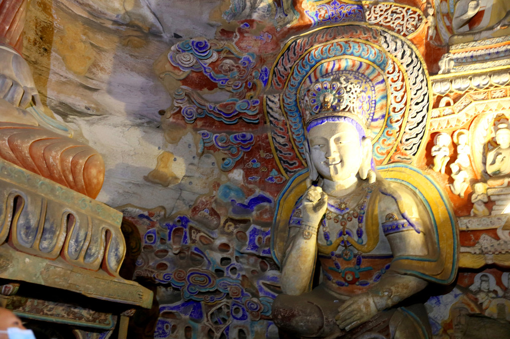 为节省时间,我们先购买了电瓶观光车票,乘车直接来到了石窟群前,这里才是我们来大同的主题,如我们想法一样,大部分人也是奔这里而来,因此石窟前,人头攒动,全是游客。云冈石窟分早期石窟、中期石窟、晚期石窟,中期石窟是云冈石窟雕凿的鼎盛阶段,这些石窟雕凿结构复杂、色彩华丽、内容丰富,呈现了北魏的繁荣鼎盛,反映出石窟艺术中国化的发展,我们开始观览的第一窟正是云冈中期石窟首窟,我们依次从第一窟至第十三窟走马观花一、一打卡,这些雕刻精美的弥勒、挺拔健硕大佛、工艺精美的楼阁式佛龛、色彩丰富的各类雕塑,虽有自然风化剥蚀和人为破坏(文革时期破坏的最厉害),但仍给我们留下了深刻印像,跳过未完成的第四、十四、十五窟,我们来到了第十六至二十窟,这些虽属最初开凿的早期石窟,但高僧昙曜将帝王之相融入其中,充满了磅礴气势,因此被称之为“昙曜五窟”,特别是露天的第二十窟的释迦坐像,高13.7米,佛像面部丰满,两肩宽厚,造型雄伟,气魄浑厚,为云冈石窟艺术的代表作,也是公认的游客打卡地,原则上石窟内部是禁止摄影的,但和敦煌莫高窟相比这里执行得宽松的多,所以在云冈石窟内把这些精美的雕像留在脑海里和照相机、手机里的现象基本同时存在。