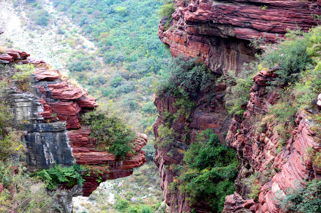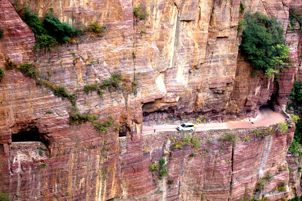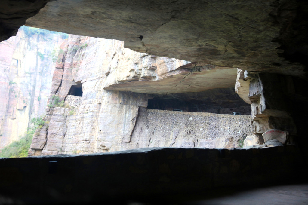 现在进出郭亮村除了挂壁公路,又新修了一条位于挂壁公路峡谷对面的盘山公路,进出郭亮村实施单向通行,白天开车离开郭亮村只能从这条公路出村,而位于公路边的崖顶观景台,是观赏郭亮挂壁公路全景的最佳处,我们在离开前站在崖顶观景台从远处细细地欣赏这挂壁公路全景,一条外宽内窄的喇叭形峡谷在眼前展开,在观景台左侧是峡谷的尽头,郭亮村就位于峡谷尽头的悬崖上,崖下有一小瀑飞泻,而在观景台右侧,峡谷向外呈喇叭状延伸,只见对面山体分为上下两段,上半部是浅黄色的石灰岩,峰顶尖峭,直插蓝天,下半部则是赤壁丹崖的红色砂岩,陡立百米,岩顶平坦,并不断向峡外伸展,这就是红岩大峡谷,绝壁长廊之中的郭亮洞,蜿蜒盘旋、隧道窗洞上方的百丈绝壁如刀削斧劈一般,绝壁上的山体则郁郁葱葱,植被繁茂,而山腰以下都是垂直90度到底的悬崖峭壁,岩石裸露,寸草不生,这一层高达百米的赤壁丹崖,仿佛给大山围上了一圈红腰带,站在这里远晀挂壁公路上步行进村的游客犹如蚂蚁般地在蠕动,而偶尔行驶经过的车辆就像玩具一样慢慢移动,一会儿露出,一会又消失。透过峭壁边烟云眺望,峭壁上面民居和层色分明色彩浓烈的远山,如世外桃源般令人着迷。