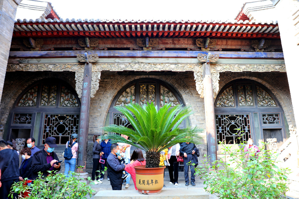 我们购票进入王家大院,王家大院由高家崖建筑群和红门堡建筑群组成,我们首先来到的是高家崖建筑群,这里是由十七世王汝聪、王汝成兄弟共同修建于嘉庆元年(1796年)到嘉庆十六年(1811年)间,面积19572平方米,大小院落35座,房屋342间,主体建筑严格按封建等级制度建造,结构上继承了我国西周时已形成的前堂后寝的庭院风格,装饰上以砖、木、石三雕为主,题材繁多、内容丰富,集中展示了中华民族深厚的文化底蕴和王氏家族独特的治家理念,主院敦厚宅和凝瑞居皆为三进四合院,每院除有高高在上的祭祖堂和两旁的绣楼外,又都有各自的厨院、家塾院,并有共用的书院、花院、长工院、围院,周边堡墙紧围,四门择地而设,大小院落既珠联璧合,上下左右相通的门多达65道,又独立成章,宅院里的砖雕、木雕、石雕题材丰富、技法娴熟,大量采用了世俗观念认可的各种象征、隐喻、谐音,甚至禁忌的艺术形式,在文人、画家、雕刻艺人的共同参与下,将花鸟鱼虫、山石水舟、典故传说、戏曲人物或雕于砖、或刻于石、或镂于木,体现了清代建筑装饰的风格,又将儒、道、佛思想与传统民俗文化凝为一体,同时,宅院的居室依旧保有北方民居“坚固、实用、美观”的风格,建筑结构和装饰质朴却精巧,后院则采用窑洞式建筑,看着非常接地气。