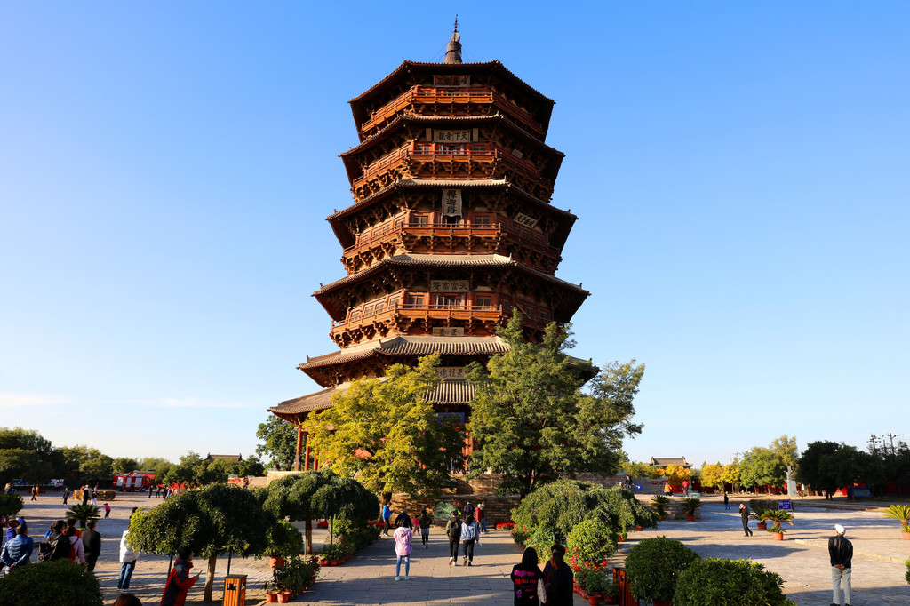 十月四日我们离开石家庄前往山西,正式开启了山西自驾游,当天我们选择晚上住宿地是晋北的大同,中途经过浑源时我们先顺路游览了恒山悬空寺,从石家庄至恒山悬空寺景区行驶时间大约四个半小时,我们早上八点半从石家庄出发抵达悬空寺附近已是下午一点,山西省从今年8月1日开始至12月31日景点门票免费,但限于工作日,双休日、节假日不免,因此我们预订了悬空寺首道的十五元门票,如登临悬空寺则另需登临费一百元,这个不管工作日还是节假日都不免费,和我二十多年前来时,悬空寺除了周边环境比原先稍有了些改善,管理上还是不敢苟同,悬空寺景区门口明明有修了很大的停车场,而且停车场上空荡荡停了没几辆车,可当地不知什么原因在几公里外就设卡拦车就是不让自驾车辆驶入,而如步行进去需花费很长时间,没办法我们只能停在了一处私人临时拦起的一路边停车场,然后再搭乘当地人的黑车前往悬空寺景区,浪费时间不说,安全上也存在很大的隐患。因为节假期间,排队登临悬空寺的游客很多,悬空寺属保护性开放,实行限流,每一批放八十个游客,因此看眼前排队的游客最起码要等二至三小时再能登临,我们没耐心等候这么长时间,也就省了一百元登临费,看了悬空寺外观后匆匆离开了。从悬空寺景区出来,才下午三点,旁边有车可去恒山景区,因为我曾去过,知道恒山虽为五岳之一,在五岳中无论是人文景观还是自然景观都存在感、观赏性都不强,一商量决定放弃,而是我们去了离浑源五十多公里外的应县看木塔,对于喜欢看古建筑的人来说,应县木塔还是值得一看的。