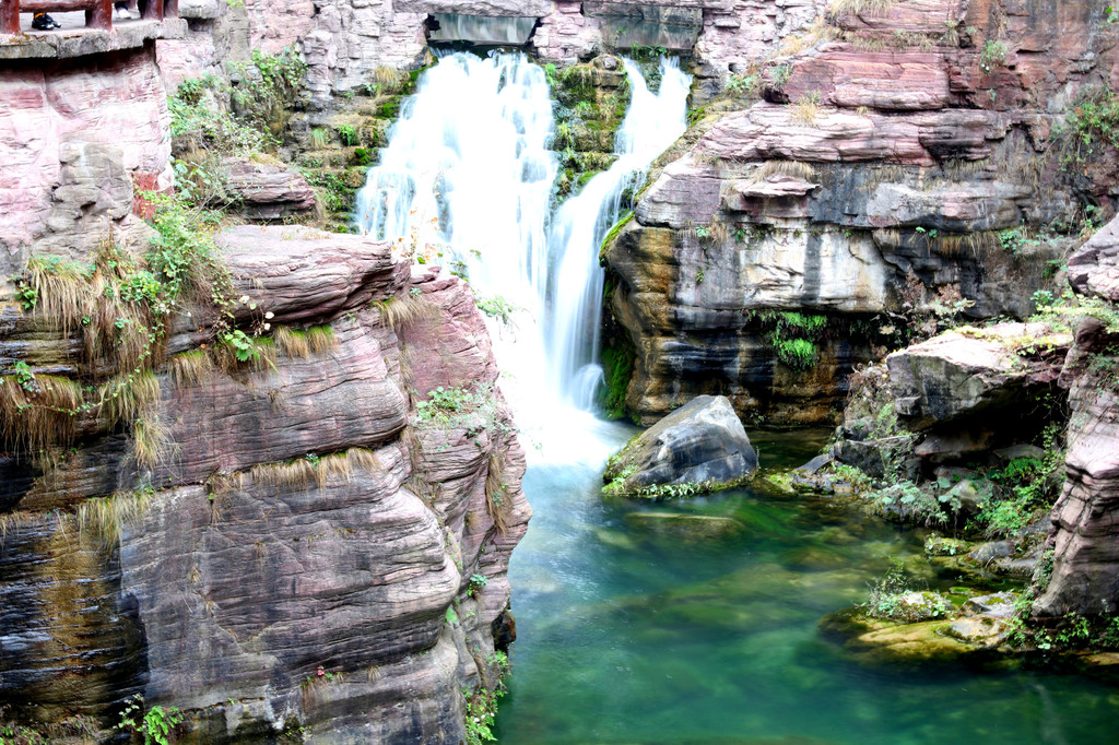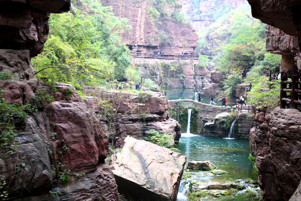当我们步入红石峡景区,站在高处往下看,石红水绿,潺潺流水、流泉飞瀑,栈道缠绕在山腰,远远望去,像极了一件精心制作的山水盆景,它又像一块无瑕而绮丽的翡翠,墨绿欲滴,让人赏心悦目。我们沿着弯弯曲曲的栈道,走到峡谷中,危岩犬牙交错,仅余中间一条窄窄的缝隙,四周红岩绝壁构成的岩层成水平状层层叠叠,红石峡真正是名符其实,人行走在半山腰的栈道中,上不见天日,下不见谷底,刚才走过的一线天桥正在头顶上。走进一座山谷,面前豁然开郎,两边崖壁后退,围出谷底一池碧潭,一座红色小石桥横卧潭口,桥洞下泻出两道白练,特别醒目显眼,穿行在红石峡,层层叠叠的瀑布群,泉水潺潺、飞珠溅玉,壮观的气热磅礴,温柔的低吟浅鸣,皆是一幅幅美丽的画卷,在缺水的北方地区这少有的潺潺流水,构成了中原大地上最精致美丽的山水,我们跟随着游览大军一路欣赏具有北方雄浑大气的山水画廊,碧水丹崖一体,山水相映生辉,溪流碧绿如玉,丹崖分外红艳,行走其间,你会自然而然的惊叹,这世界的创造力,触摸着层层叠叠的石头,仿佛能感受到千万年来,时间和风雨赋予它们的力量, 巍巍太行,既有雄壮而苍茫的红崖绝壁,又有妙曼而又秀雅的山水风韵。红石峡的行程虽不长,但双崖对峙的峡谷群和各种动态的瀑、泉、溪、潭,共同构成了丰富的“云台地貌”美丽景观。我们一路行行摄摄,用了将近二个小时后我们走到了红石峡尽头,左拐上山,登上崖顶,看到一座水库的大坝高高耸立,原来这里就是红石峡中所有水源的源头“子房湖”,登上坝顶,子房湖碧波荡漾,这子房湖的“子房”是汉代名相张良的名号,当年张良曾在此隐居,原本这里就有自然湖泊,因为修了大坝,水库就变成了湖,有山则名、有水则灵,红石峡因为有了子房湖,组成了壮丽的山水奇观,也诠释云台仙境的完美。此刻虽已时近中午,湖畔高耸的山峰仍笼罩在大雾之中,而云台山主峰茱萸峰在我们乘车离开景区仍是云里雾里间,虽然我们只是仅仅游玩了云台山风景区其中的一小部分,但红石峡之旅还是给我们留下了美好的印象。