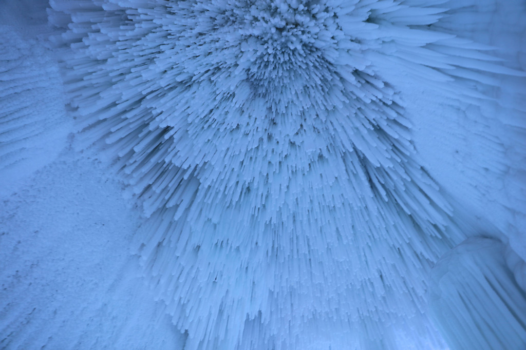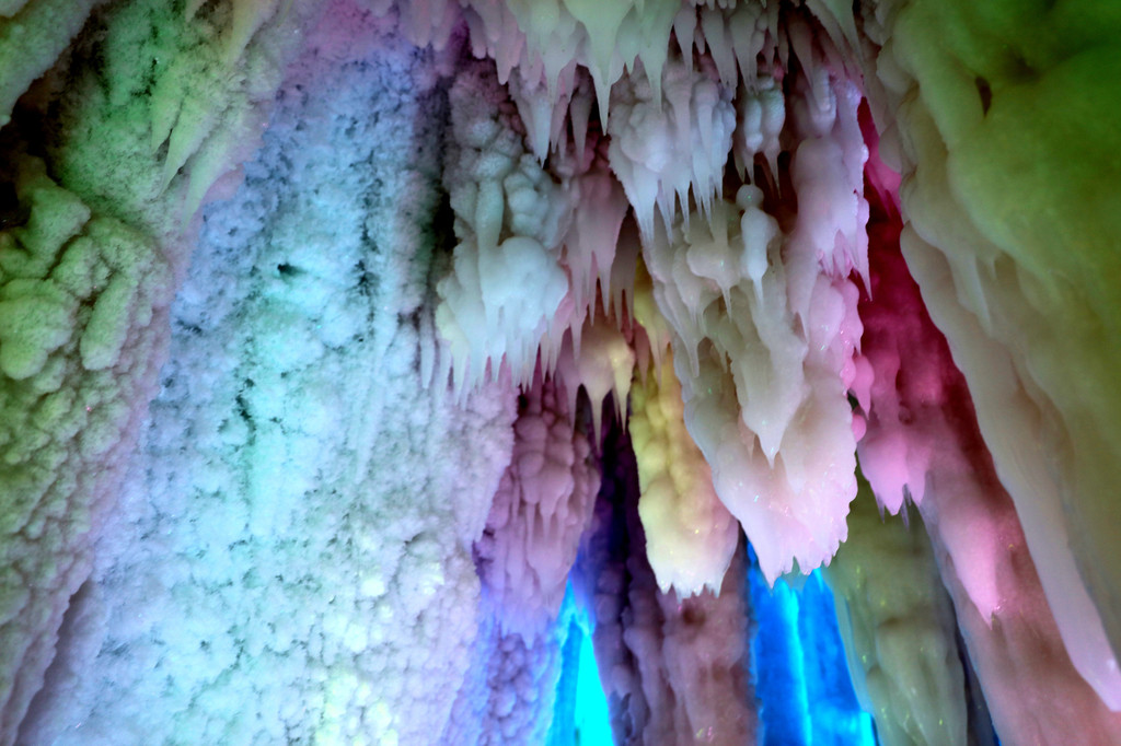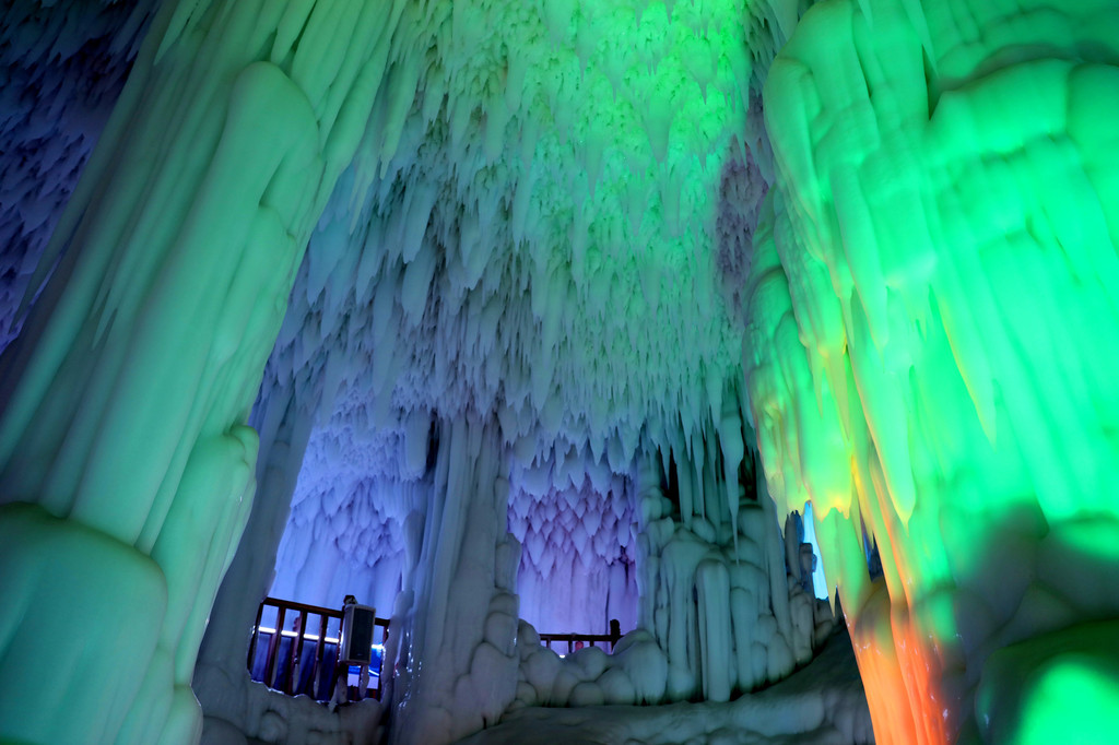 云丘山冰洞门票不在免费之列,花一百二十元门票钱,在入洞口穿上免费提供的羽绒服及安全头盔,进入目前开放的1号冰洞,一走进冰洞一股寒气迎面而来,冰洞内一年四季温度始终保持在-4°C以下,而映入我们眼中的是美轮美奂的冰柱、冰笋、冰钟乳、冰石花,沿着脚下是木栈道、四壁结冰的洞体小心翼翼往里走,冰洞里挺立着巨大的白色冰柱,里面是一座天然的大厅;顶上倒悬的冰锥沐浴在暖色的光影里,活脱脱一顶天然灯罩,人们被包围在冰的世界里,沿着木制栈道盘旋而上,中间是一座冰的宫殿,透过冰柱间的缝隙,宫殿的那一侧,是一扇扇不规则的窗户,不同的灯光从窗户里透出来, 冰洞里不时闪烁着各种各样的灯光,姹紫嫣红的交替着,犹如行走在童话世界里,冰洞群洞腔相互贯通,有上下三层,犹如迷宫股的洞内总长199米,最宽处有12米,最高有15米,我们置身其中,有时仿佛立于美轮美奂的广寒宫,有时又似潜入金碧辉煌的海底龙宫,由衷感叹大自然的鬼斧神工,无论从哪个角度望去,都是冰的世界;各种形状会在人的脑海里出现,似针、似笋、似柱、似乳,似帘、似幕,……千奇百怪,形态万千,这些沉淀了数百万年天然冰体,配上五颜六色的灯光,随手一拍都是大片,绝对是一场视觉上的饕餮盛宴,相比于我之前去过的冰岛瓦特纳冰川冰洞,云丘山冰洞无论从冰洞的大小小,冰柱形状的多样性,丰富性,冰洞内的观赏性完胜于它。