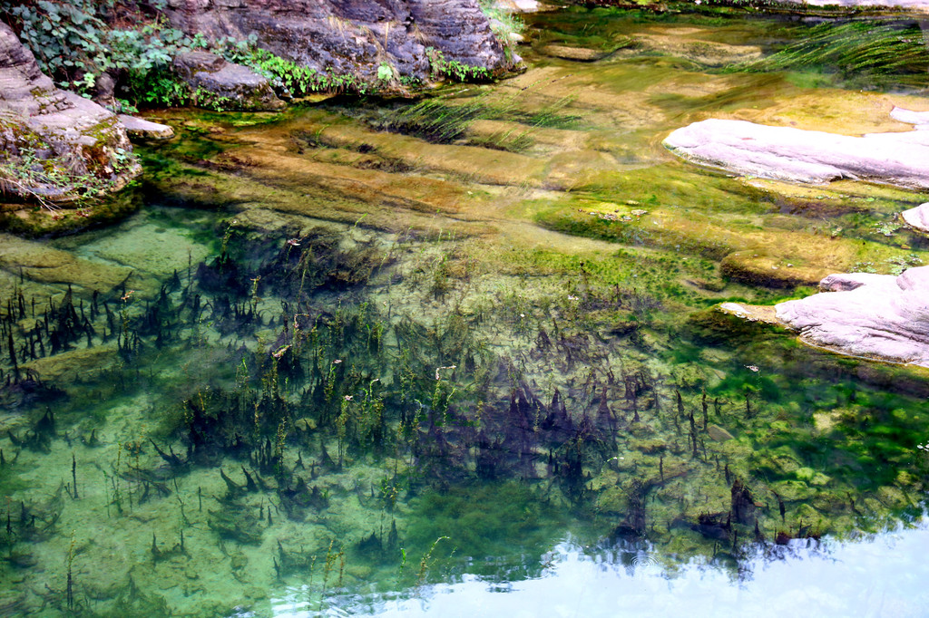 来到丹分沟,此刻四周就我们一辆车,站在高处欣赏着大峡谷的美景,周围是群山相抱,不断传来谷内哗哗的流水声在作响,风景秀丽,环境幽静,看到有一往下的栈道,一路走下去,两旁高山耸立,紧紧夹着一条不是很宽的峡谷,跌宕起伏,身姿犹如一条长龙,贴着谷底,蜿蜒顺流而下,谷内地势险要,如果不是人工沿着山势铺设了一条人行栈道,会令人望而生畏,是无论如何走不进来、也下不去的,我们一边欣赏着天然的自然风光,一边穿越着沟壑从横,岩壁天桥的险境,体会到峡谷带来的雄、壮、奇、幽、峻于一体的美景。看地图指示牌显示丹分沟向前可与龙潭沟相连,看沟中崖上有一条飞瀑高挂的痕迹,可惜干涸了,而此峡谷中耸立的奇峰是一种被称之为崩塌峰林的地质景观,看着空无一人的栈道,估计走到龙潭沟不近,而且我们的车还停在这里,最终我们放弃了徒步,选择开车离开。